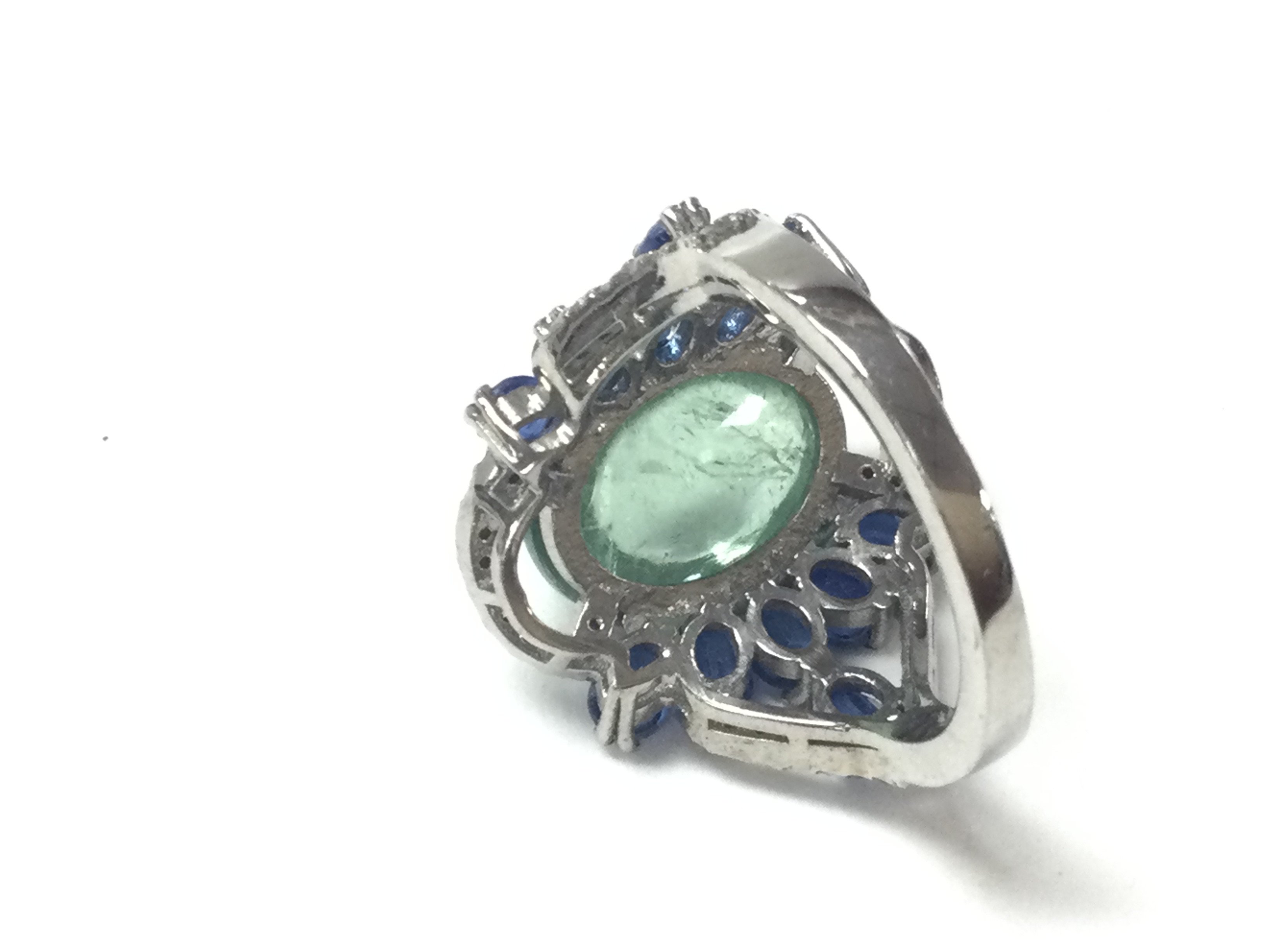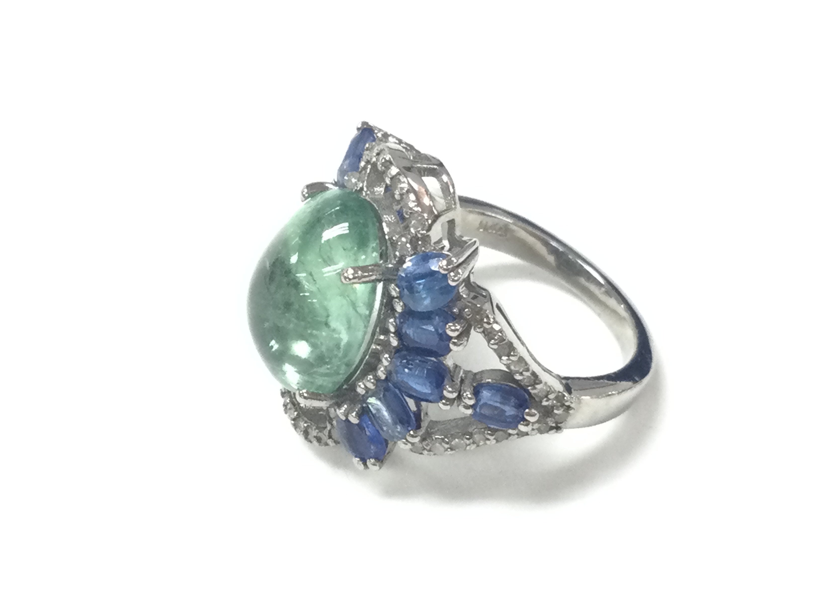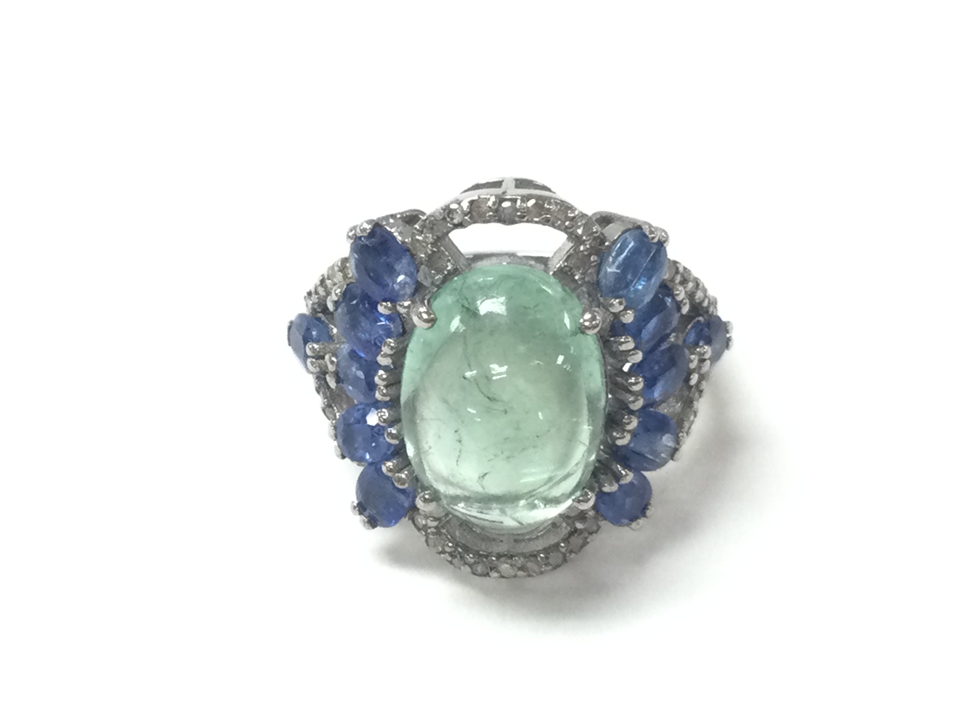 A large cluster ring in silver set with an oval cabochon tourmaline surrounded by oval kyanite and diamonds. Tourmaline 7.33ct Kyanite 3.09ct and diamonds 0.36ct approximately. Size N 1/2 Postage A