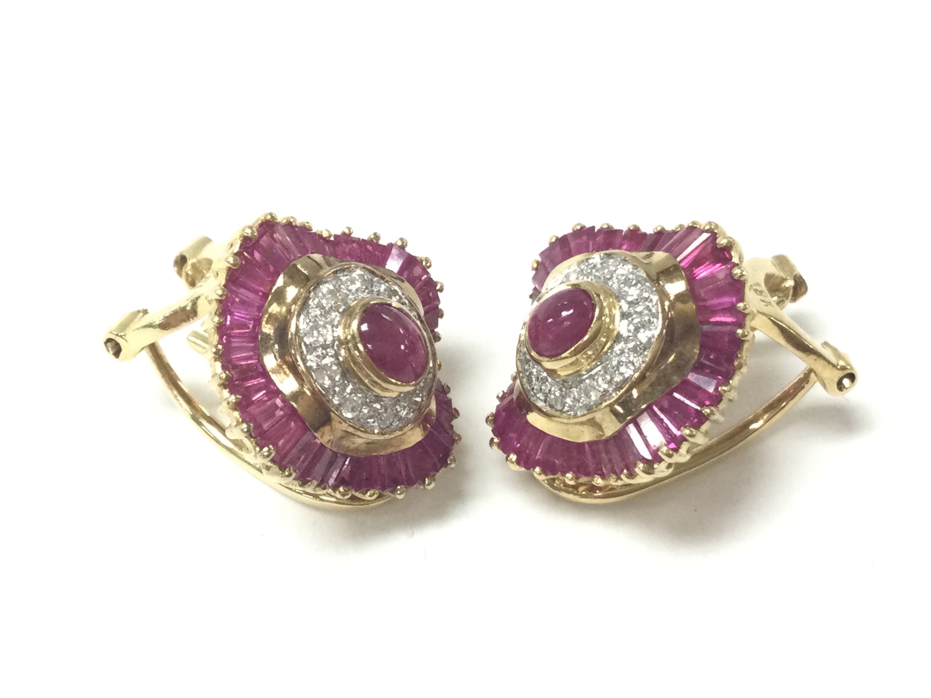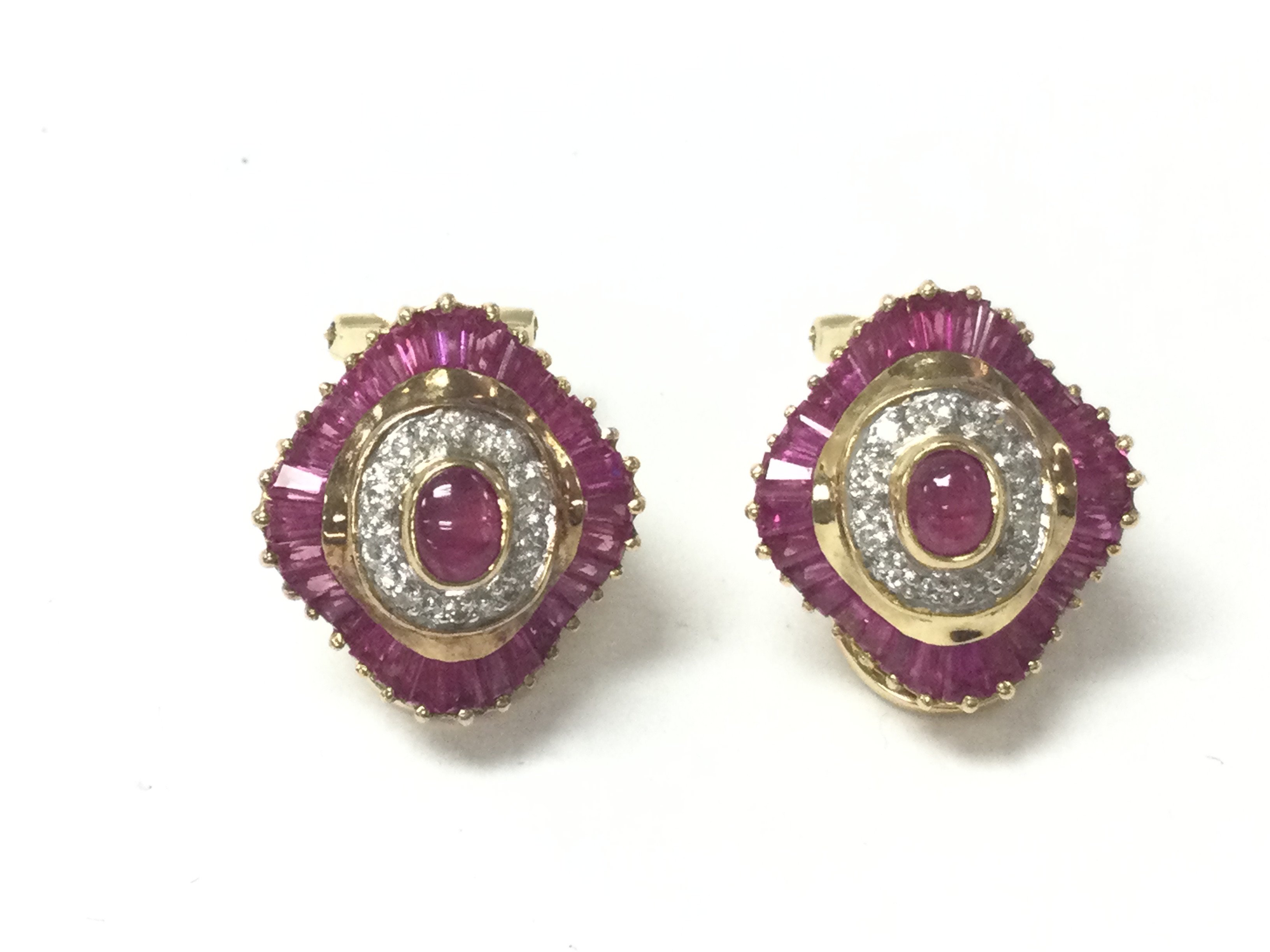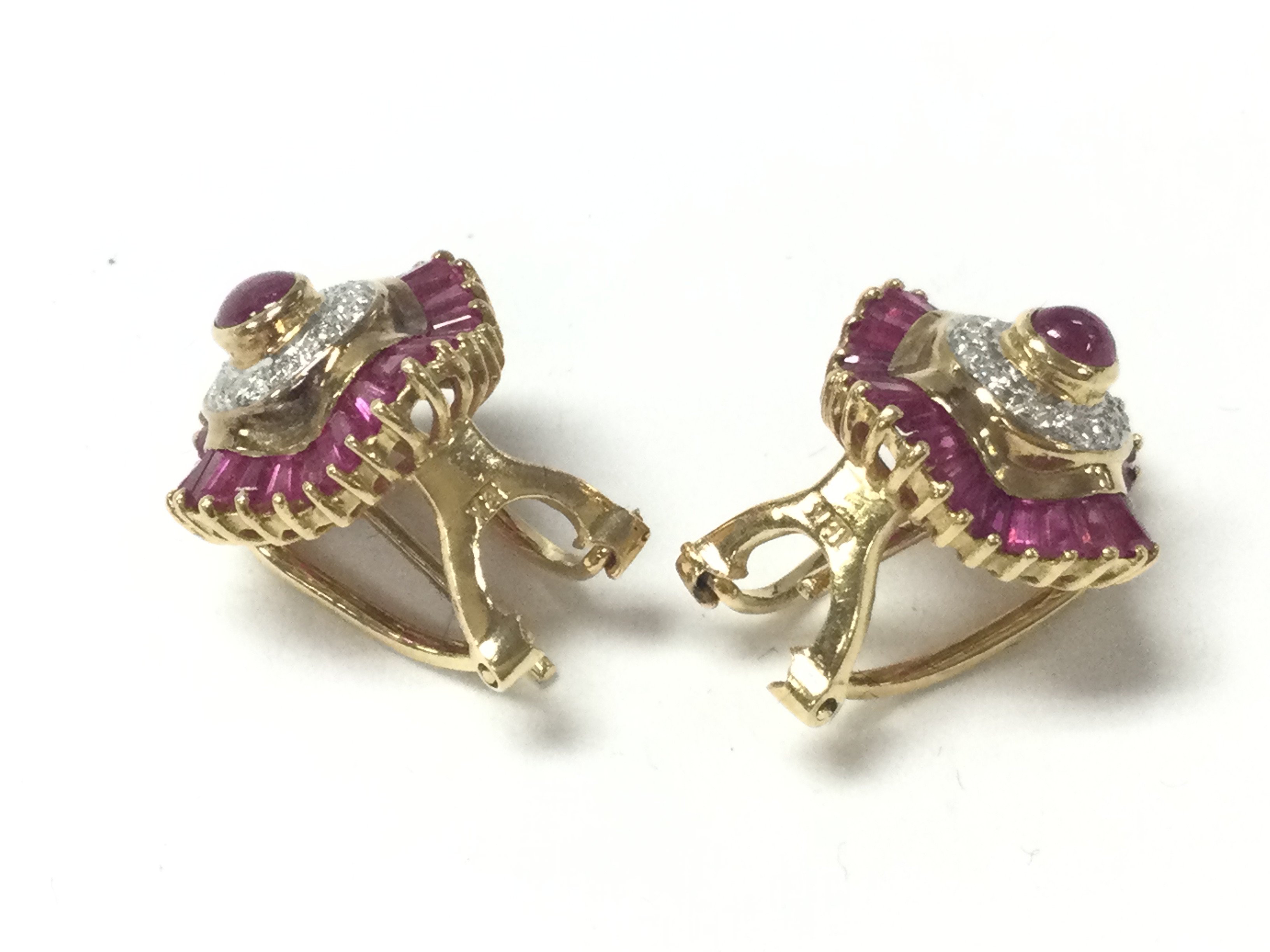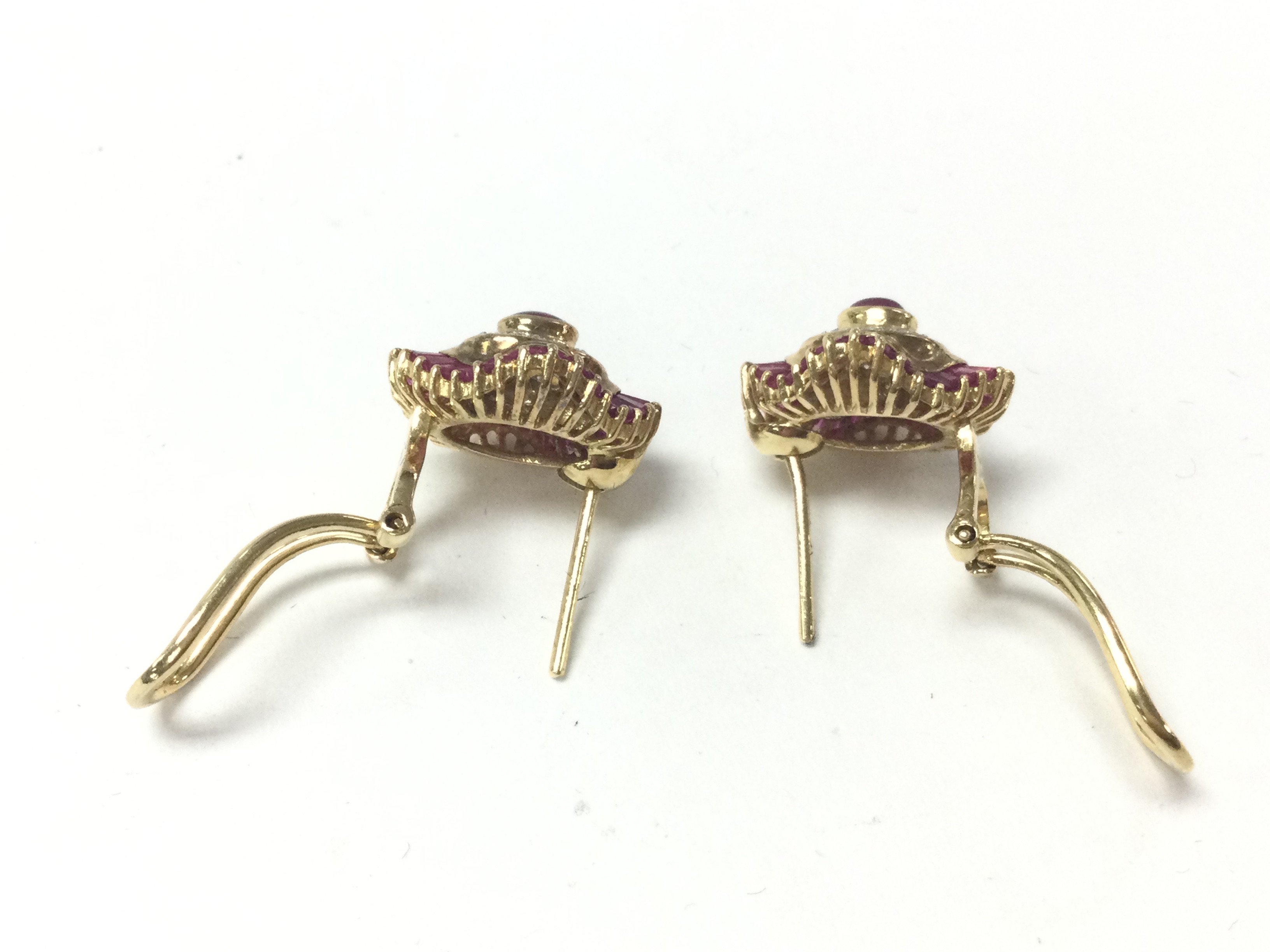 A pair of 18ct yellow gold ballerina style stud earrings set with central cabochon rubies surrounded by RBC diamonds and rapered baguette and calibre cut rubies. Rubies 2ct and diamonds 0.40ct approximately. Postage A