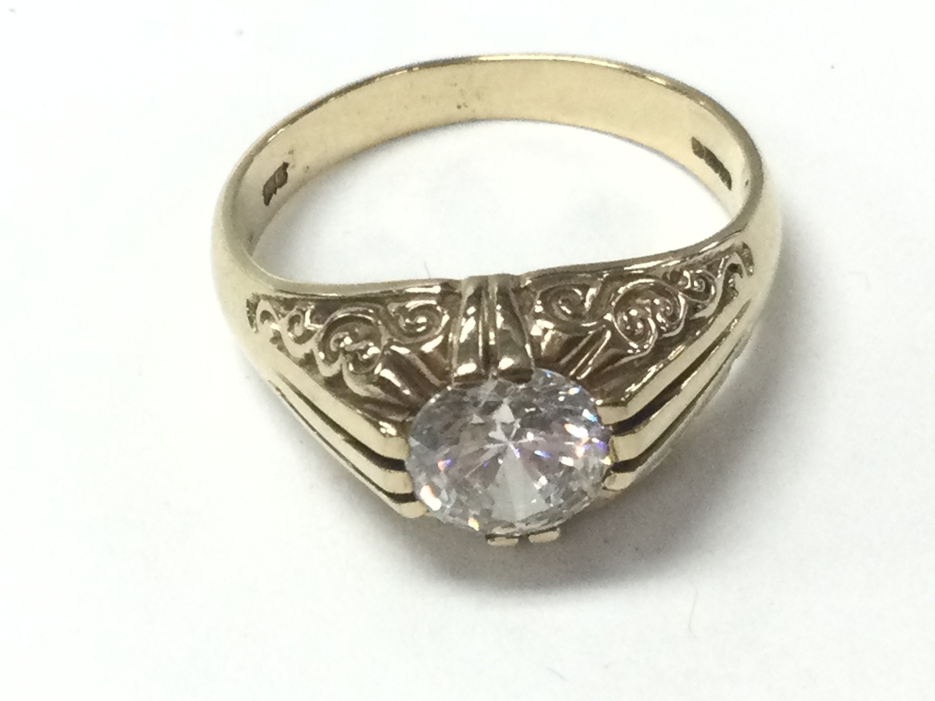 A 9ct yellow gold gents style ring set with large round cubic zirconia with patterned shoulders. 5.7g and size U. Postage A