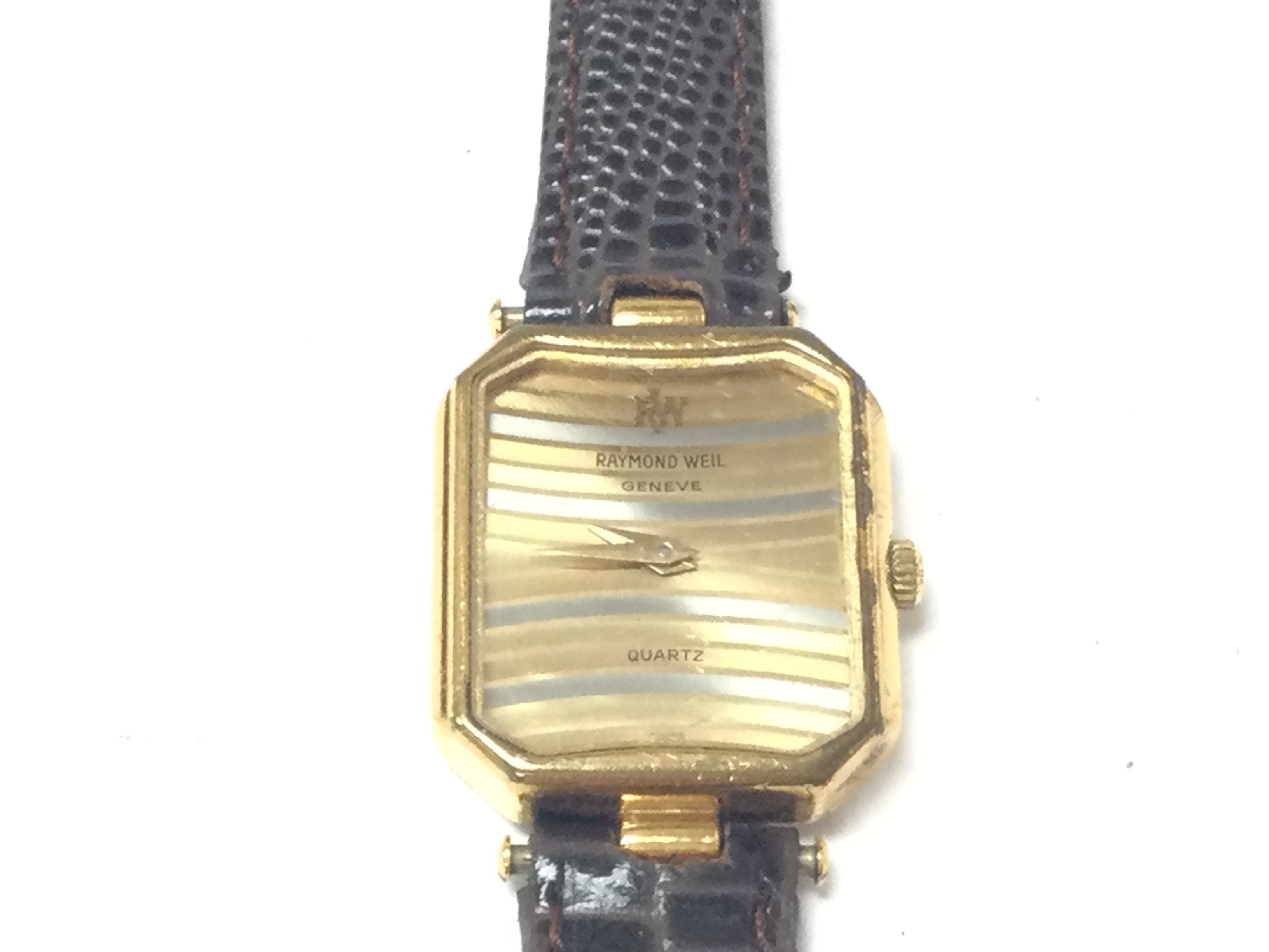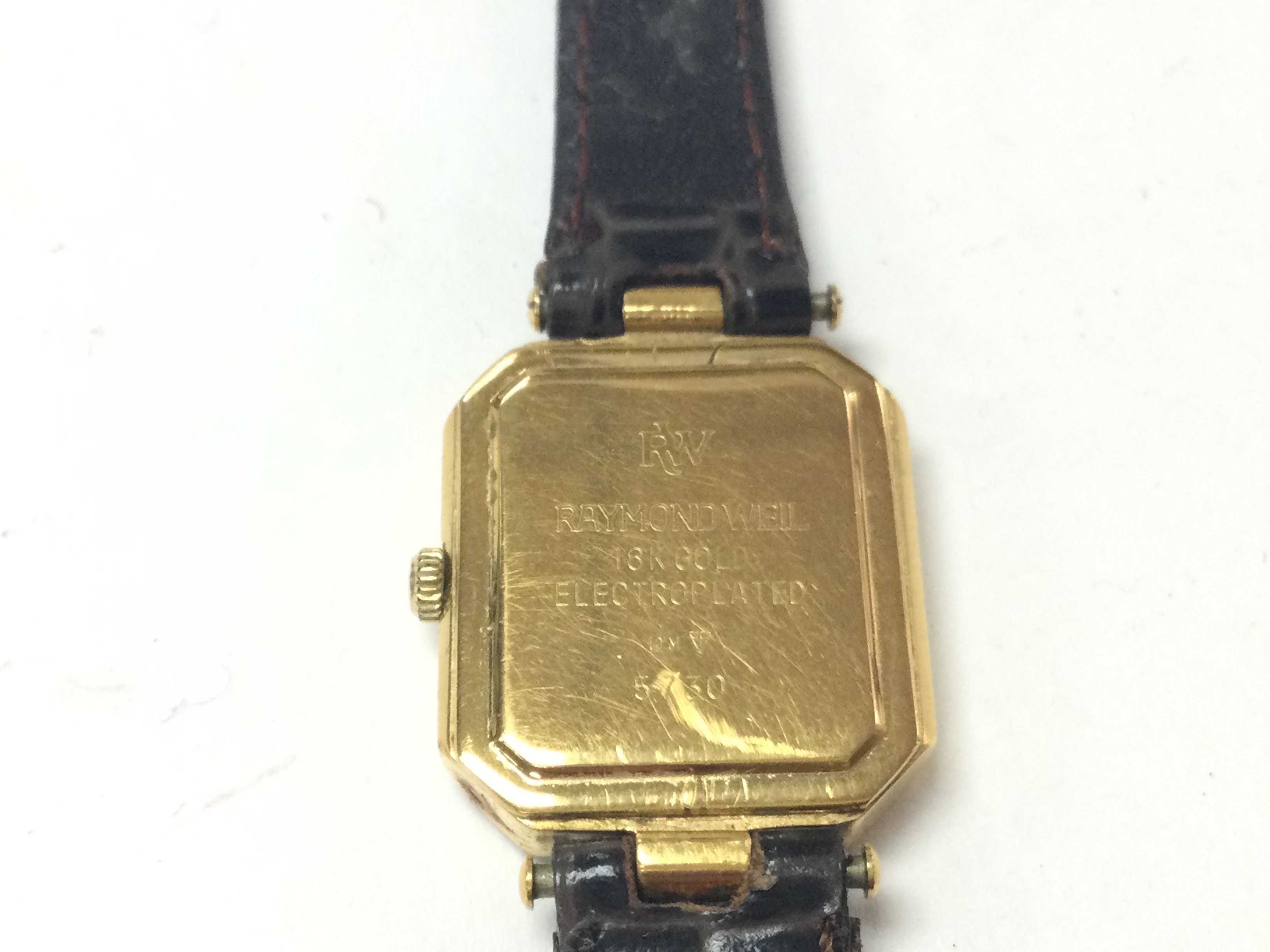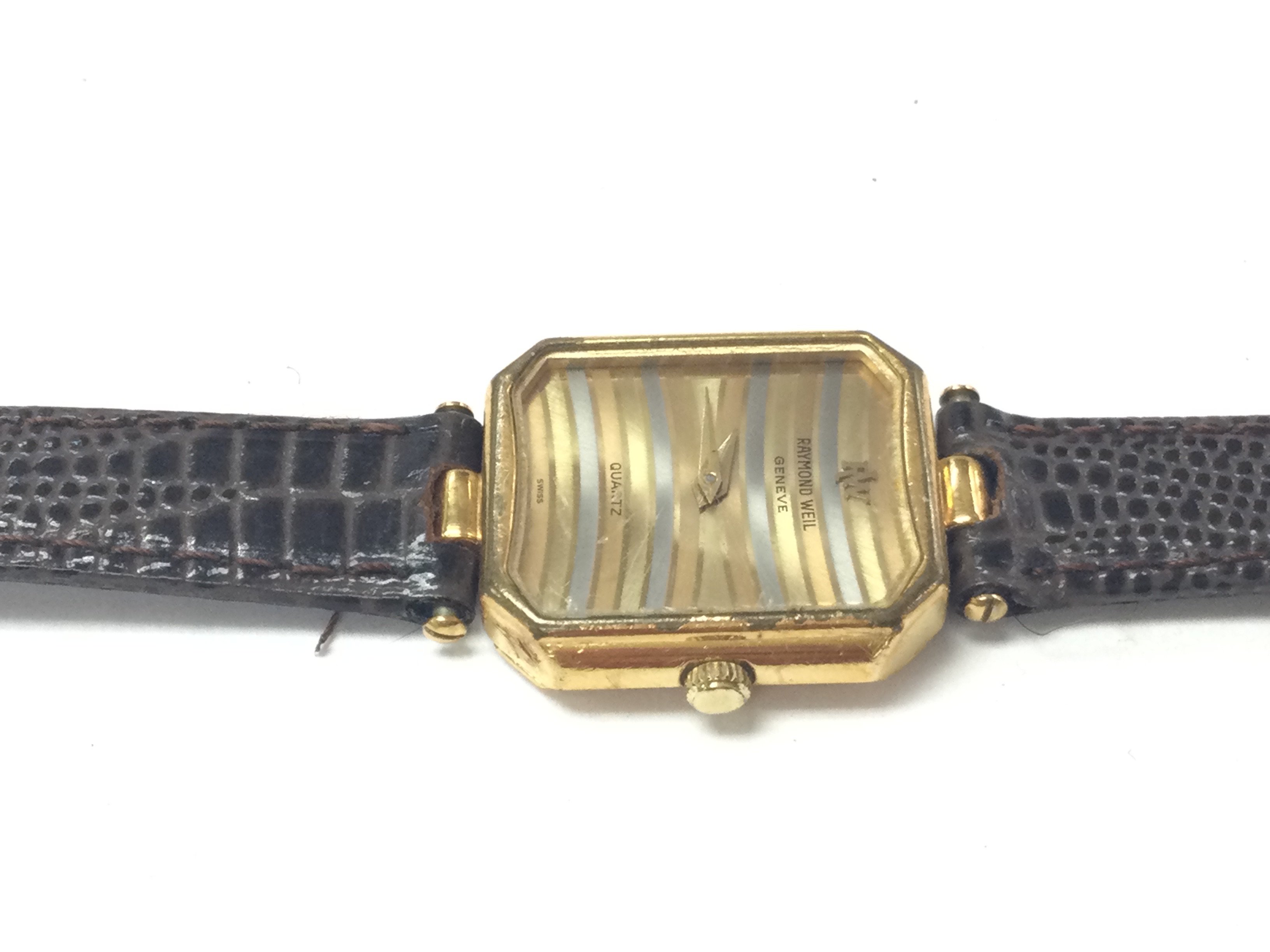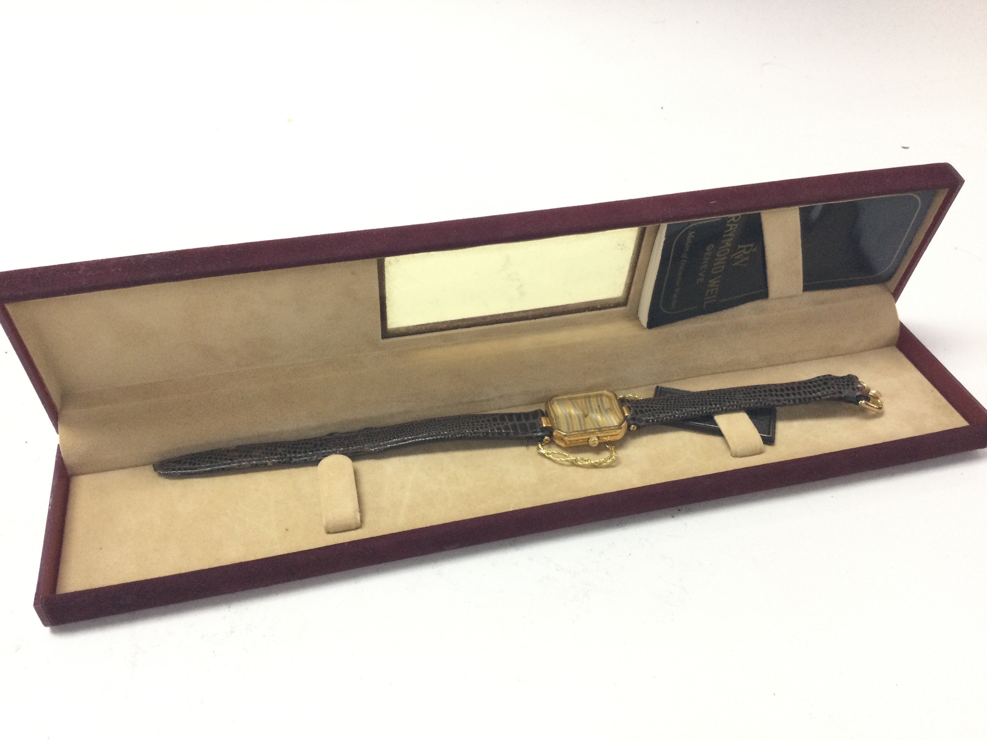 A vintage Raymond Weil tri colour ladies watch with box and papers. Model 5730 quartz movement (no seen running) 18ct gold plated. Circa 1970s.Postage B