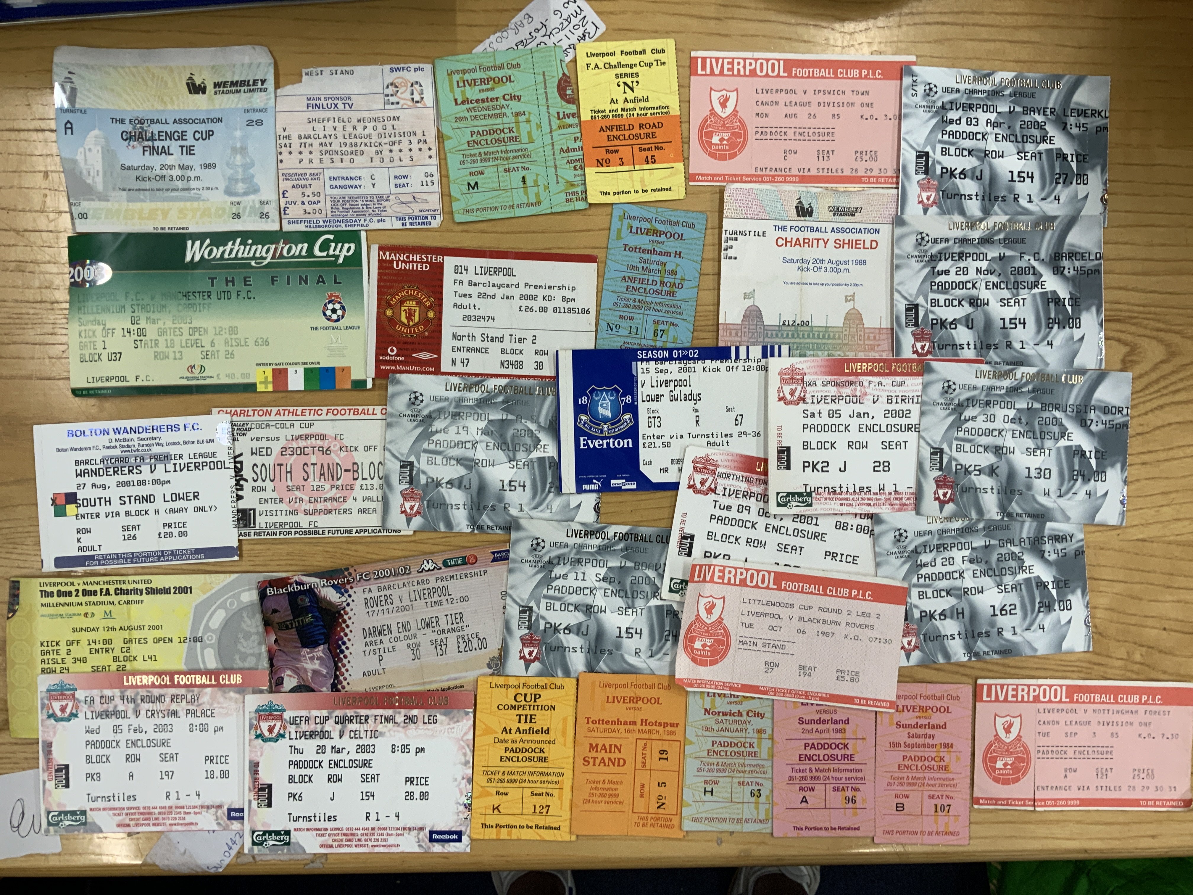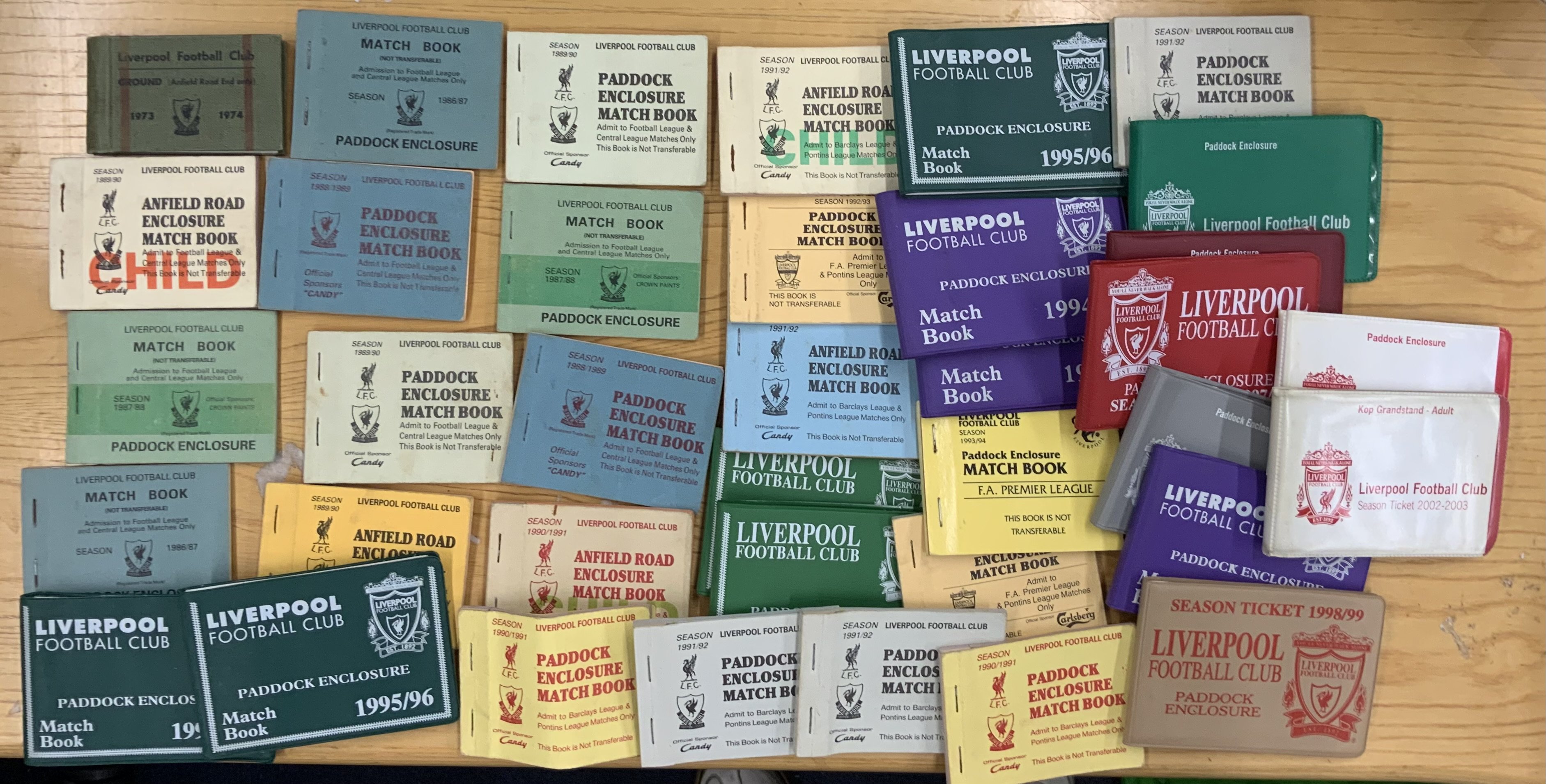 Liverpool Football Ticket Collection: 37 season tickets from 73/74 and then a near complete run from 86/87 to 98/99 plus duplication. C/W 30 tickets from the mid 80s to the early 2000s including big match.