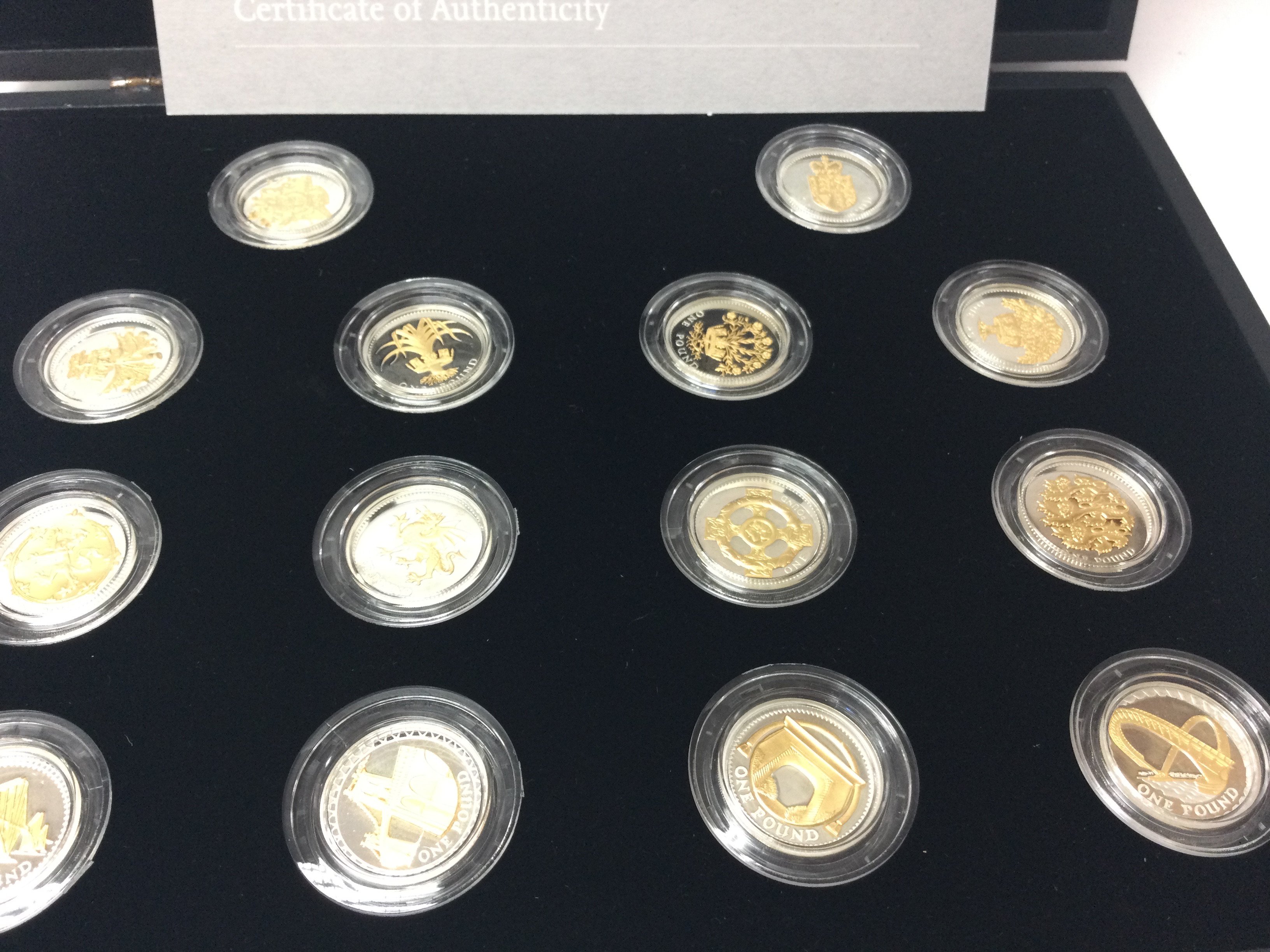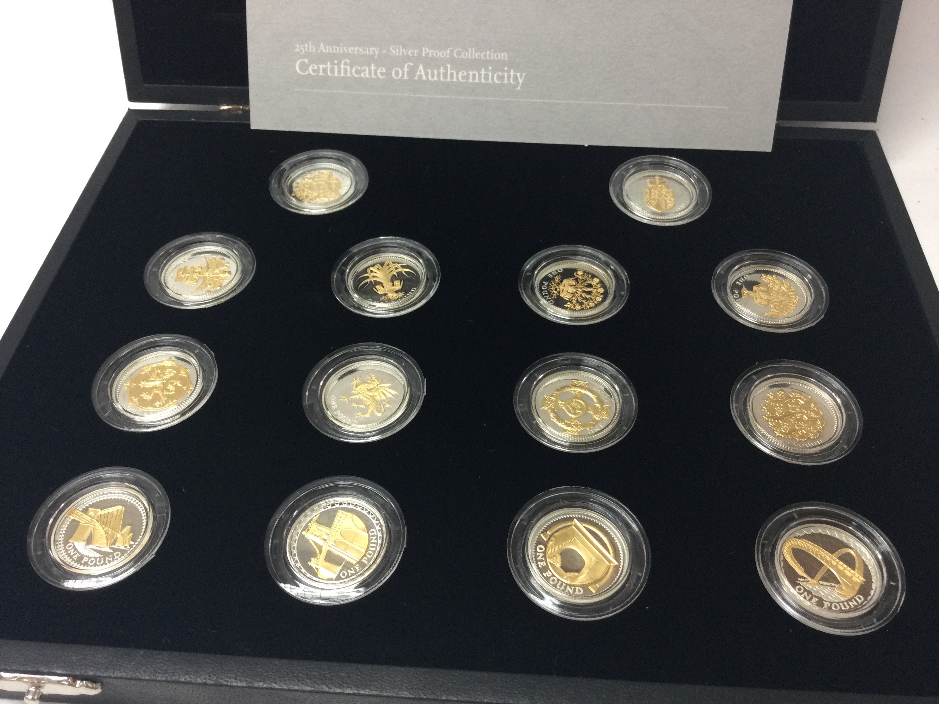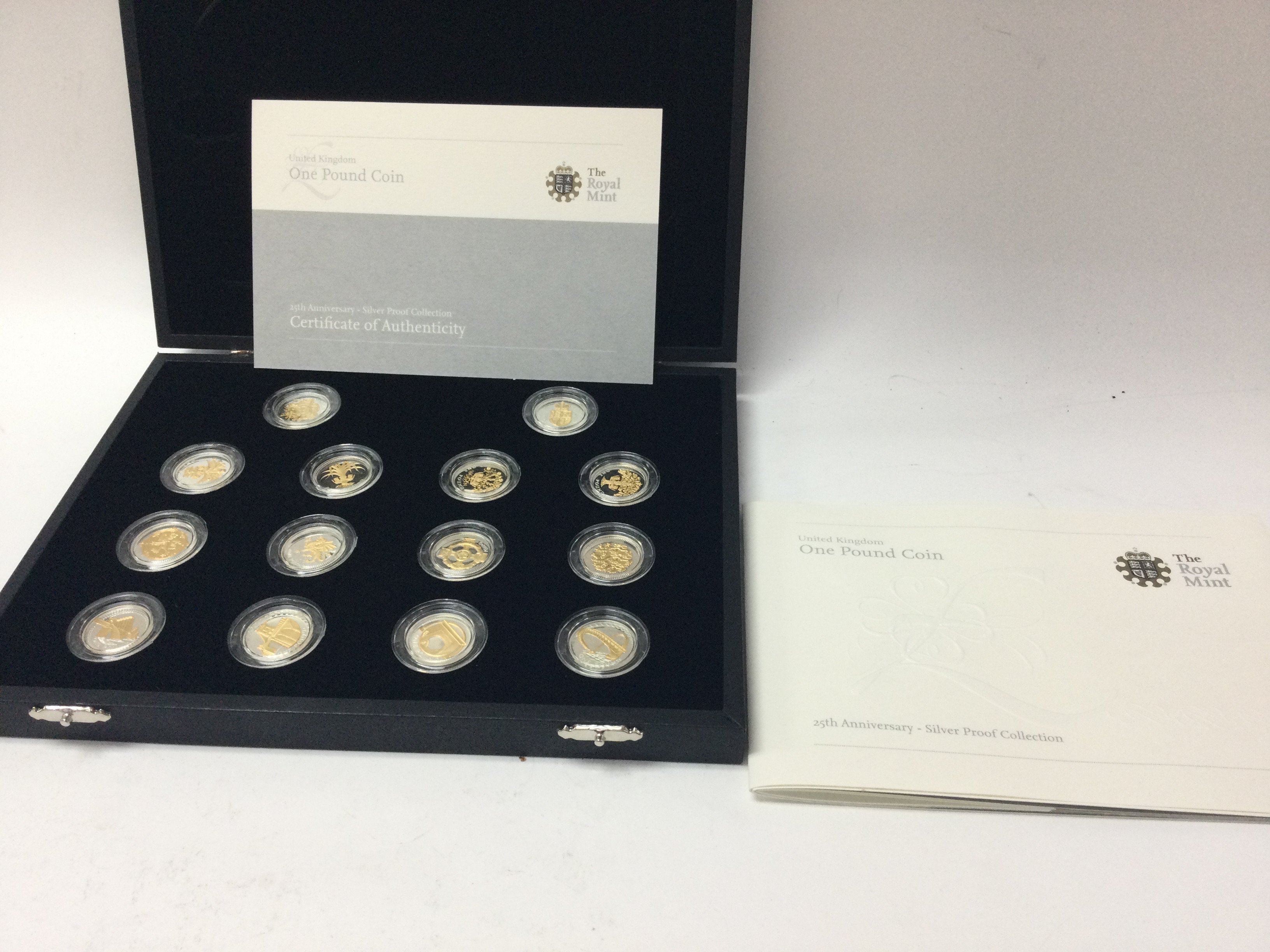 A royal mint 25th anniversary silver proof £1 coin collection with COA. Postage B