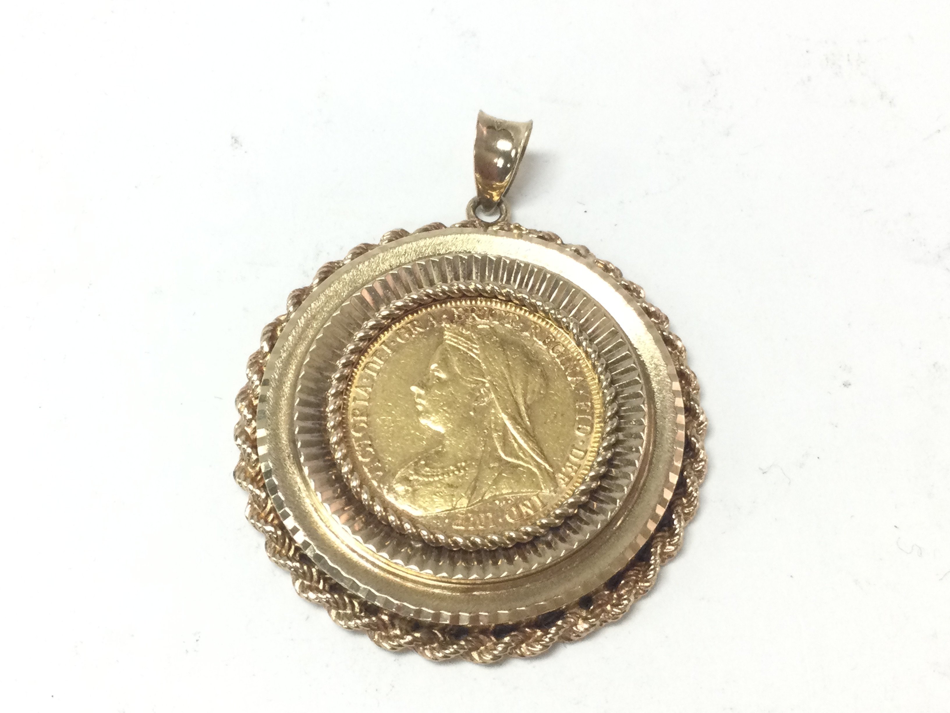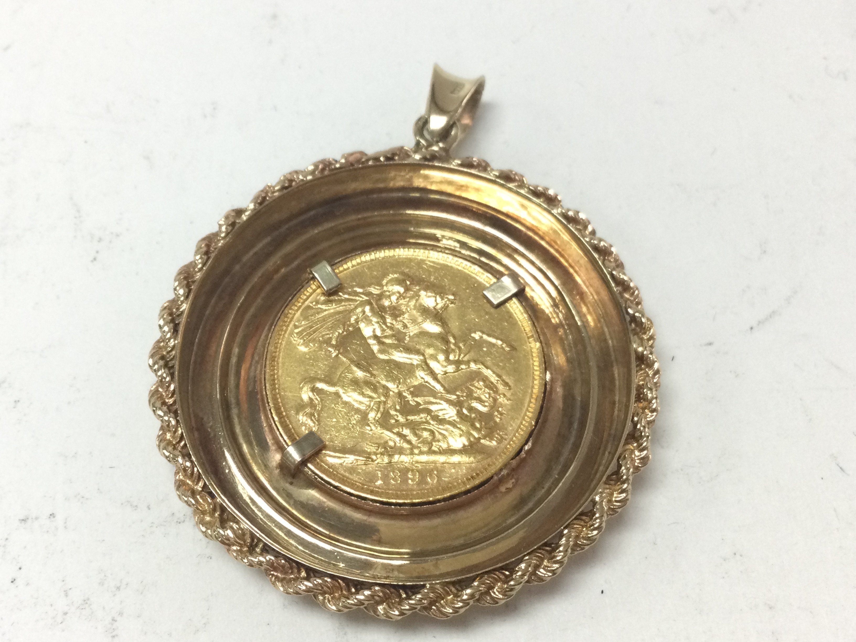 A 1896 full sovereign in a 9ct gold pendant mount. Total weight 16.59. Postage A