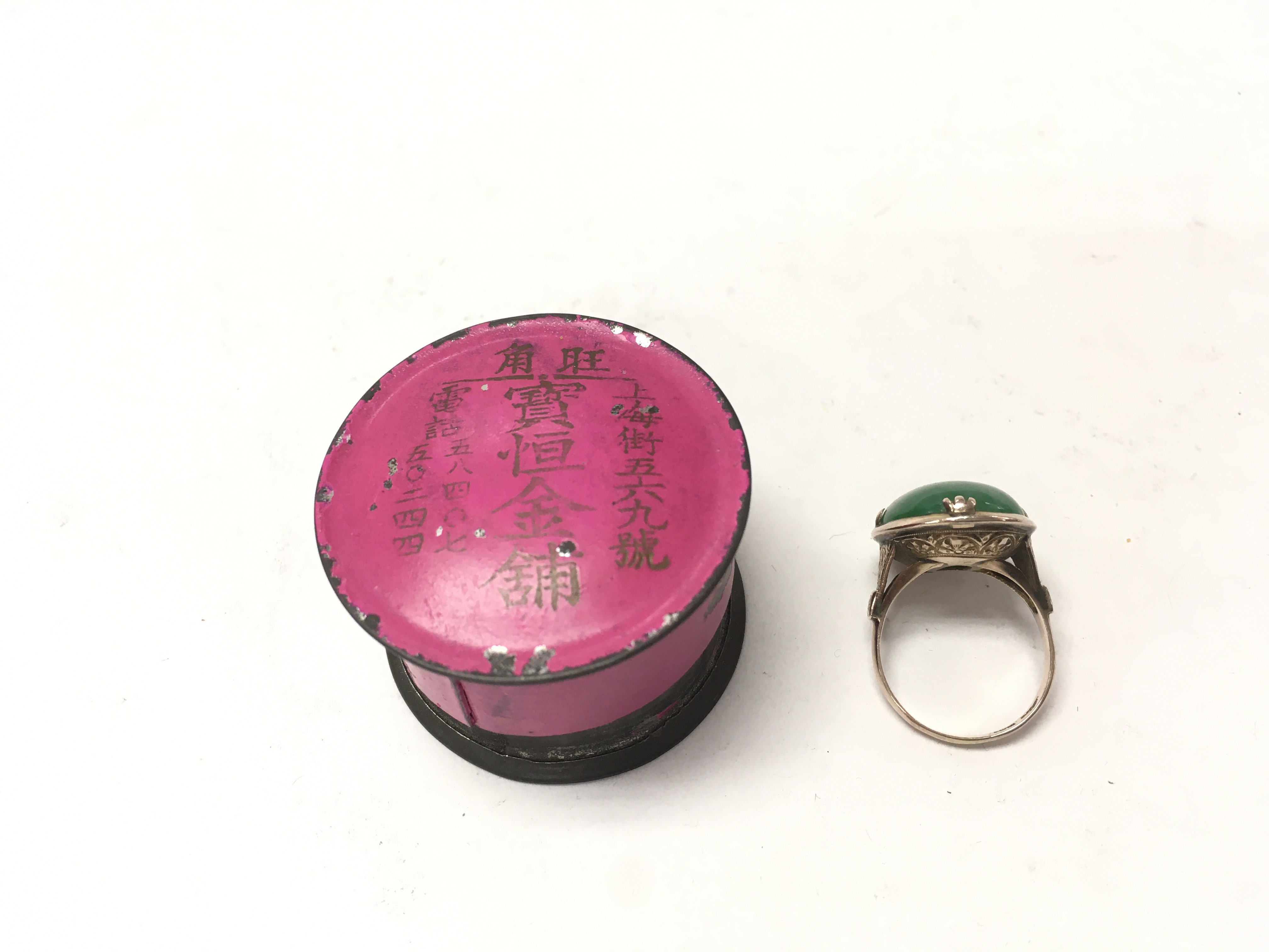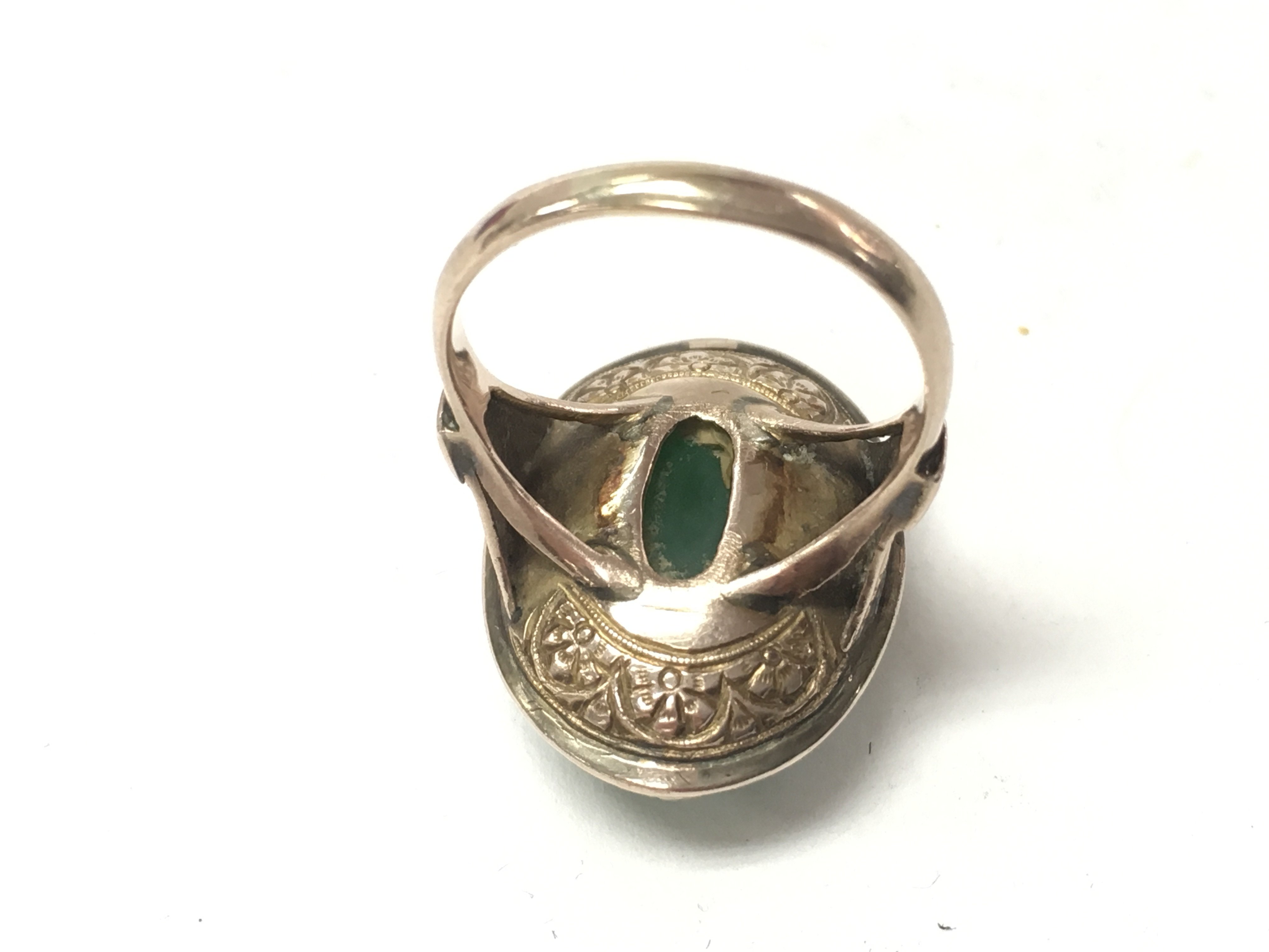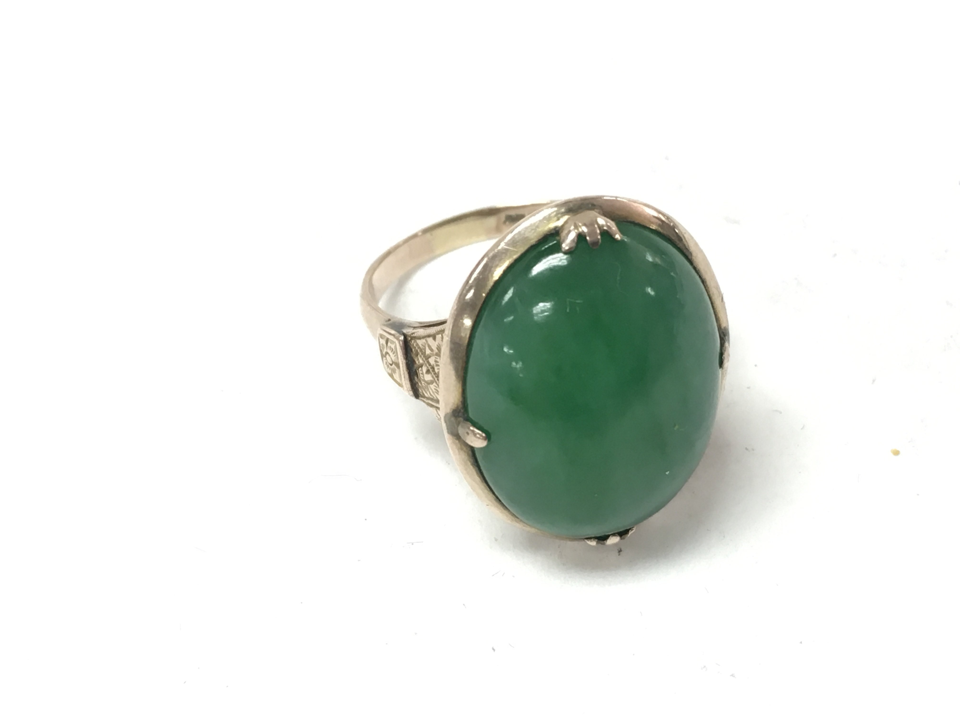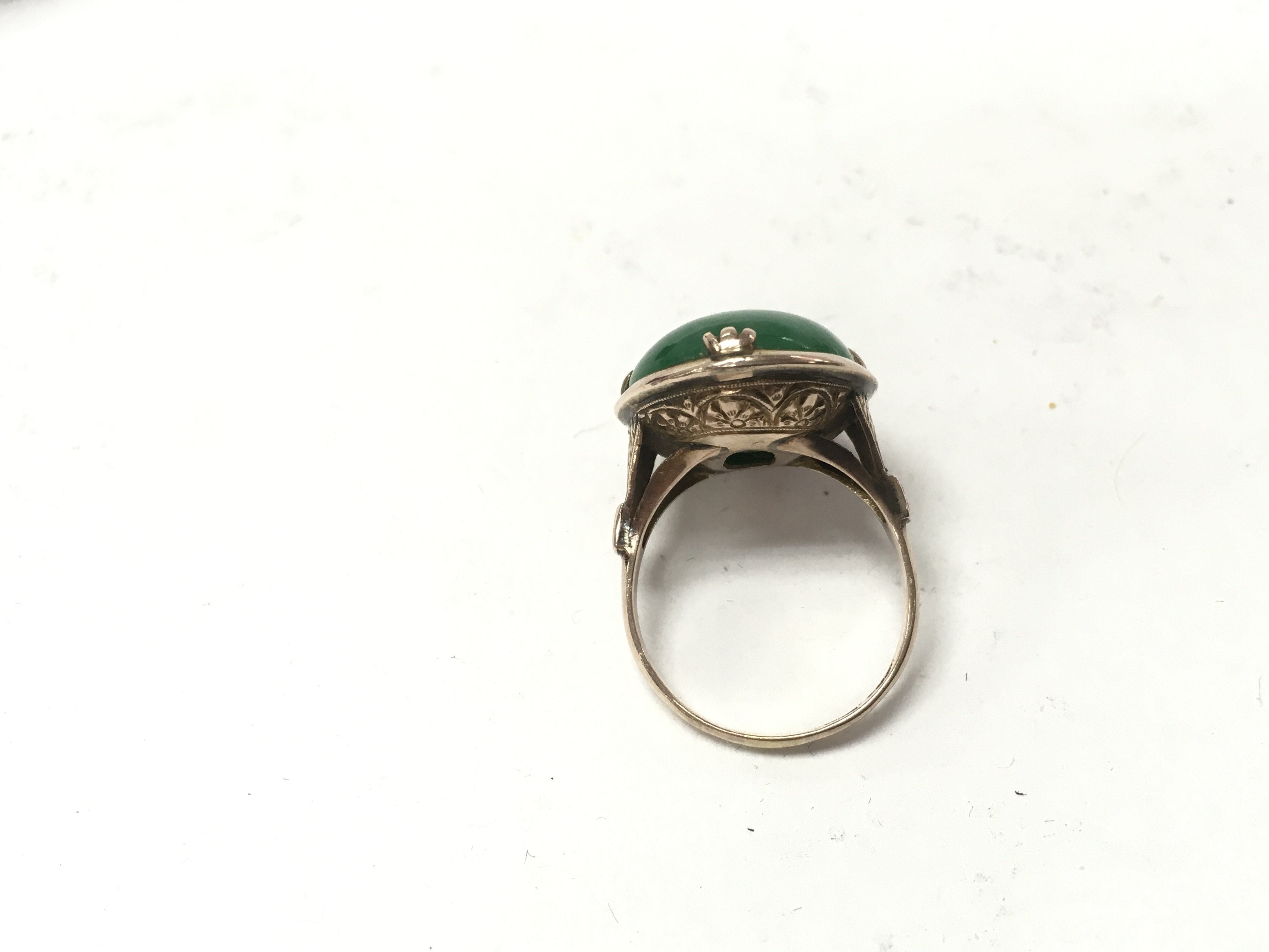 A vintage 9ct gold apple green jade ring. Size N and 7.81g total. Postage B