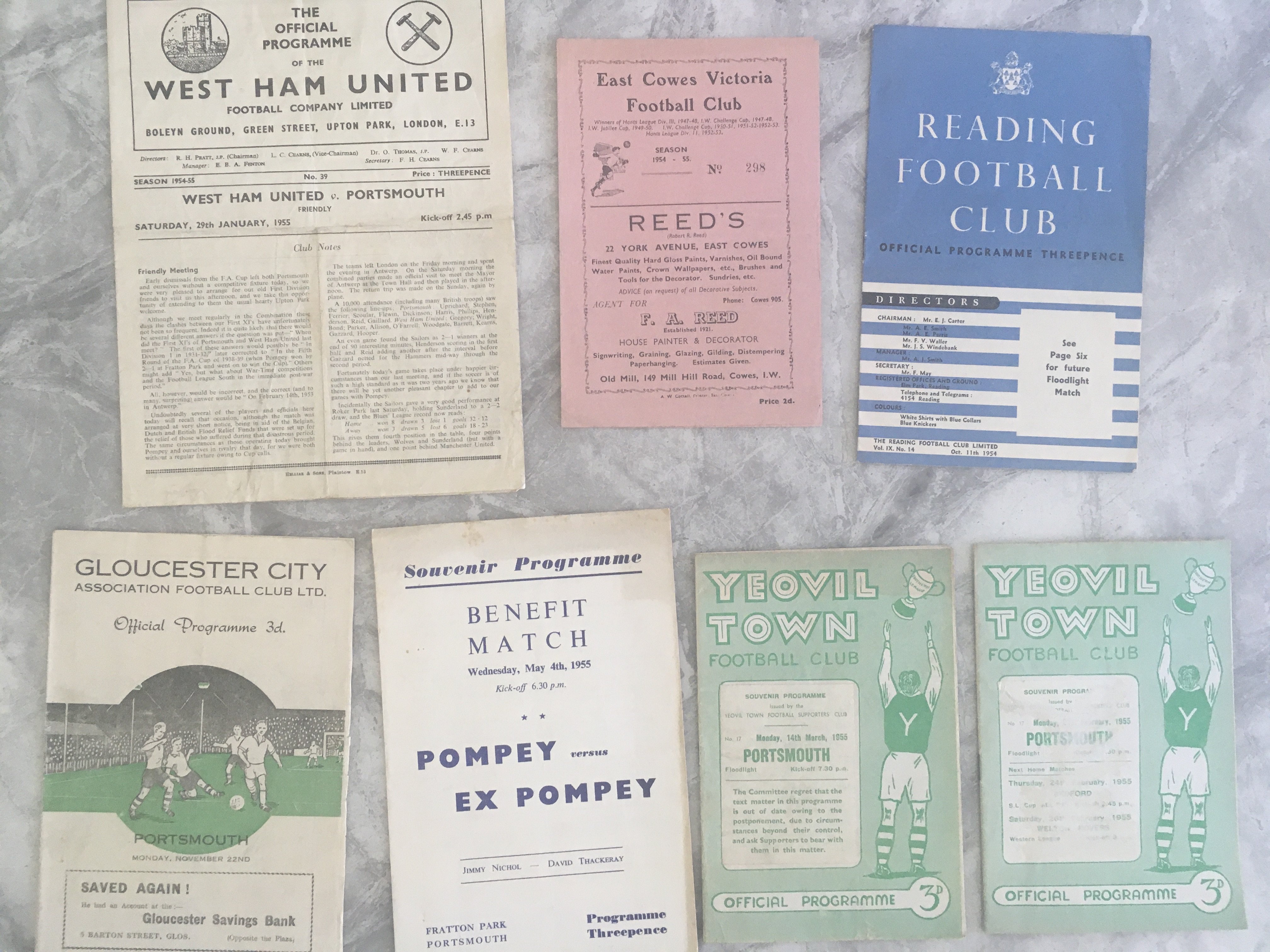 54/55 Portsmouth Away Friendly Football Programmes: Fair/good condition private collection of aways at West Ham Reading East Cowes Victoria Gloucester and two different dates for Yeovil. Includes Benefit match at Fratton Park. (7)