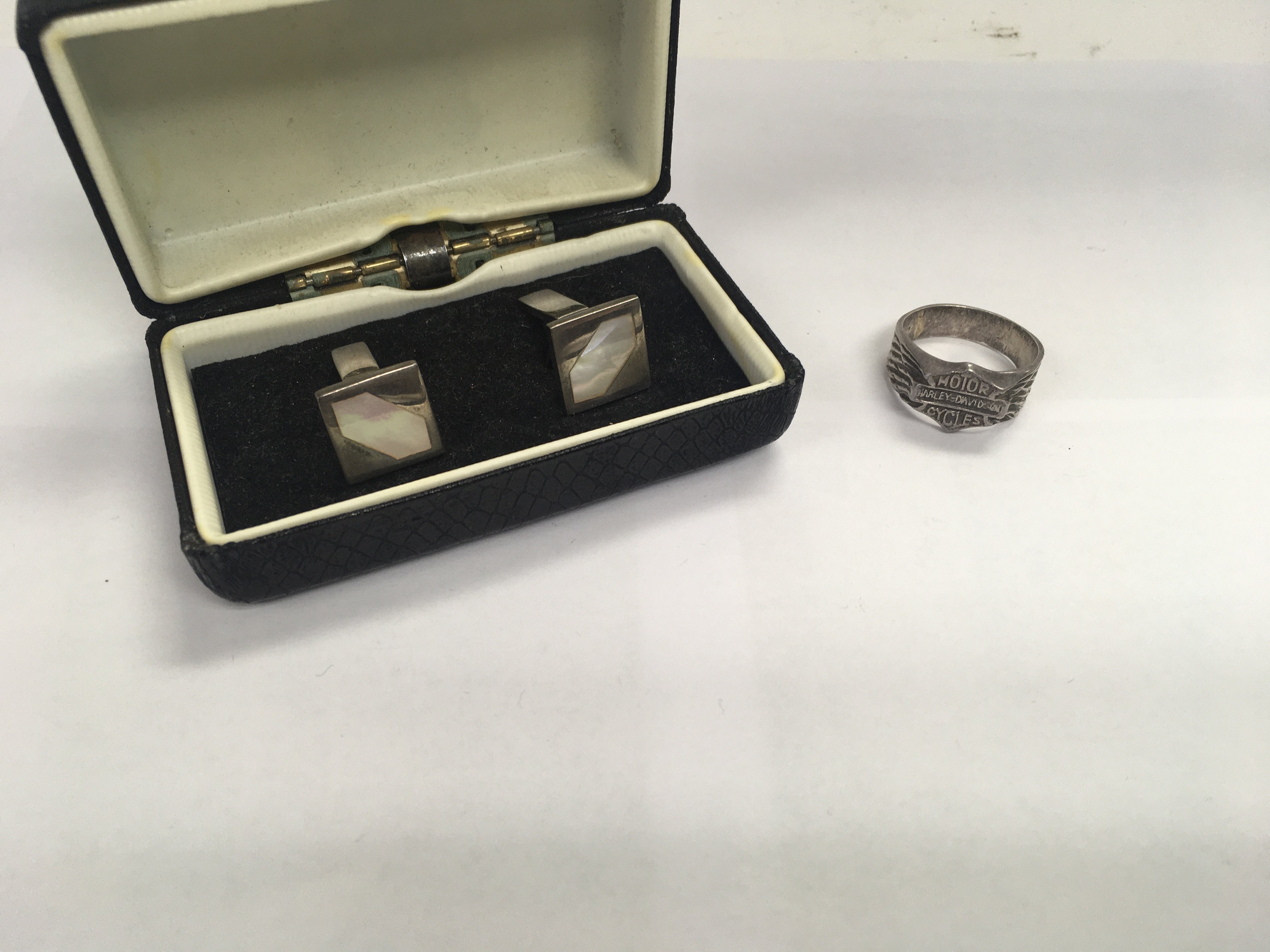 A silver pair of cufflinks and a silver Harley Davidson motorcycles ring.