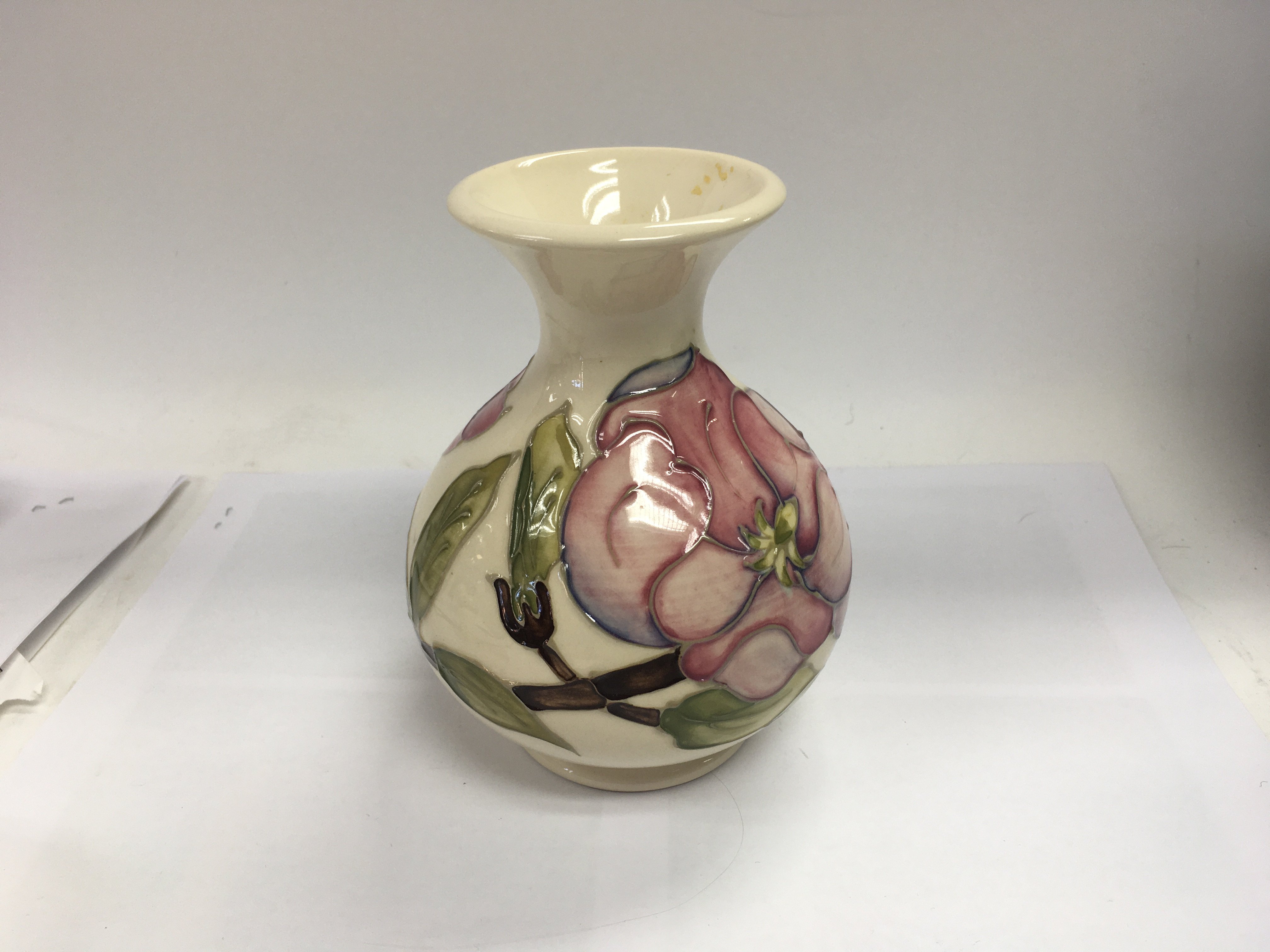 A Moorcroft hibiscus vase decorated with flowers and foliage.