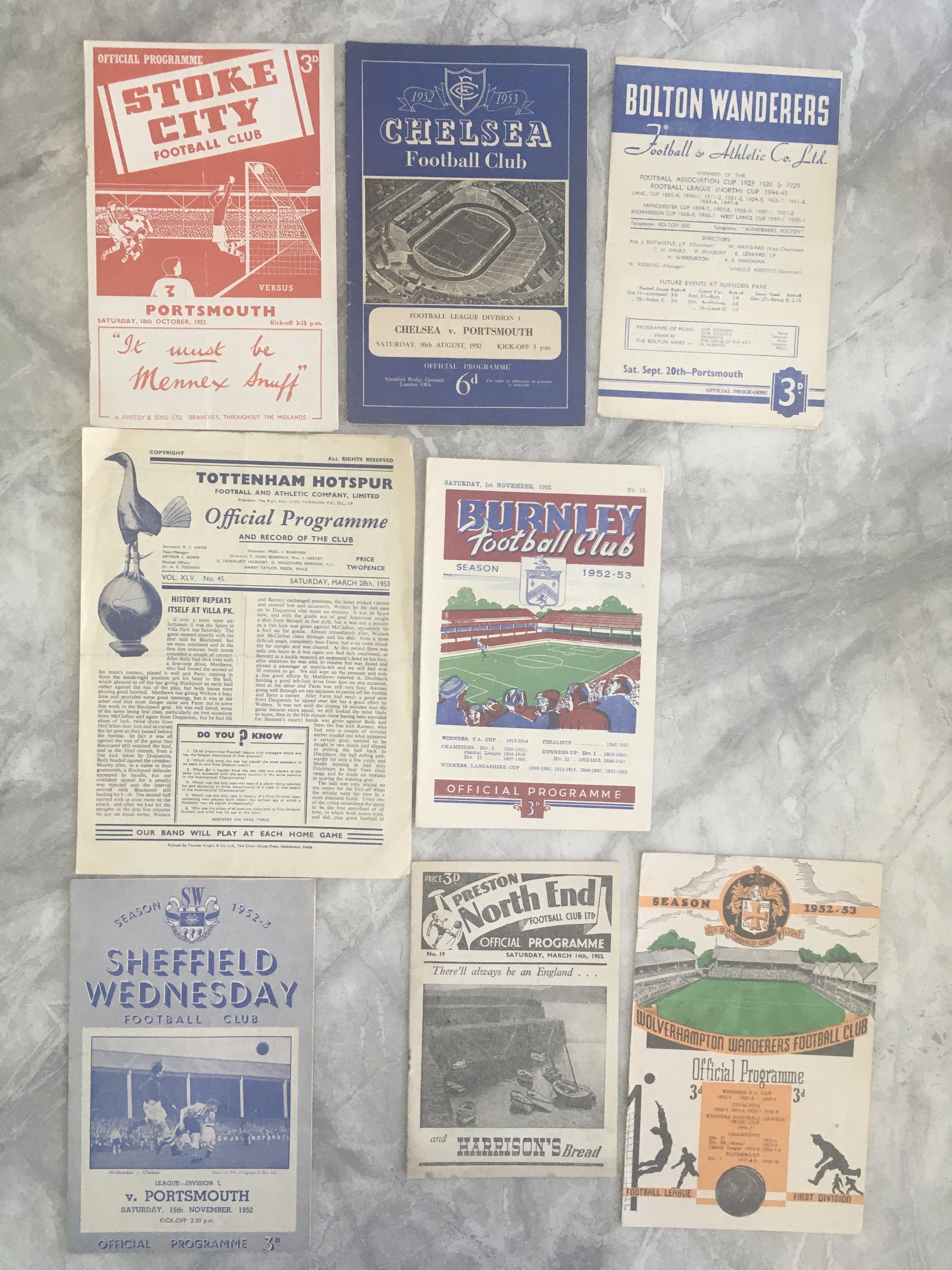 52/53 Portsmouth Away Football Programmes: Very good condition private collection of aways to include Burnley Bolton and Stoke. (8)