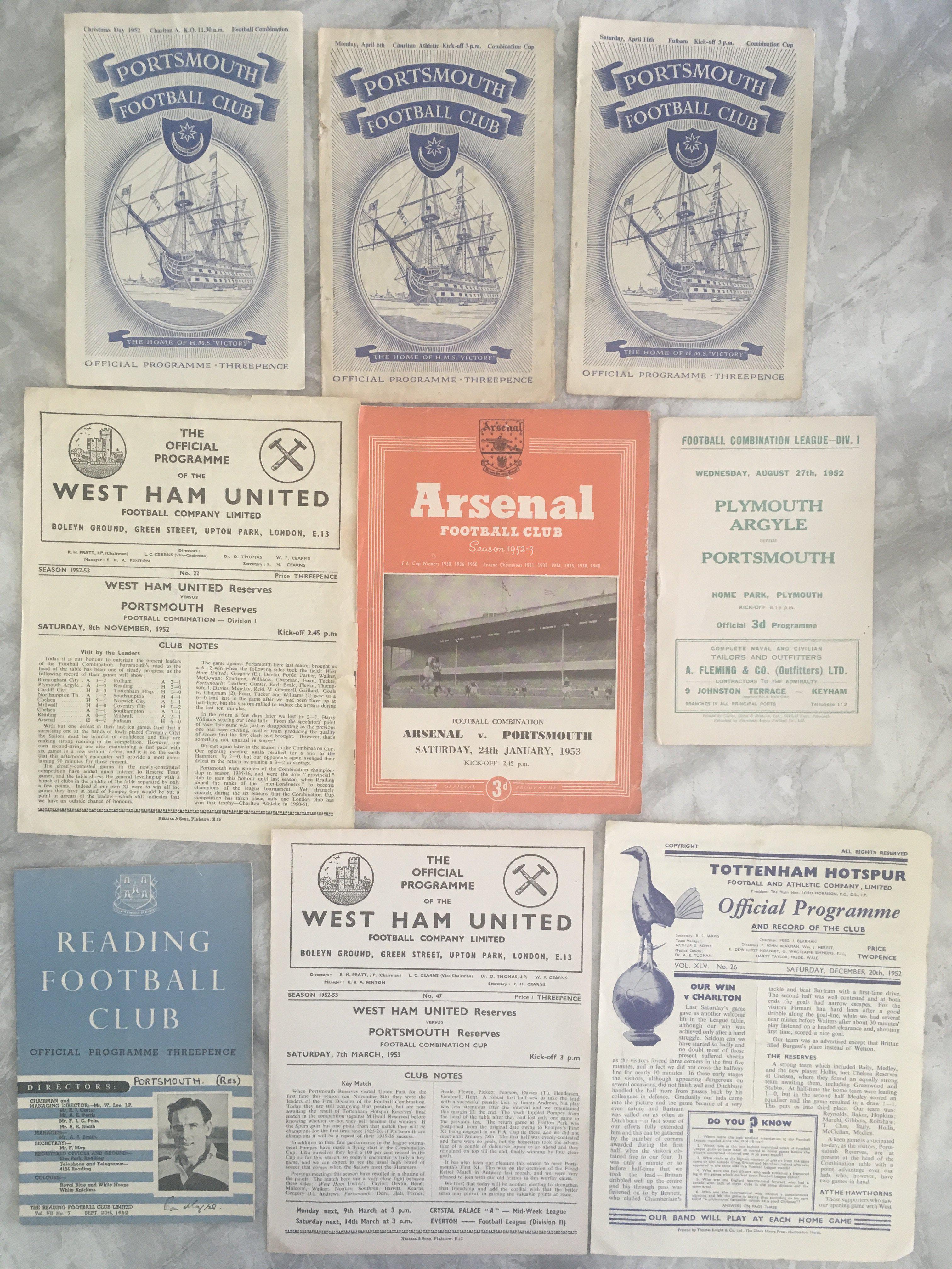 52/53 Portsmouth Reserves Football Programmes: Good condition private collection of 3 homes plus 6 aways to include Plymouth and West Ham. (9)