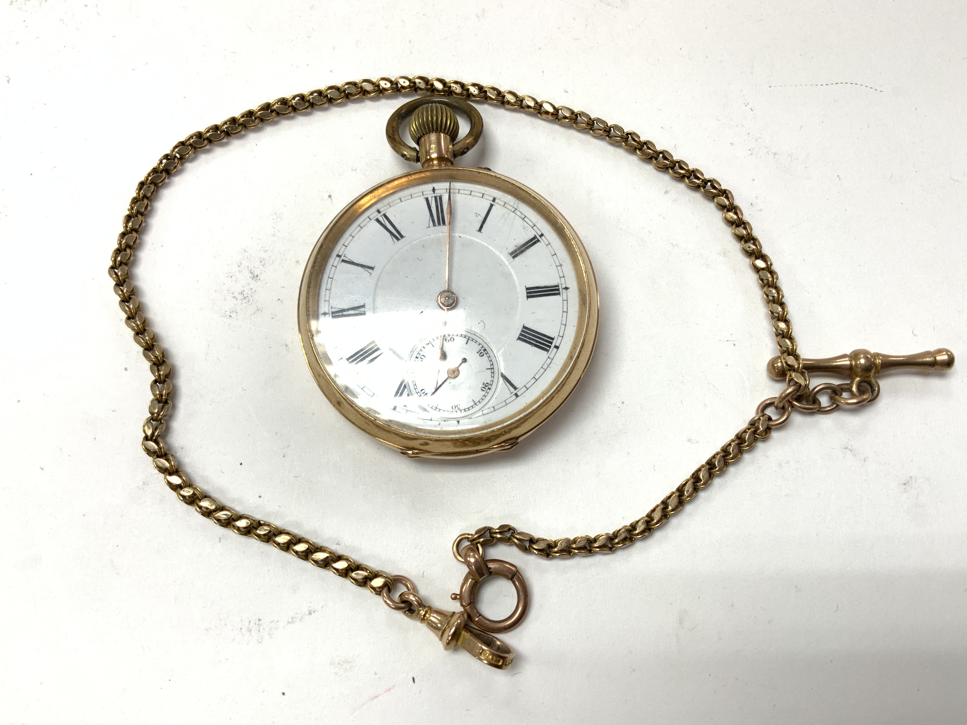 10ct gold Albert chain 12.8g together with a 14k cased pocket watch. Postage category A.