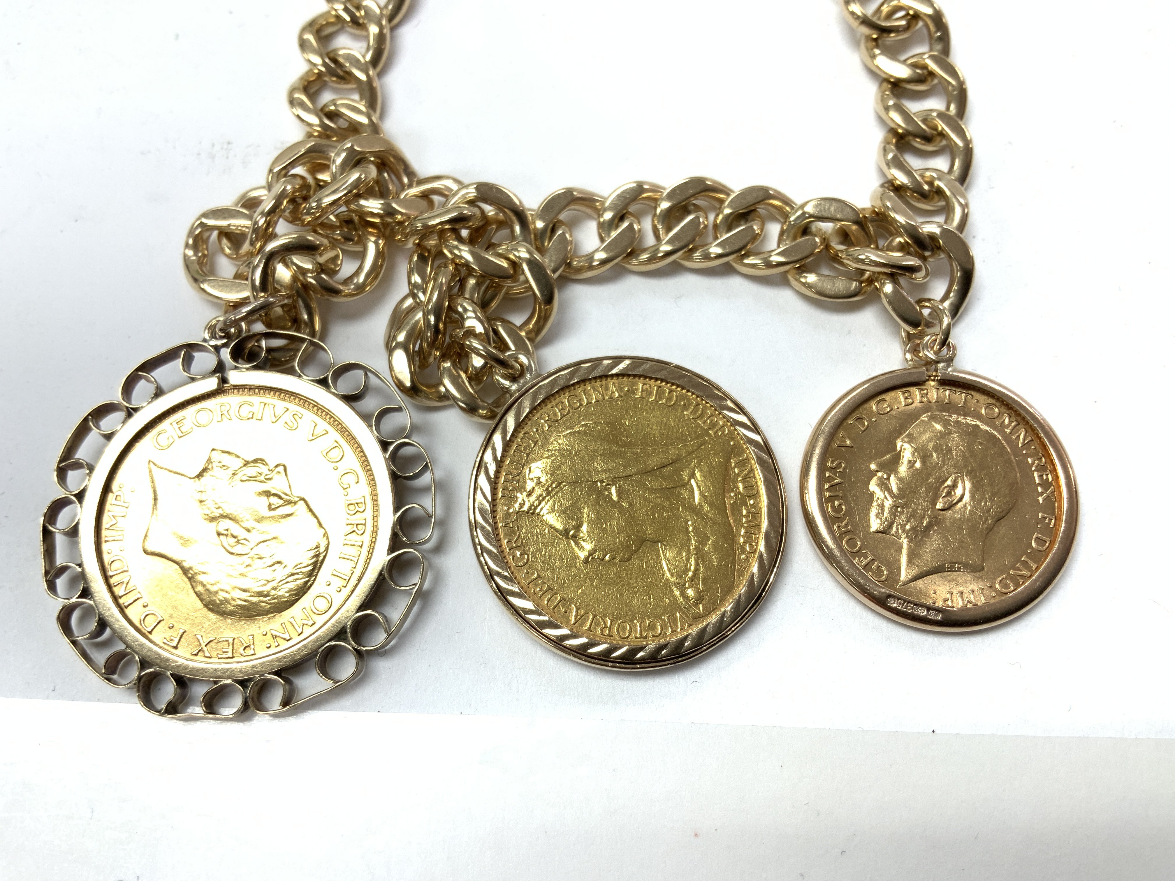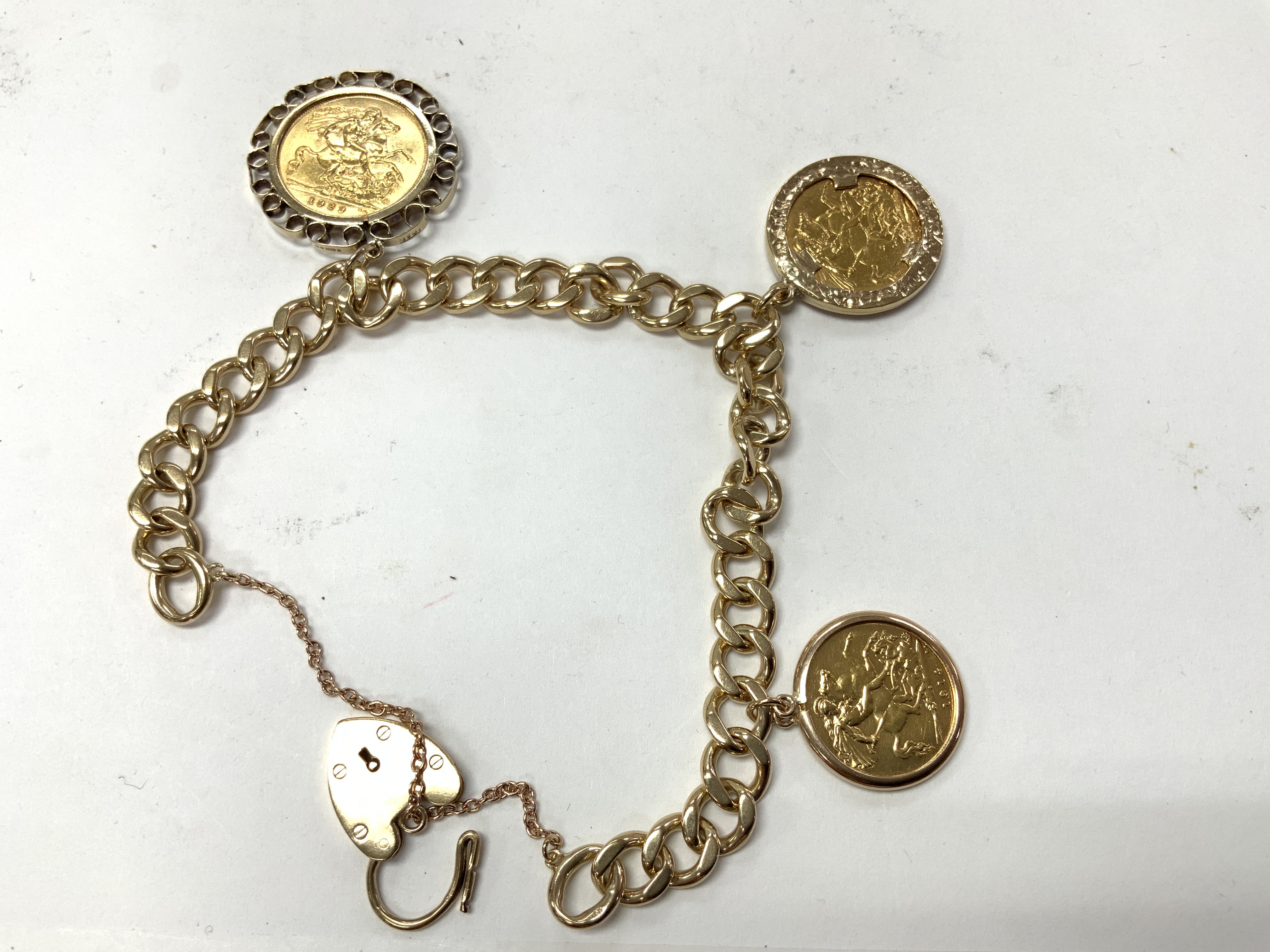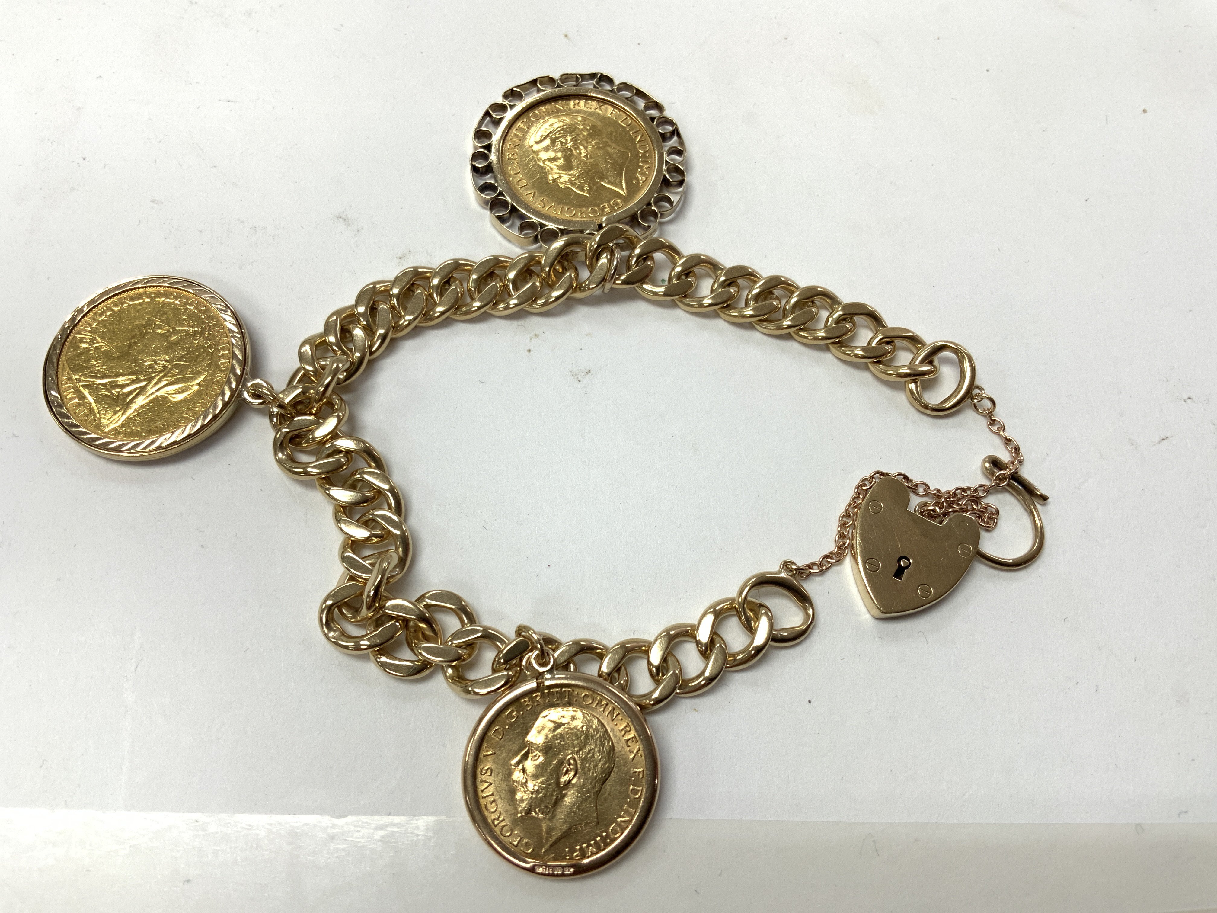 A 9ct gold bracelet with 2 Sovereign and Half Sovereign coins in mounts 1929 full, 1894 full, 1914 1/2. Total weight 50.55g. Postage category A.