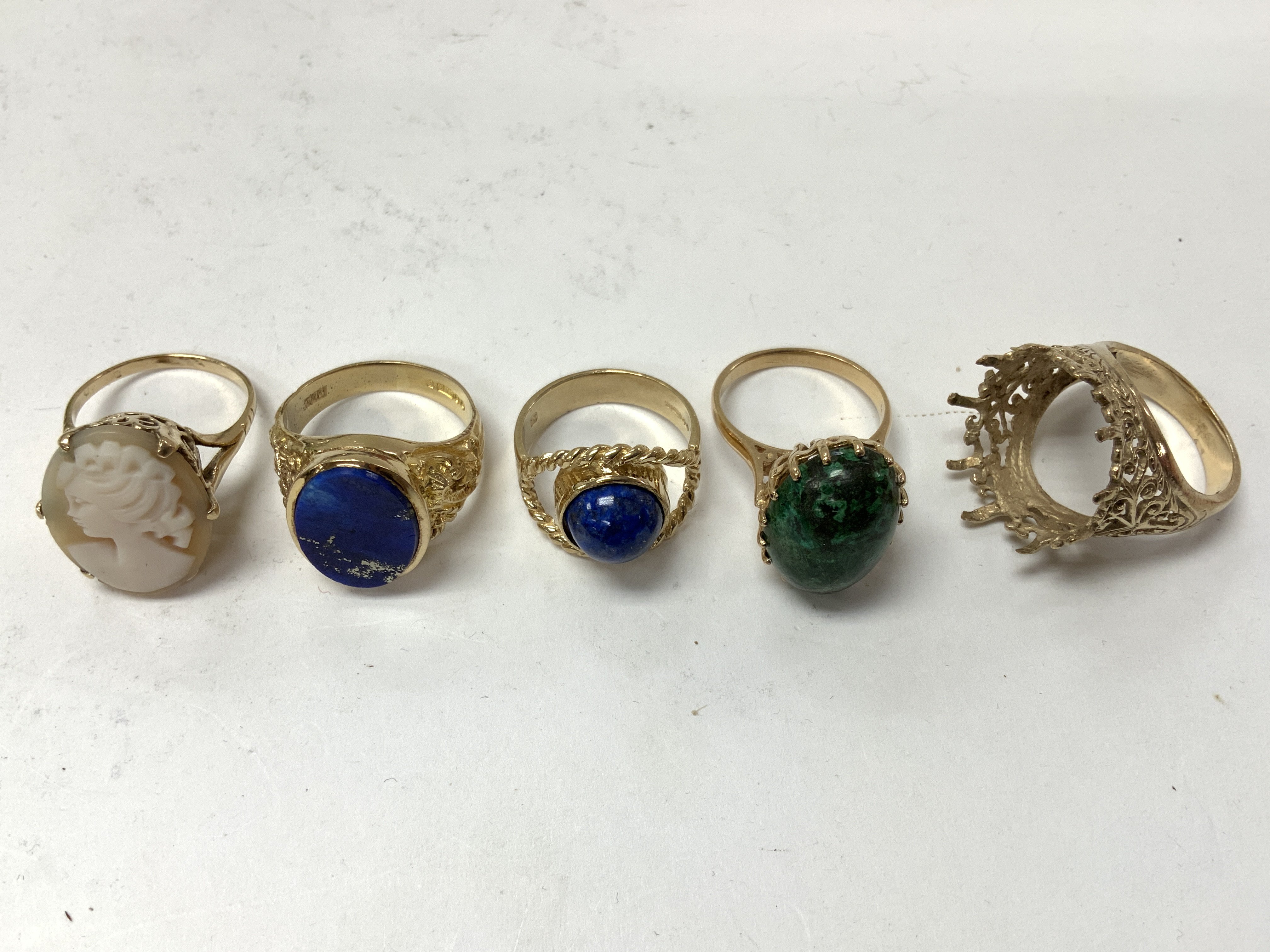Five 9ct gold stone set rings. Approx 27.99g, Postage category A. Left to right ring sizes approximately - N/O, Q, M, N/O, P/Q.