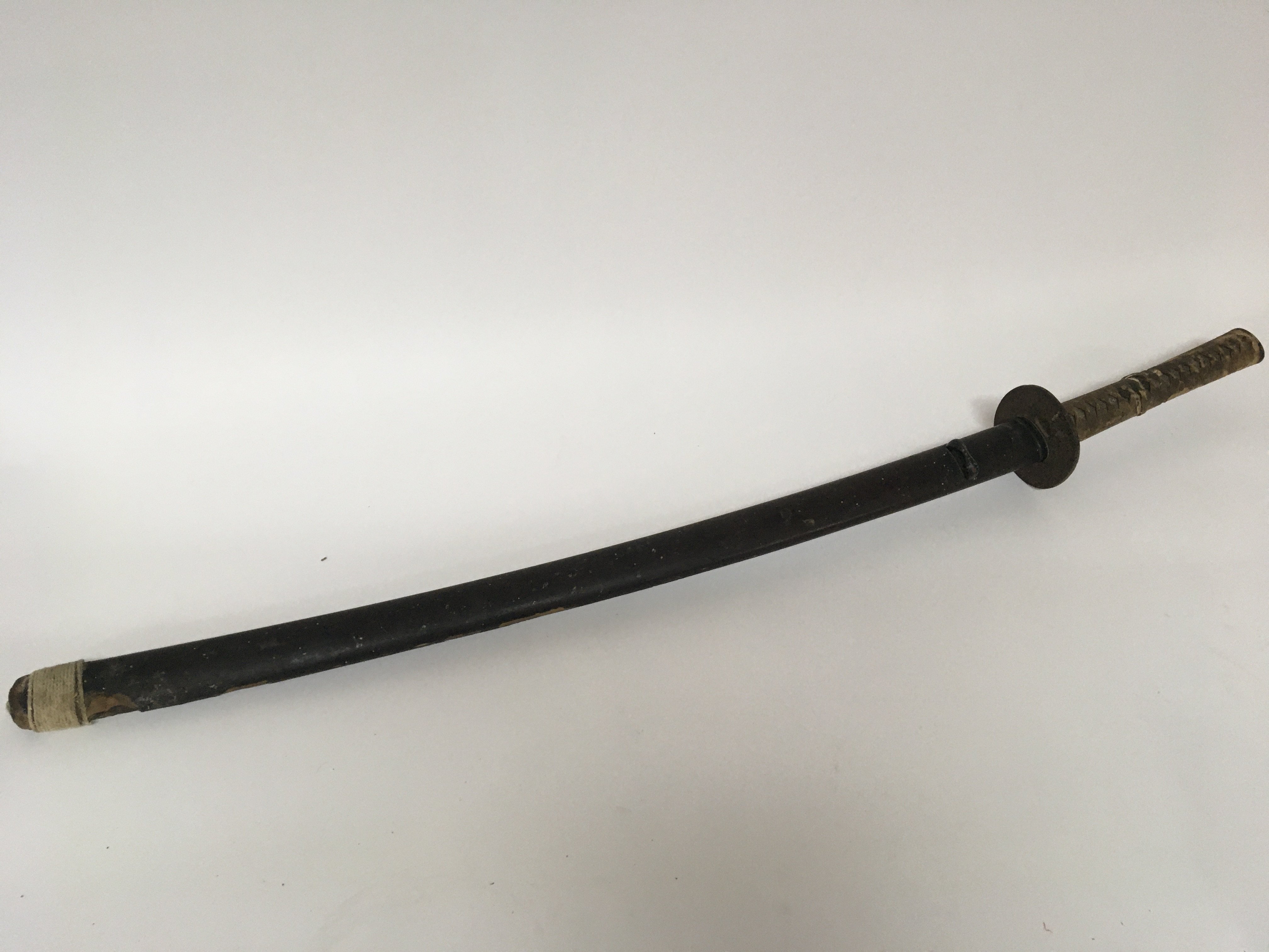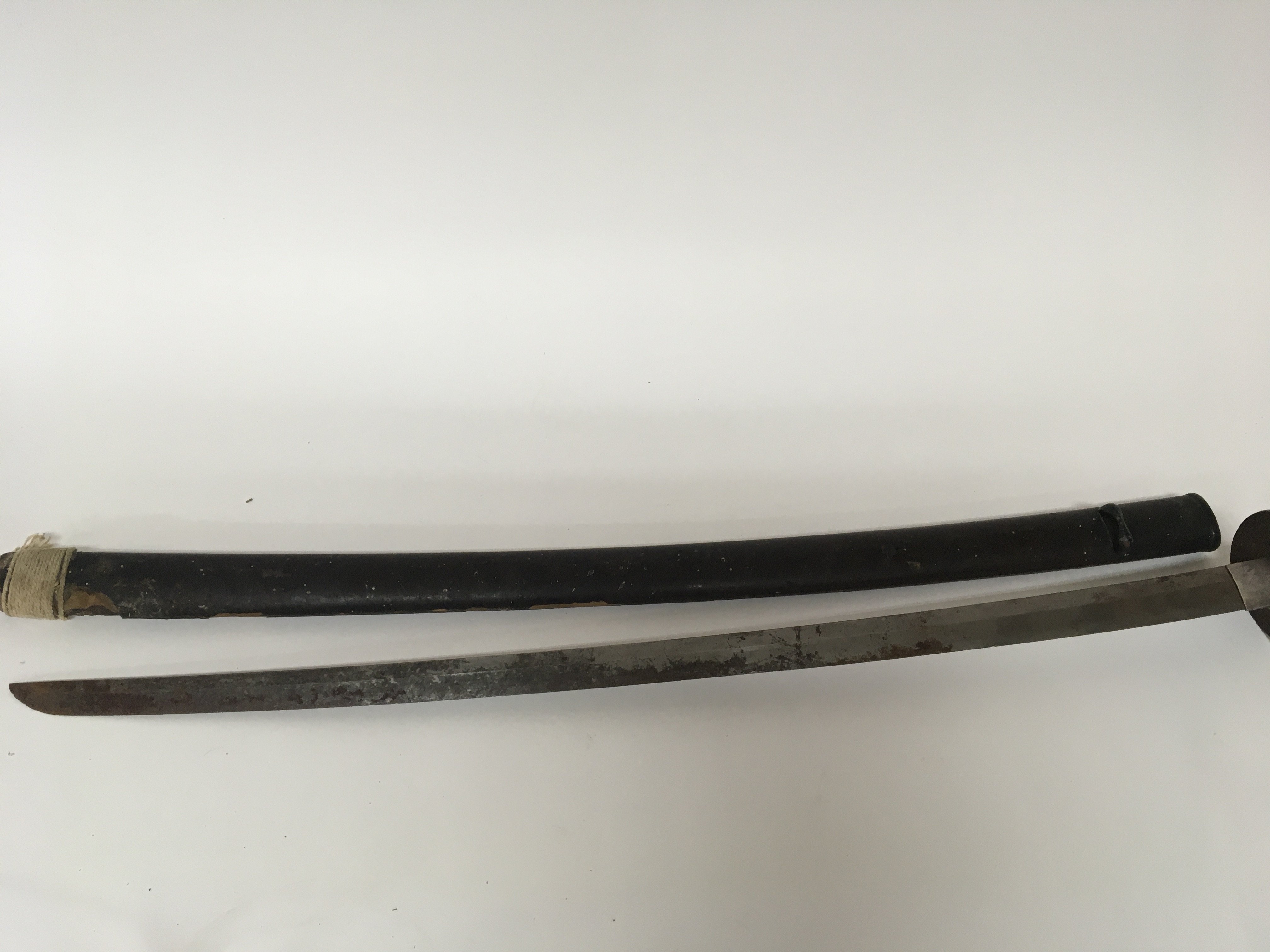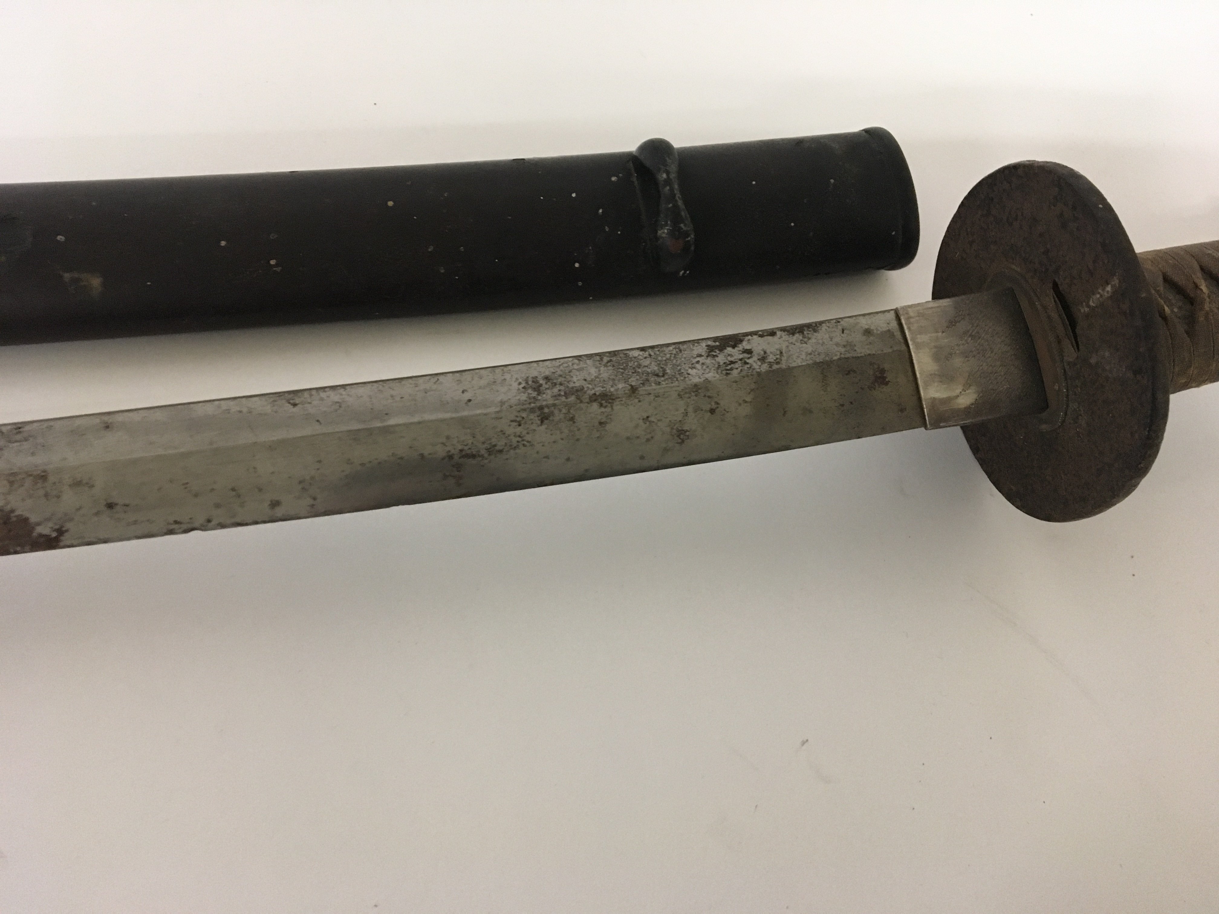 An Antique Japanese Samurai sword with a bound shagreen grip cast metal tusuba steel folded blade. Lacquered sheath. the blade rust particularly towards the point lenght total length 103cm
