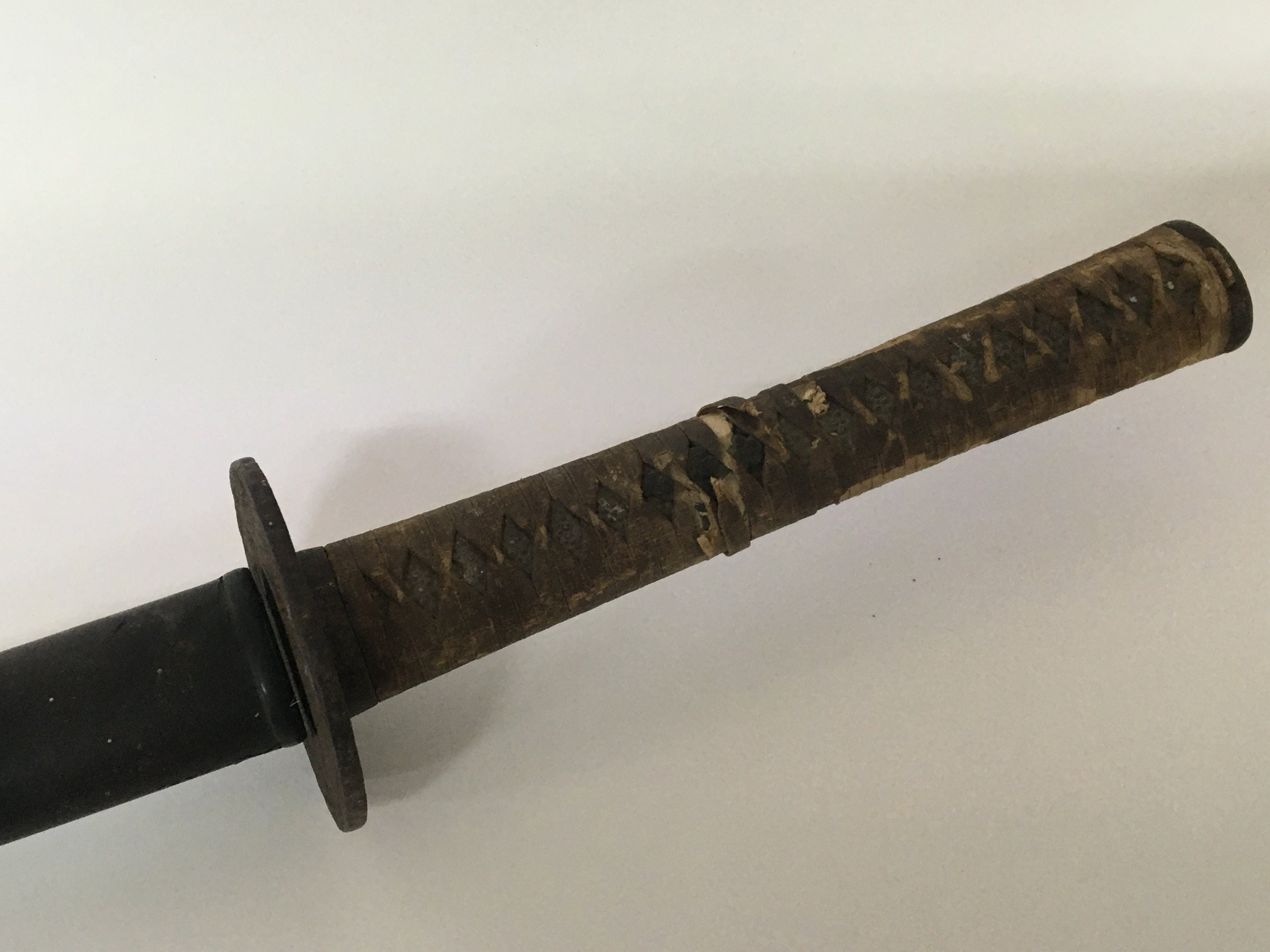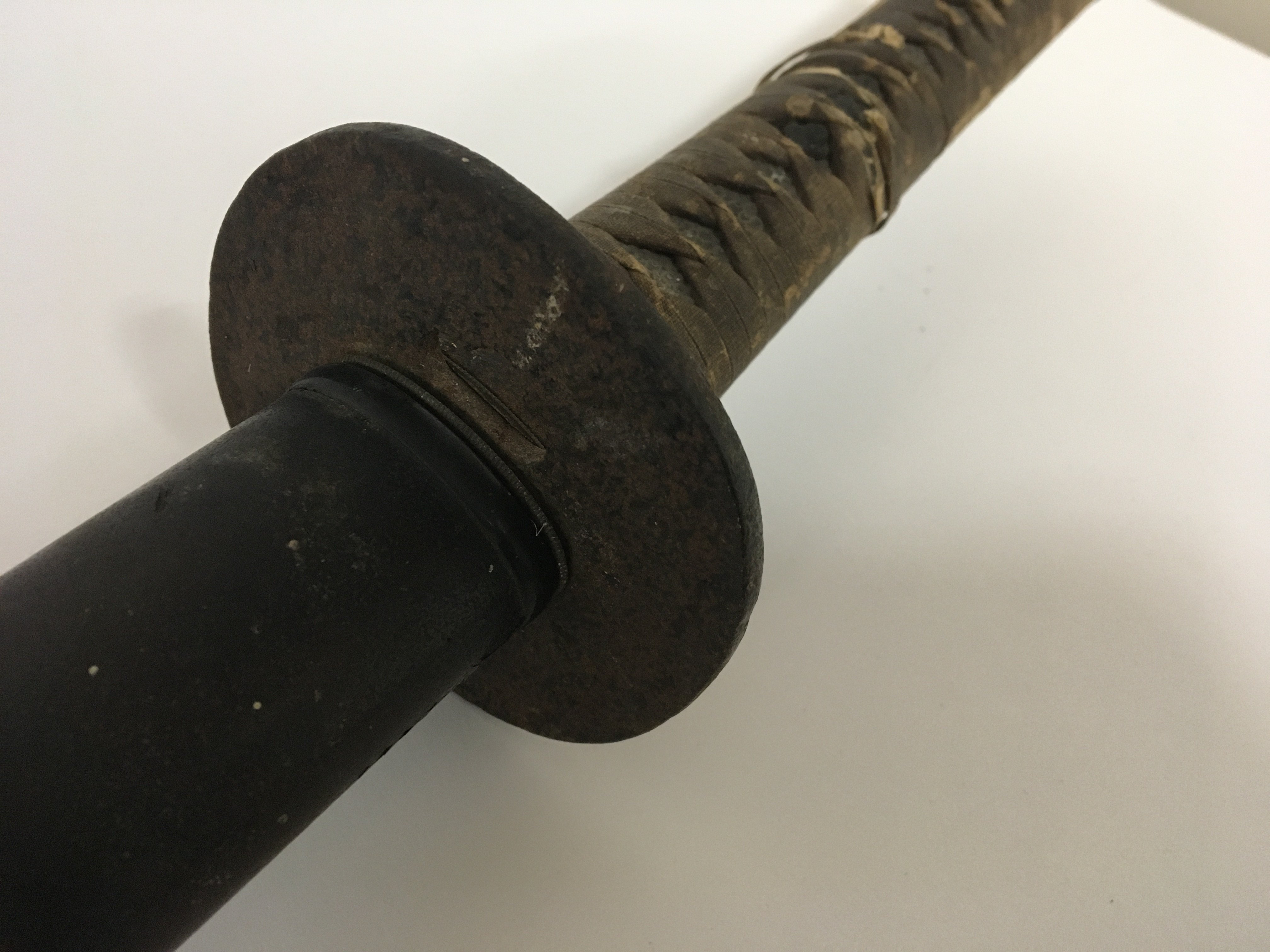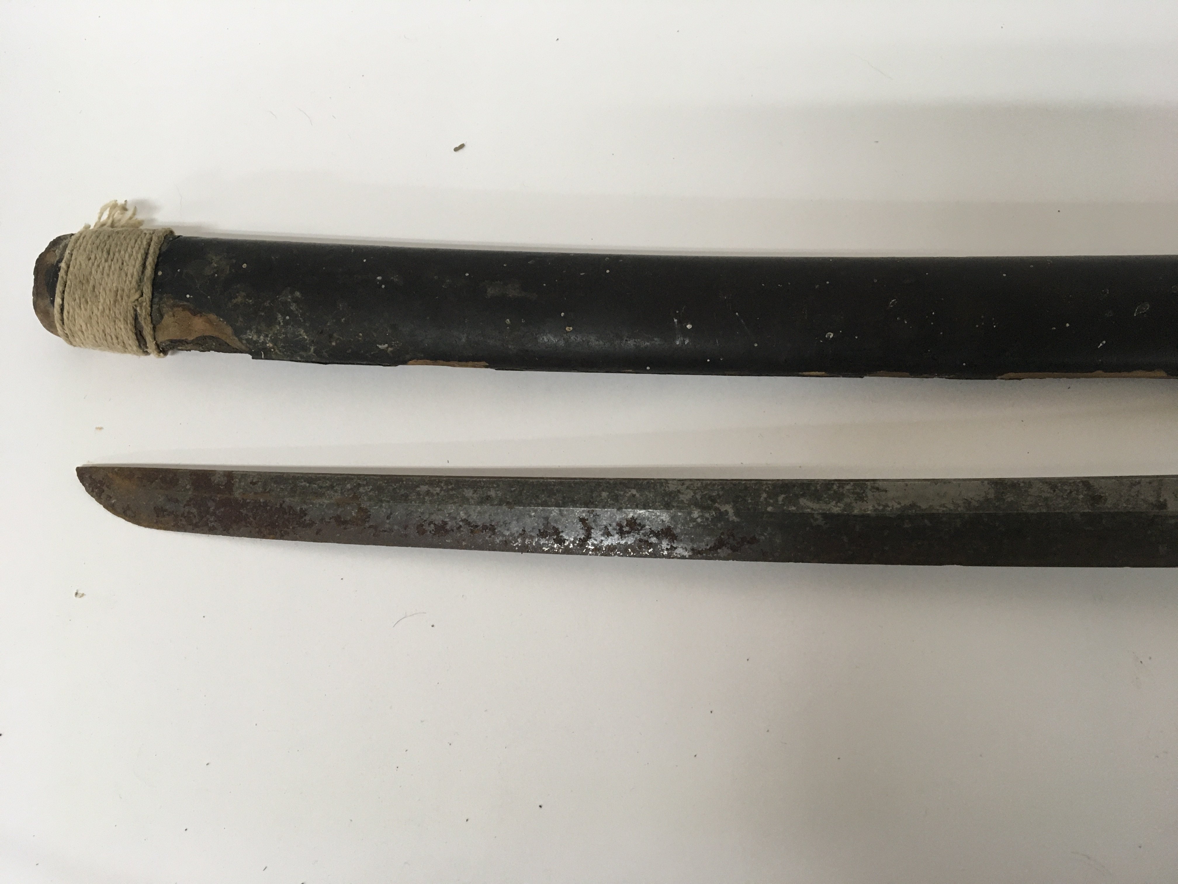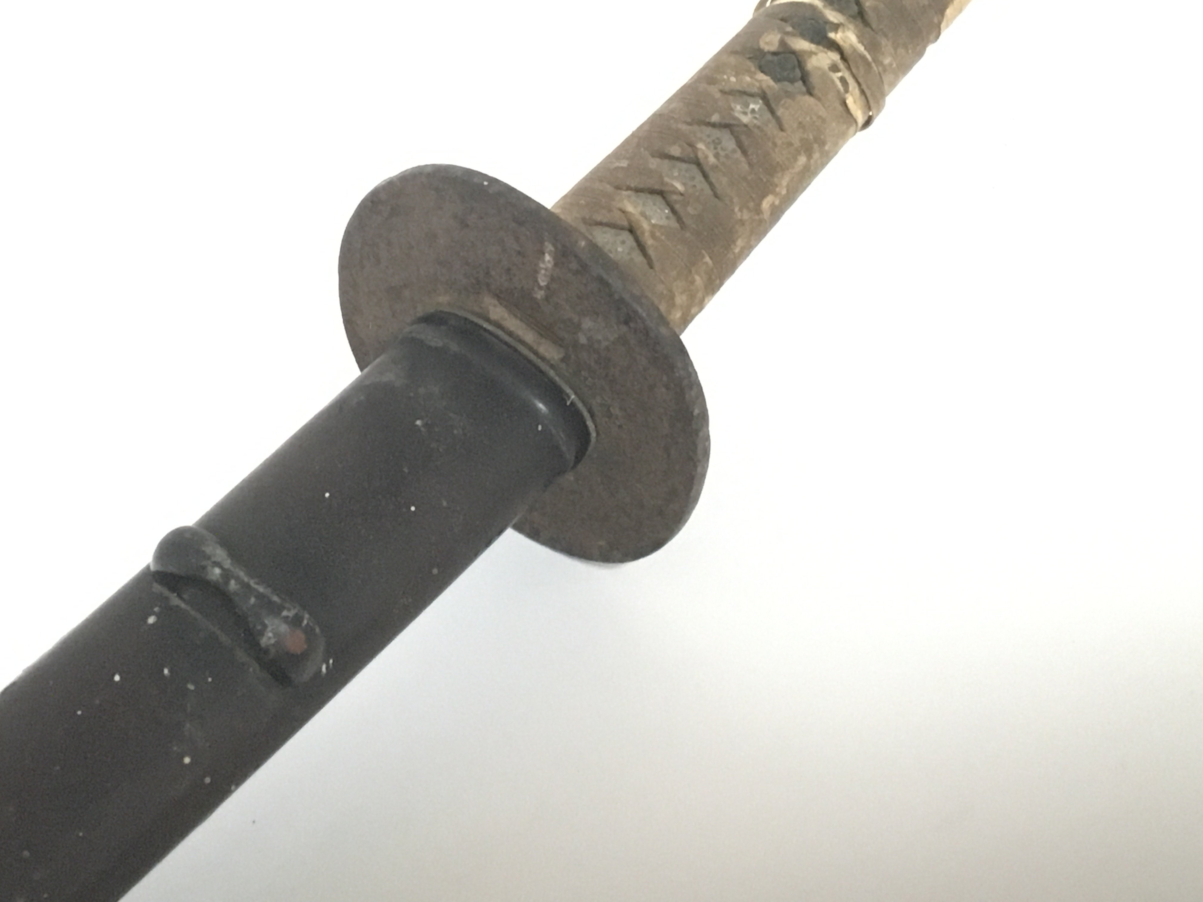 An Antique Japanese Samurai sword with a bound shagreen grip cast metal tusuba steel folded blade. Lacquered sheath. the blade rust particularly towards the point lenght total length 103cm