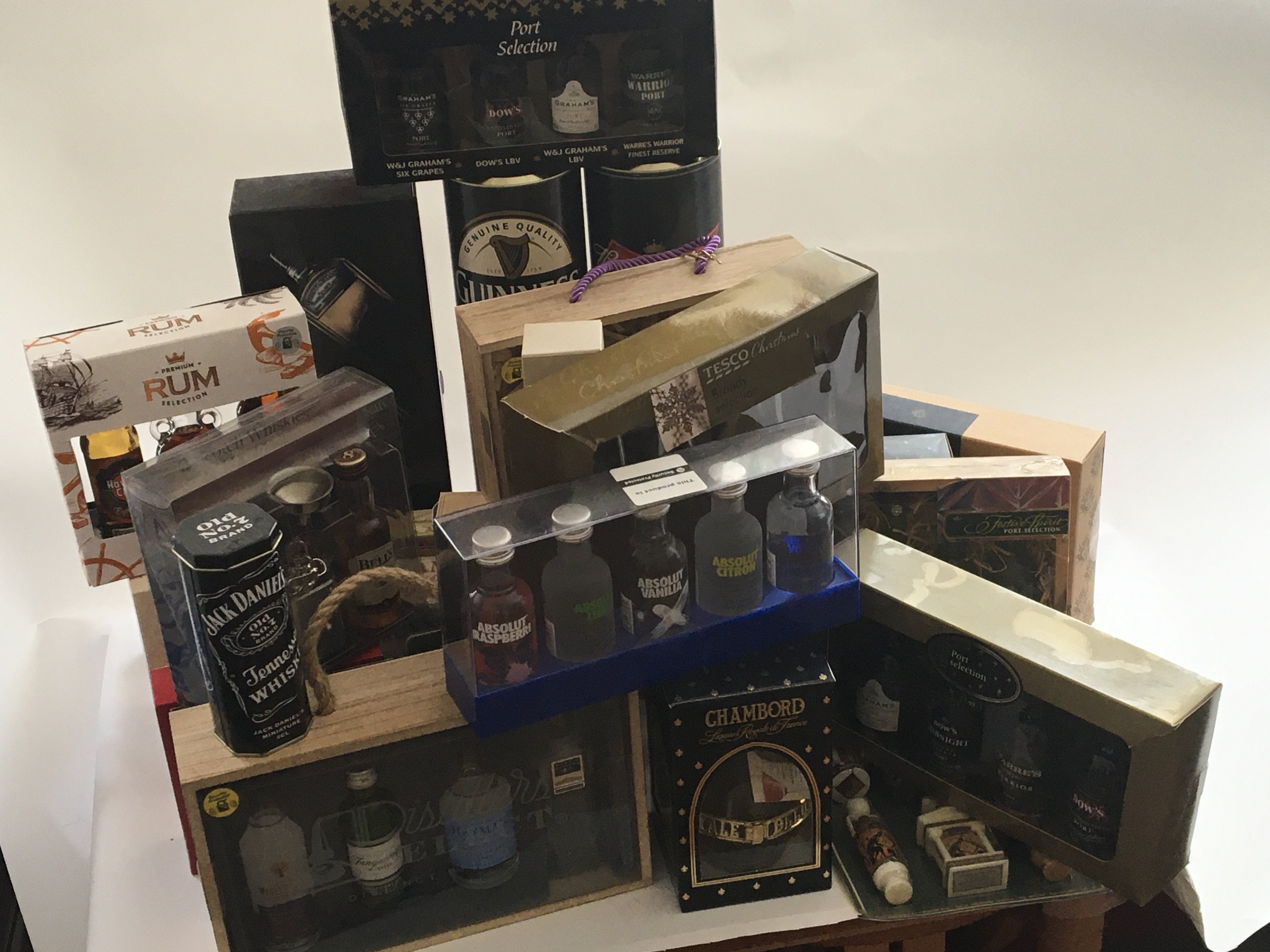 A box collection of boxed presentation Ports whisky Rum Brandy boxed Chambord and others a lot