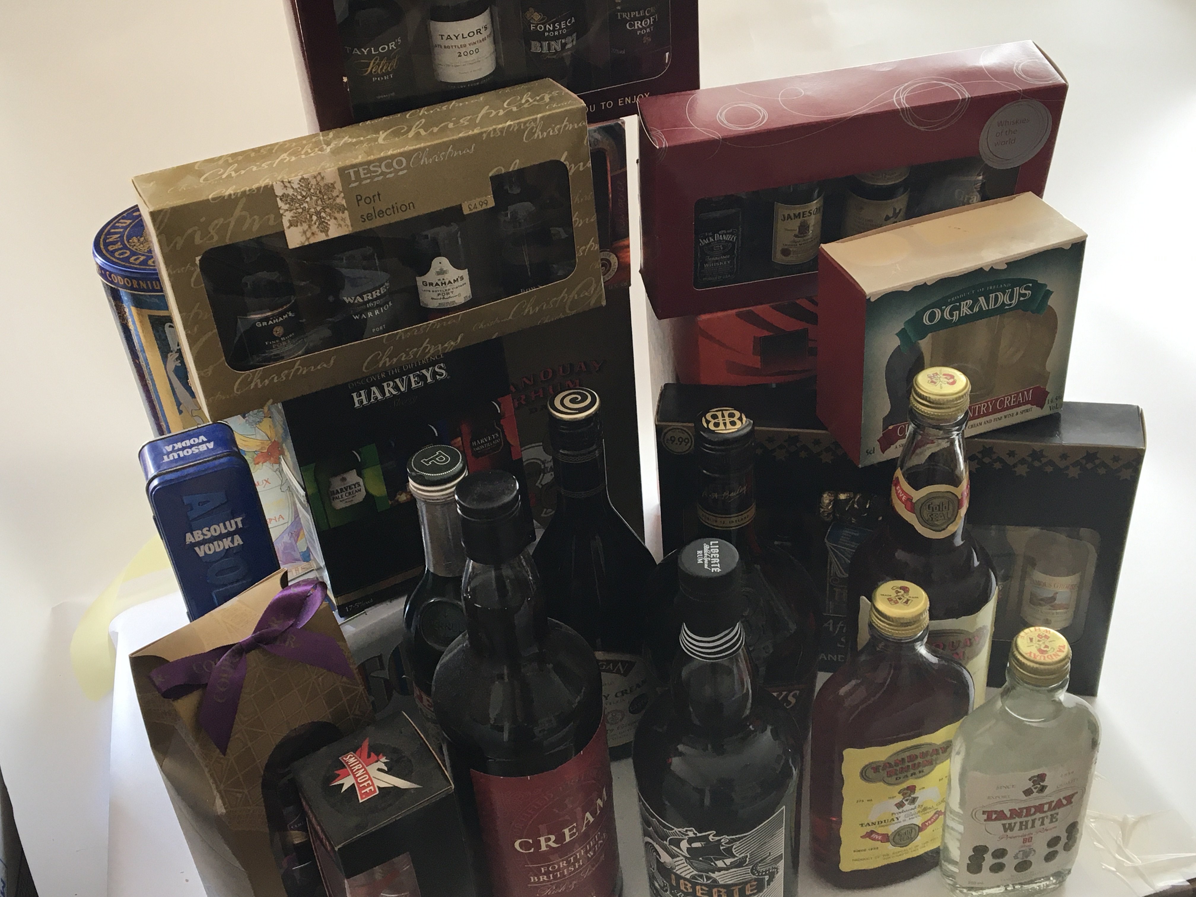 A box collection of bottles of Rum 1l and 70cl presentation boxes of small bottles of Port and other spirits including Vodka.