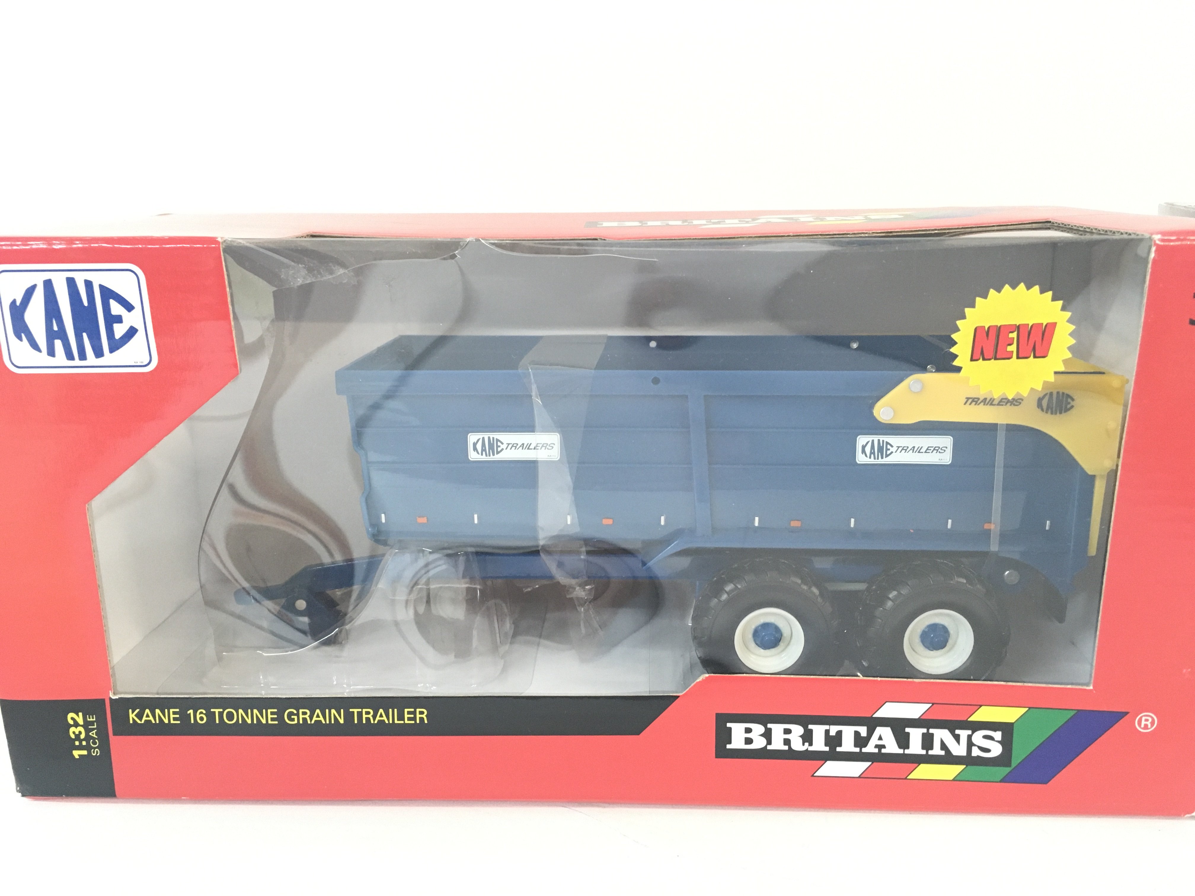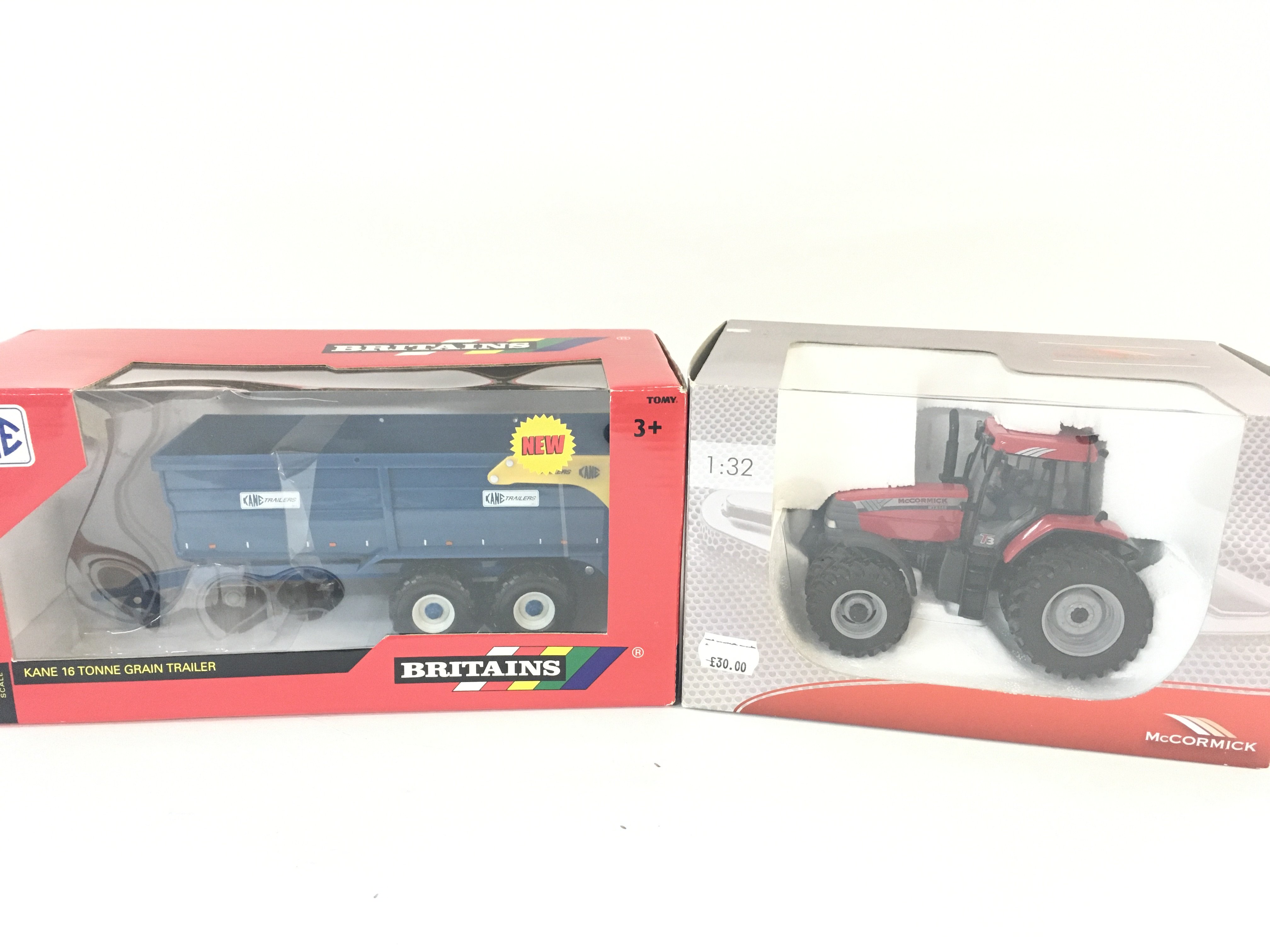 A Boxed Britains Kane 16 Tonne Grain Trailer #42701. And a Universal Hobbies MCCormick Tractor. Both 1:32 Scale.