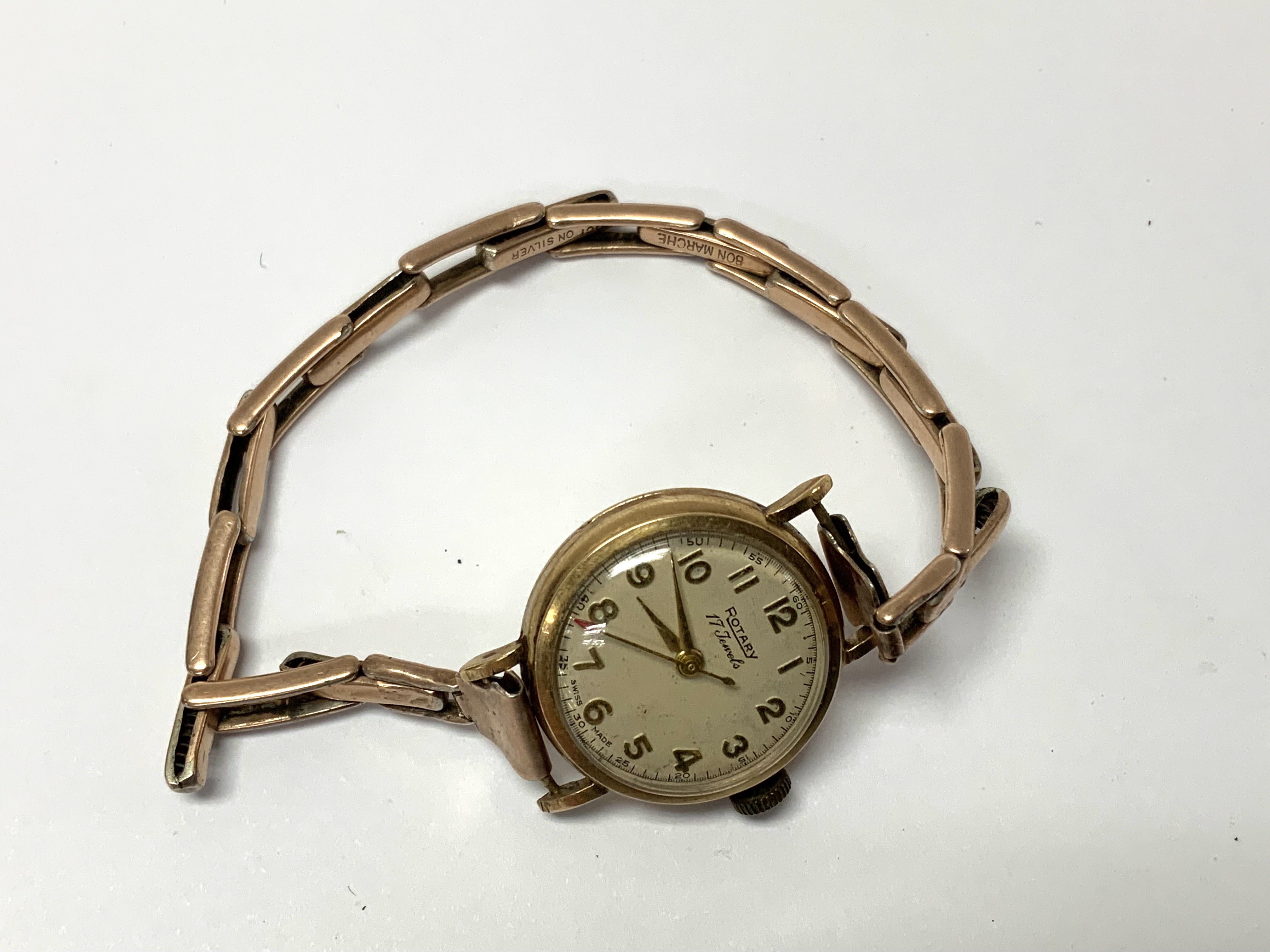 A 9ct gold cased ladies Rotary wristwatch on a 9ct gold on silver expanding strap. 16.4g (A)