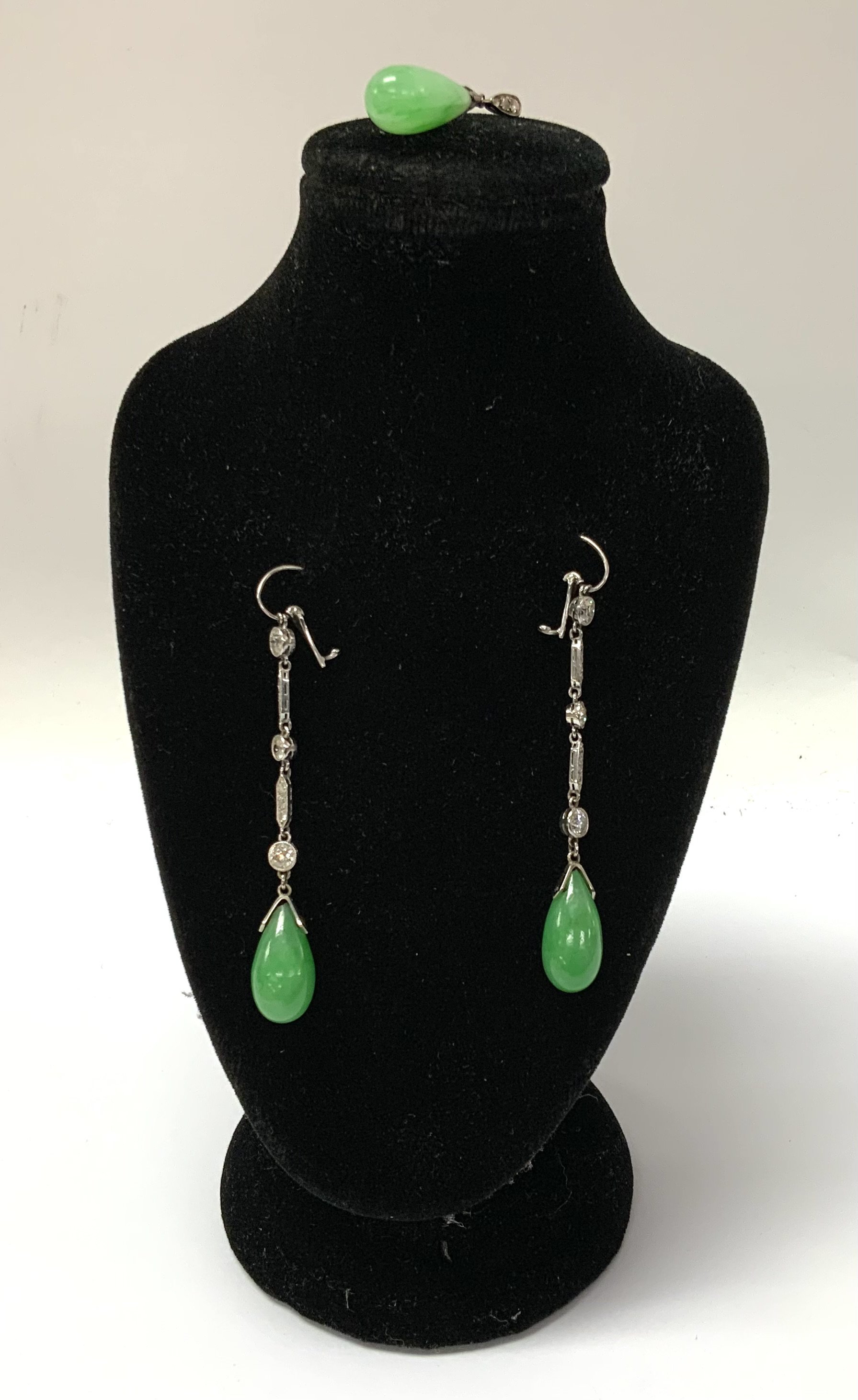 A fine pair of 1930s white gold and diamond and polished apple green jade drop earrings together with an identical pendant 5.3cm drop. (A)