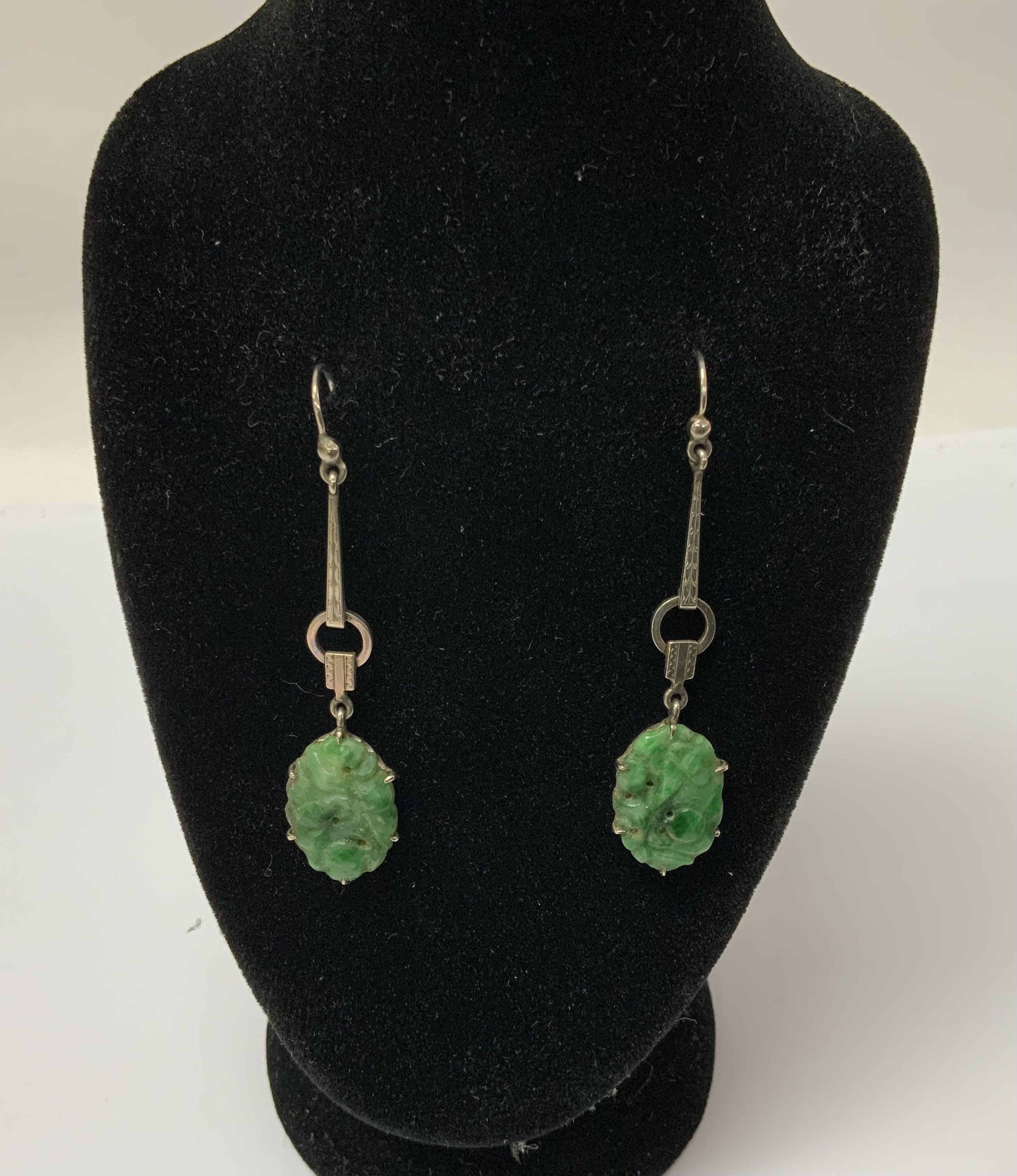 A pair of Art Deco 9ct white gold and carved jade drop earrings, 6cm drop, (A)