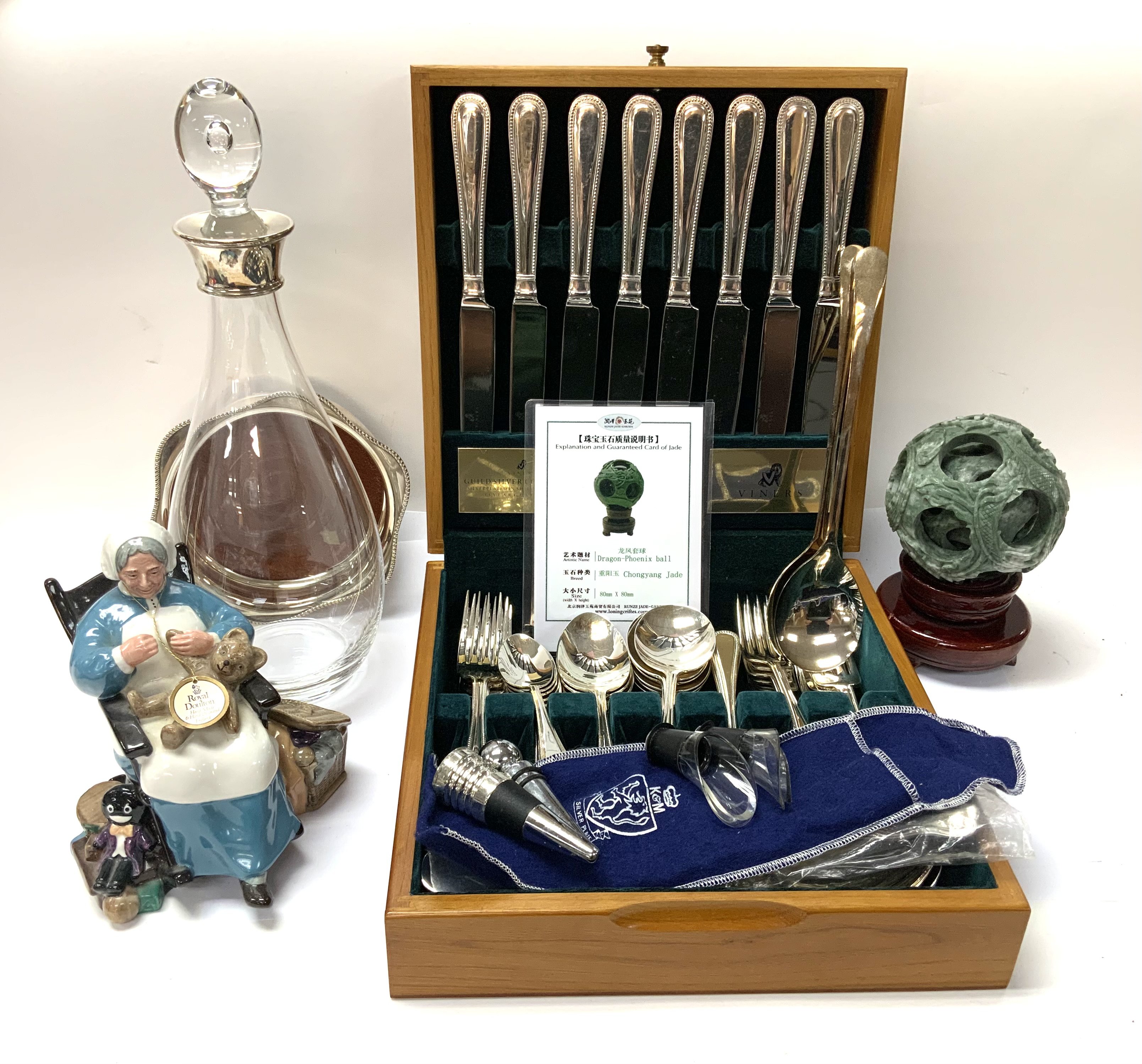 A mixed collection of odds to include cutlery set, silver topped glass decanter, Doulton Figurine etc, Jade carved ball in ball. (D)