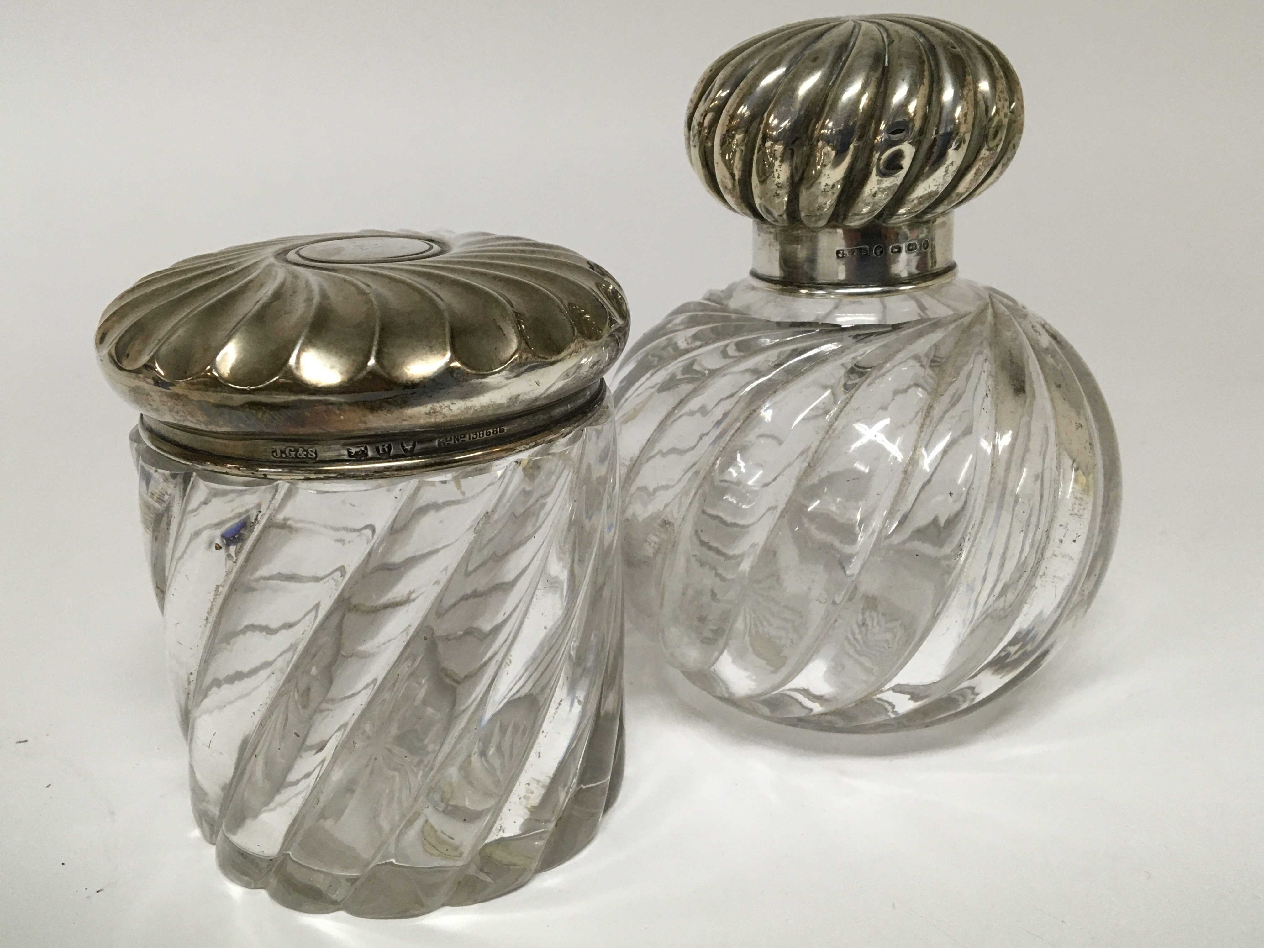 A Victorian silver topped and glass scent bottle and a silver topped tidy jar. Hight 15cm . (2)