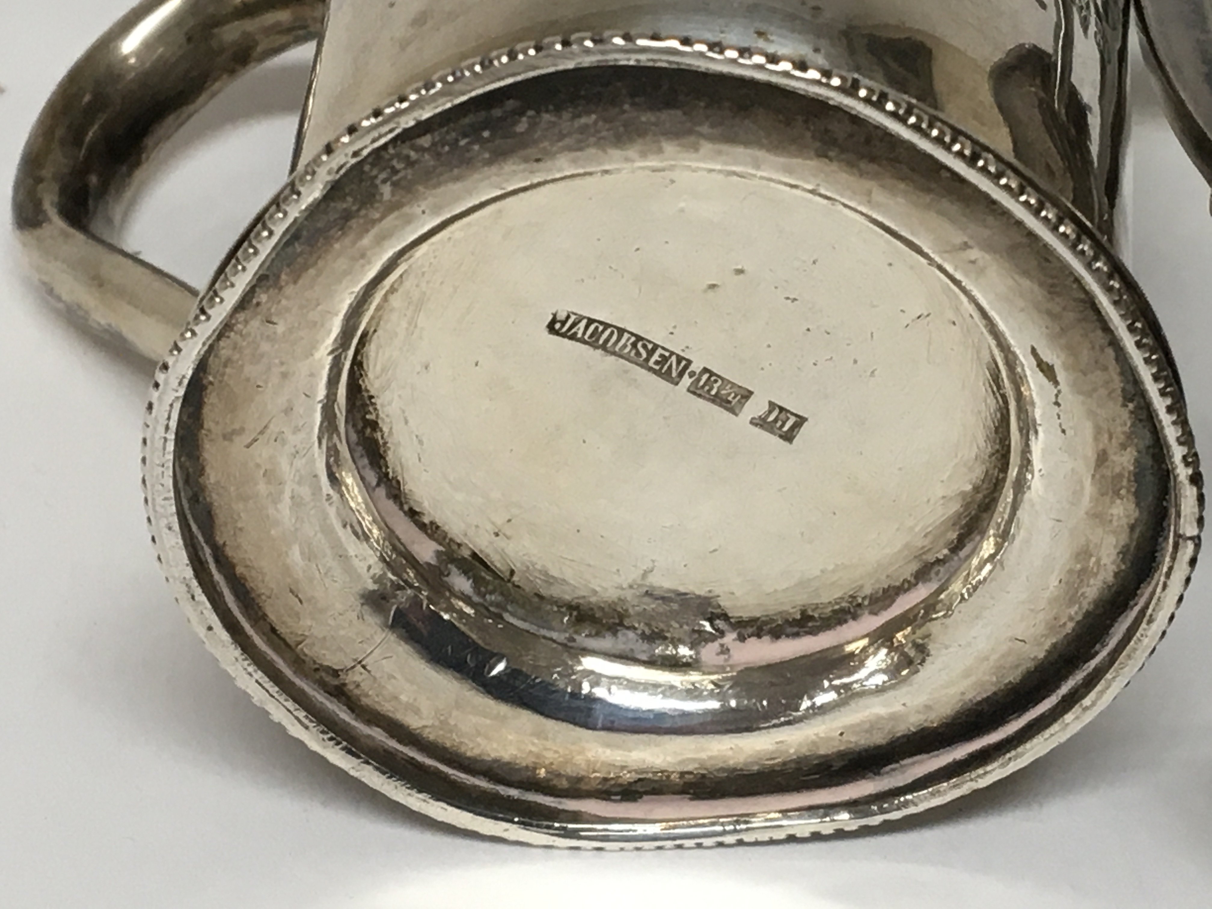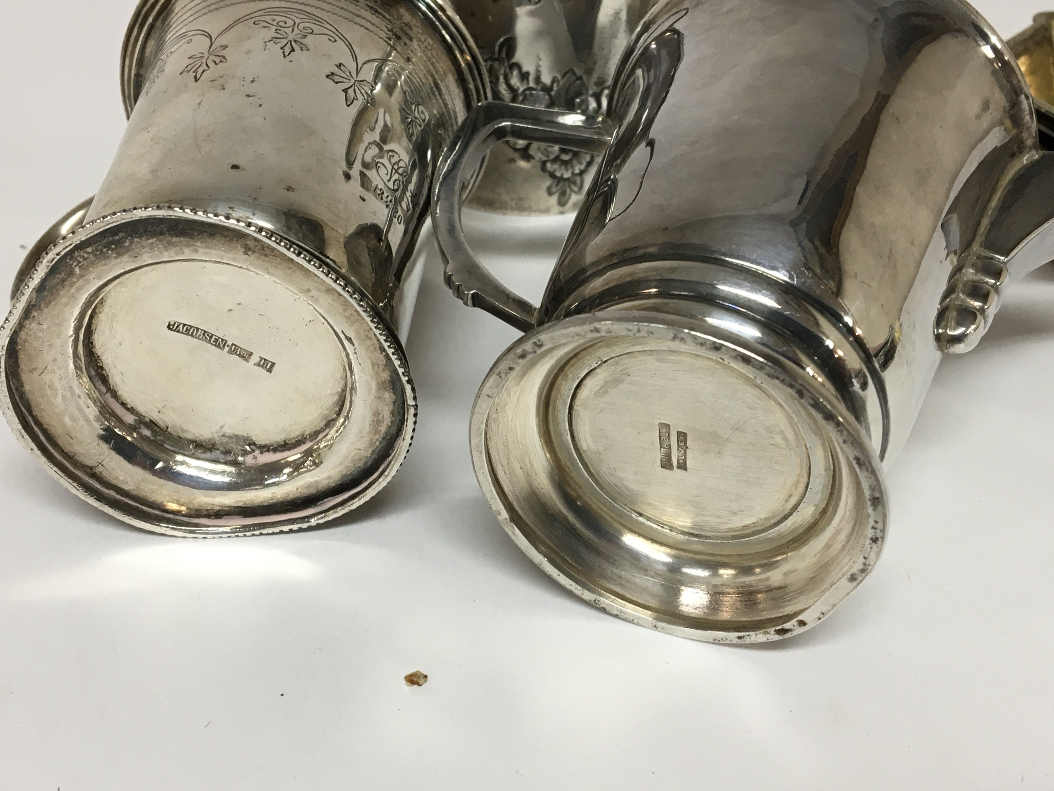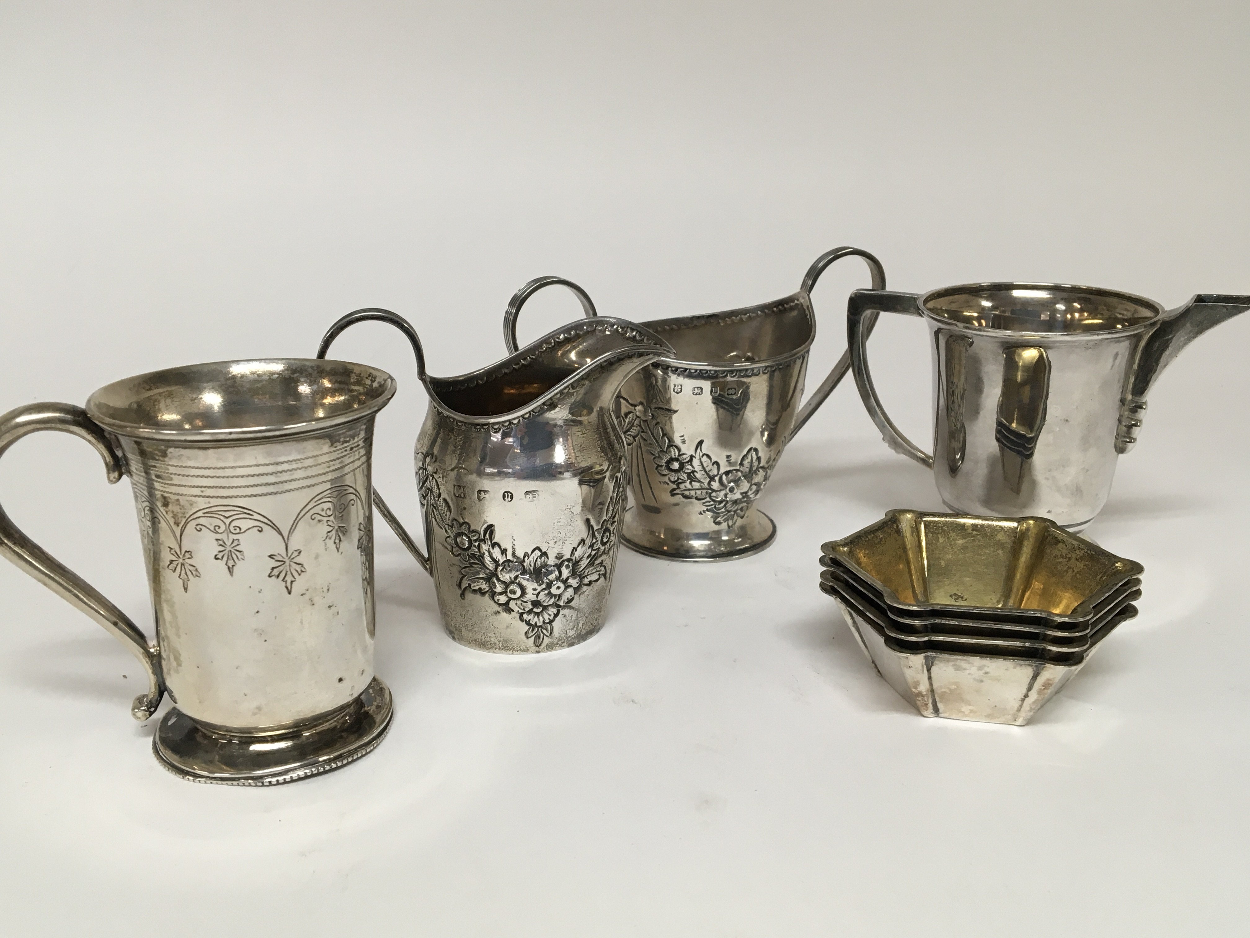 A silver cream jug with matching sugar bowl a Sterling silver Art Deco design jug a white metal small tankard and a set of four salt cellars