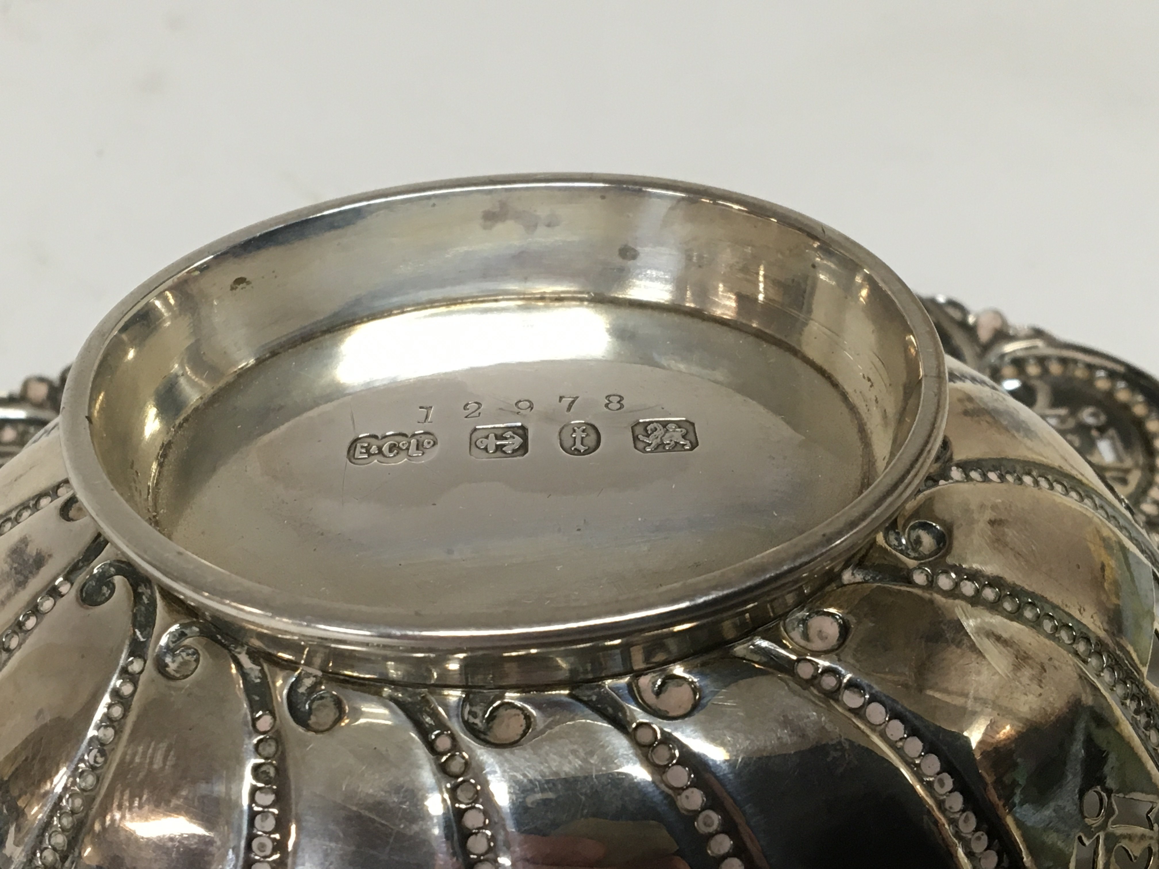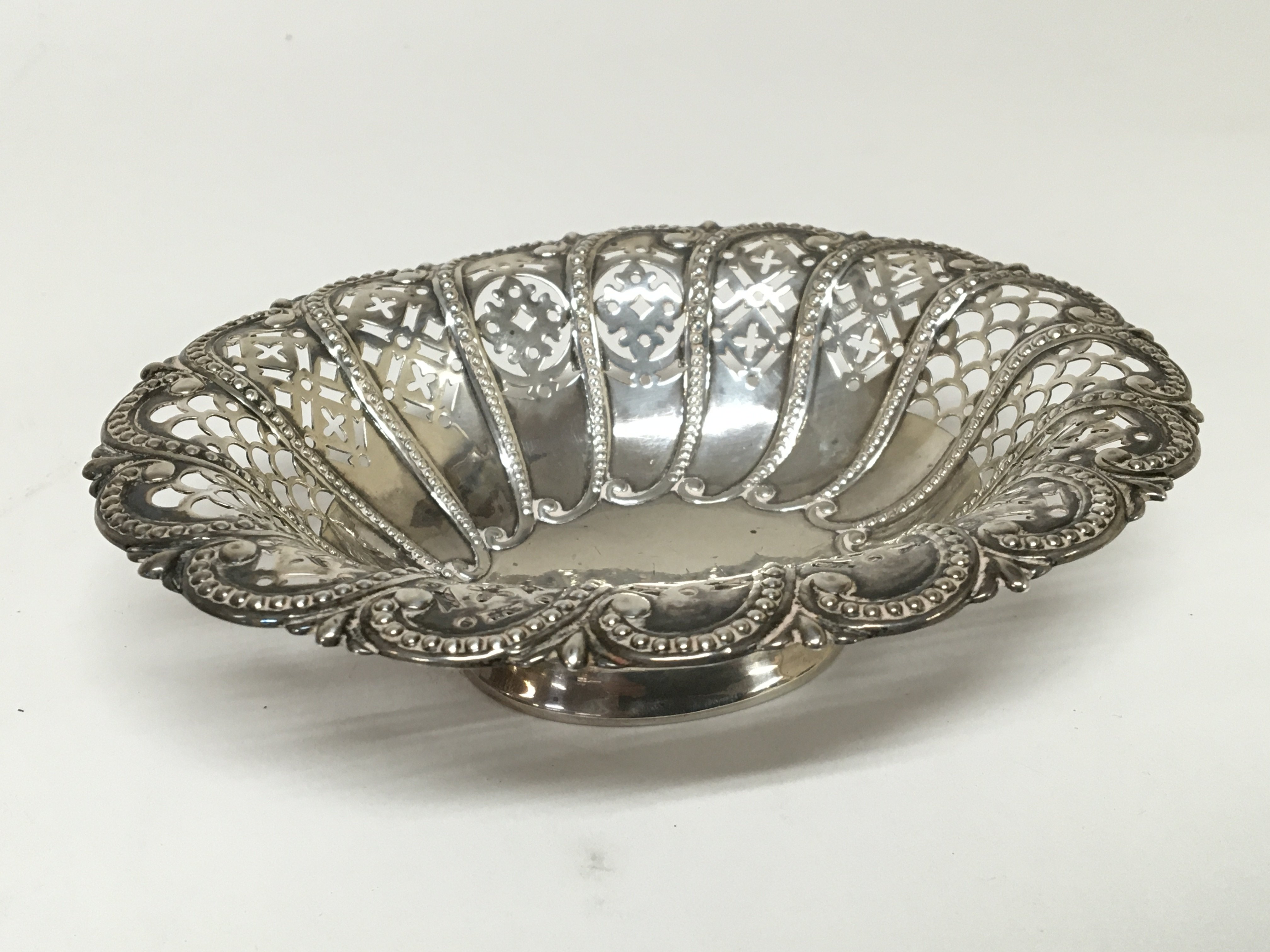 A silver dish with a pierced edge Birmingham hallmarks. Diameter 15cm (no obvious damage)