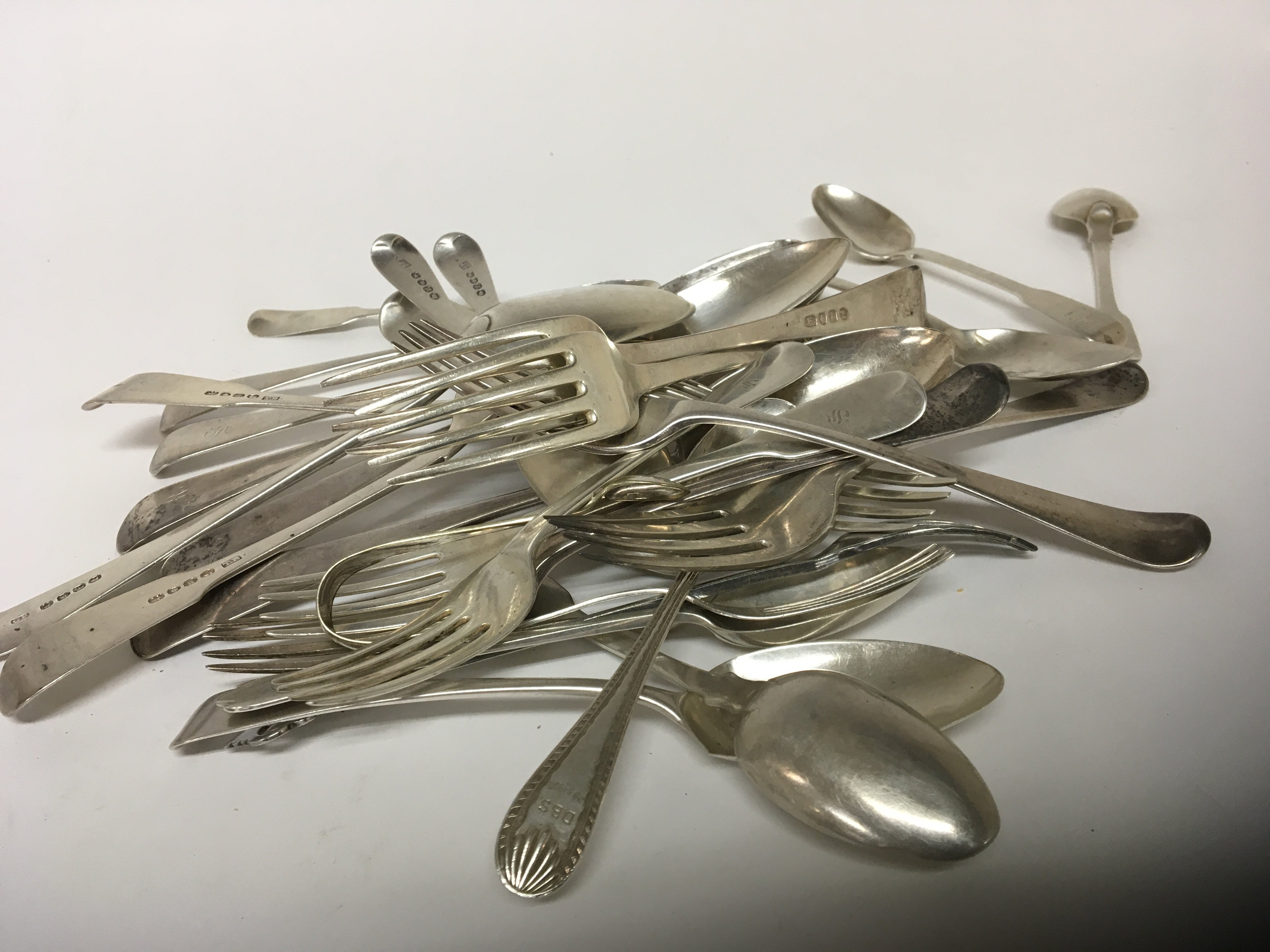A Collection of silver cutlery including George III cutlery and other later mixed dates and makers total weight approximately 1.3kg.