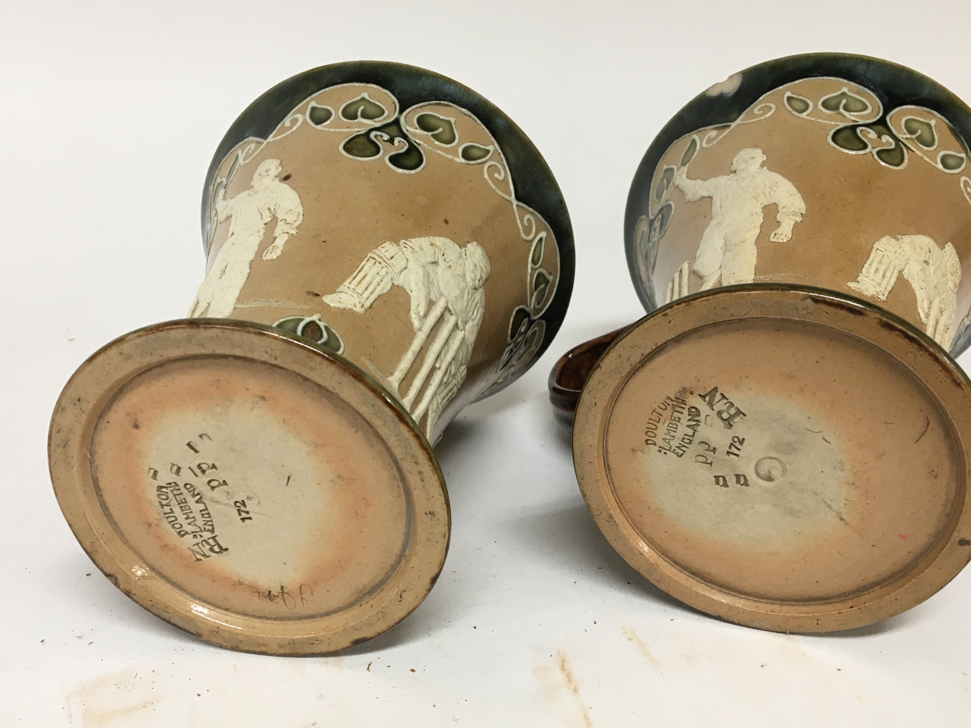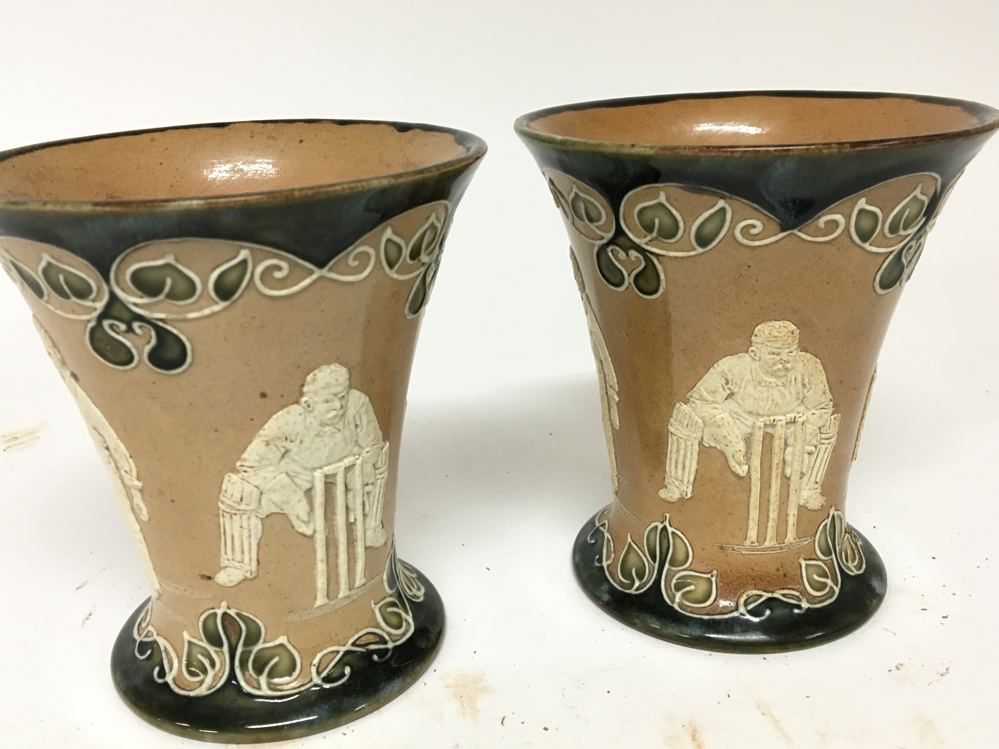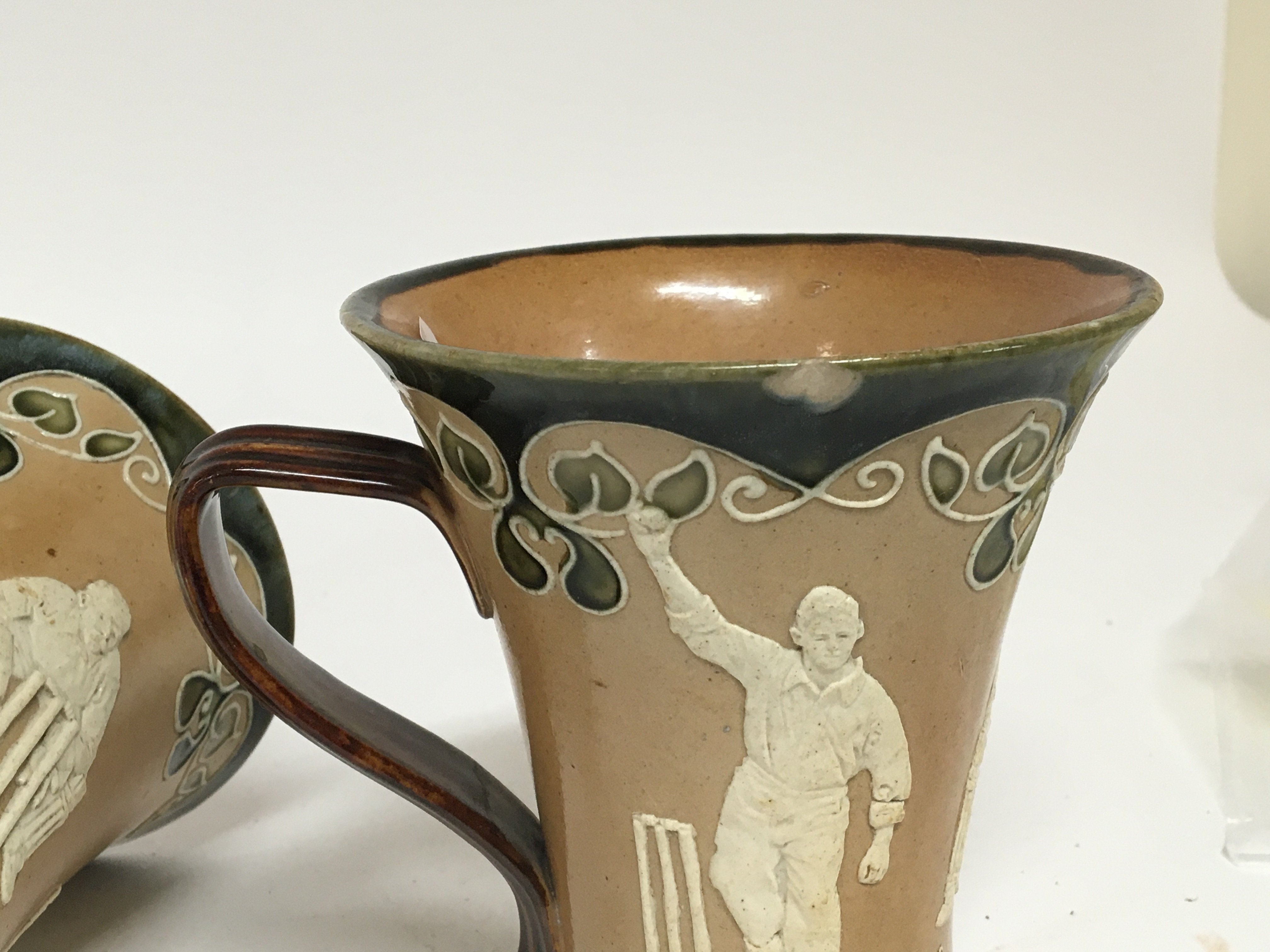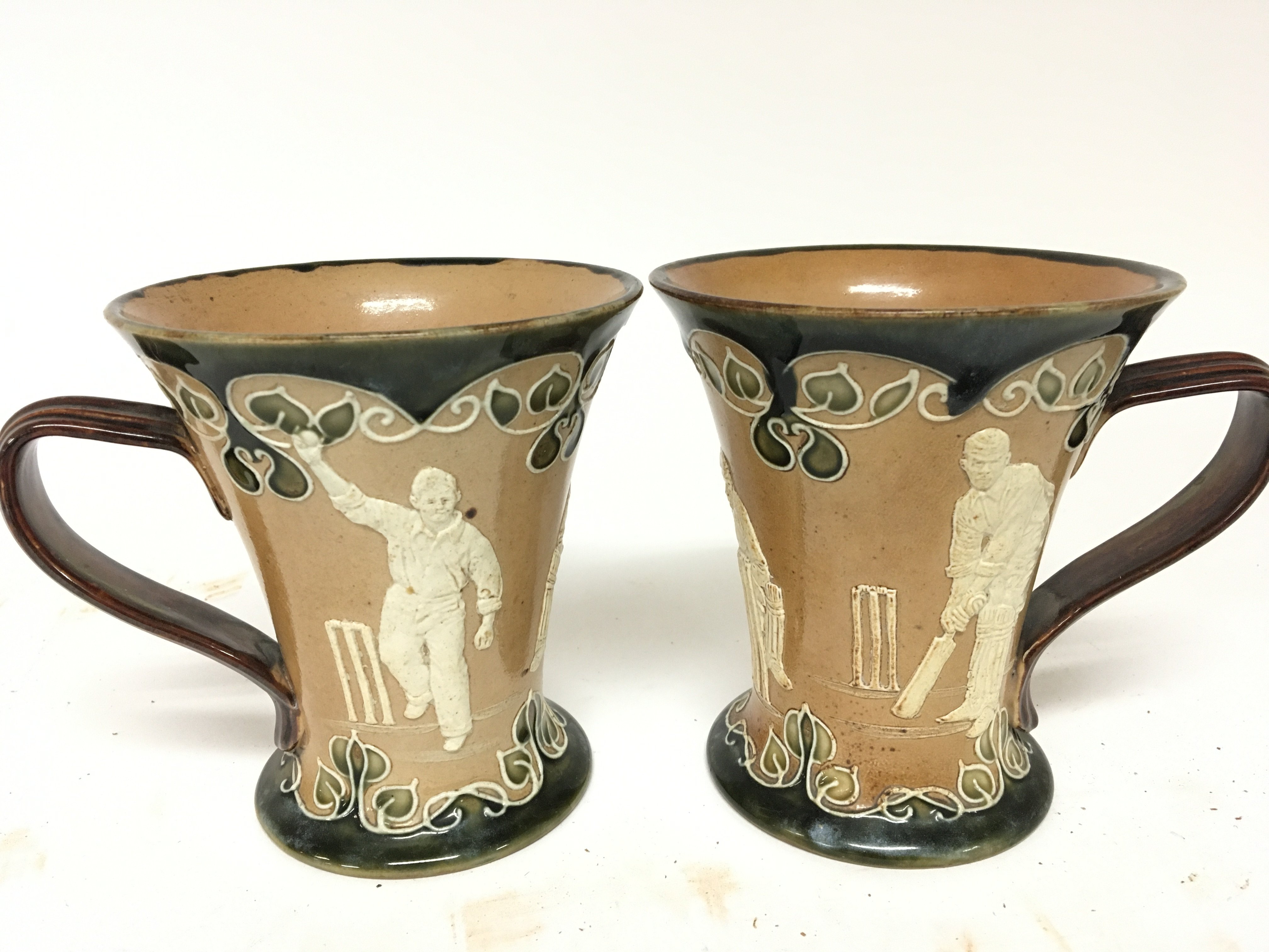 Two Matching Lambeth Doulton stoneware mugs decorated with raised cricket figures impressed marks to the base one with a small chip. Height 12.5cm