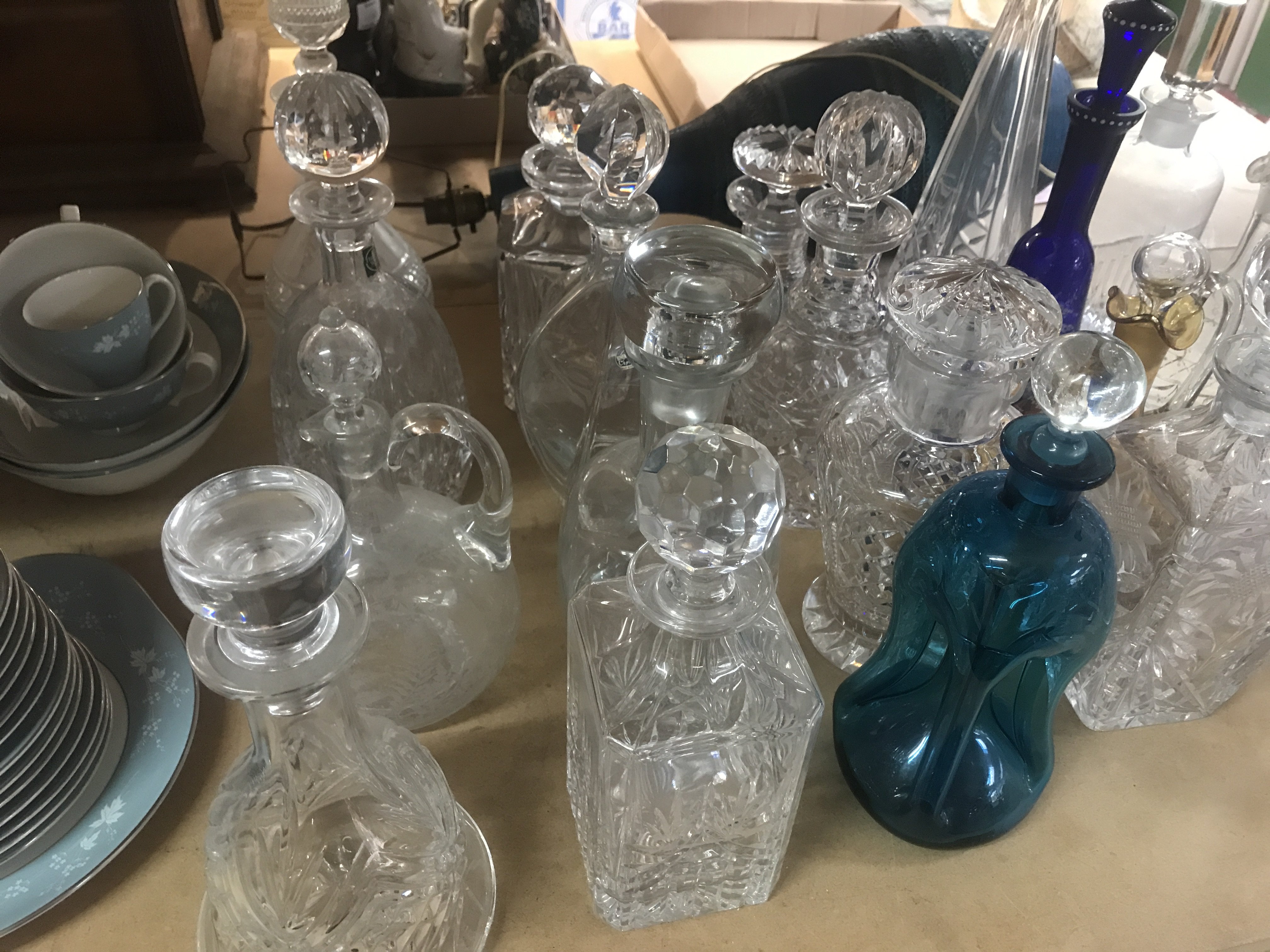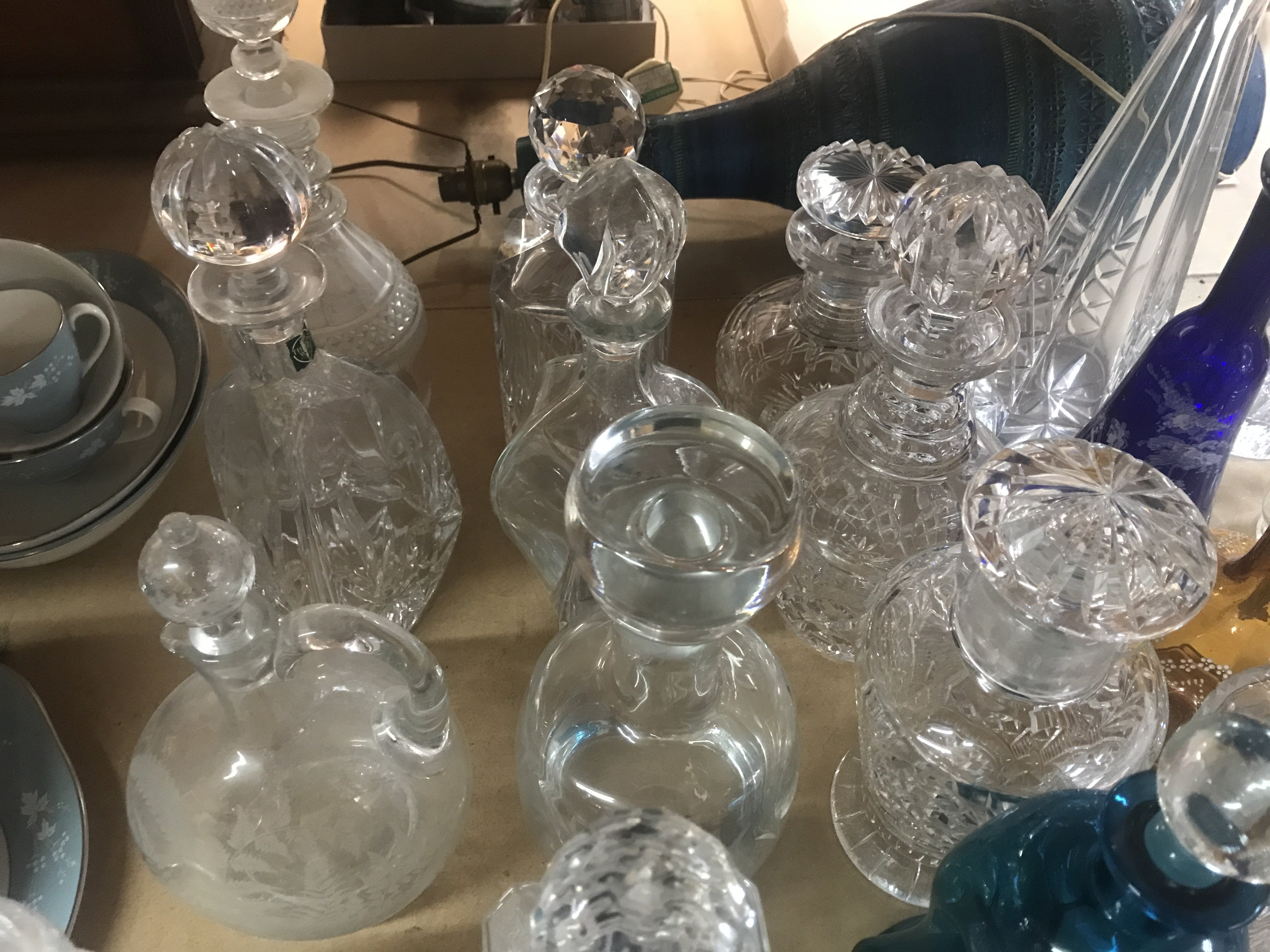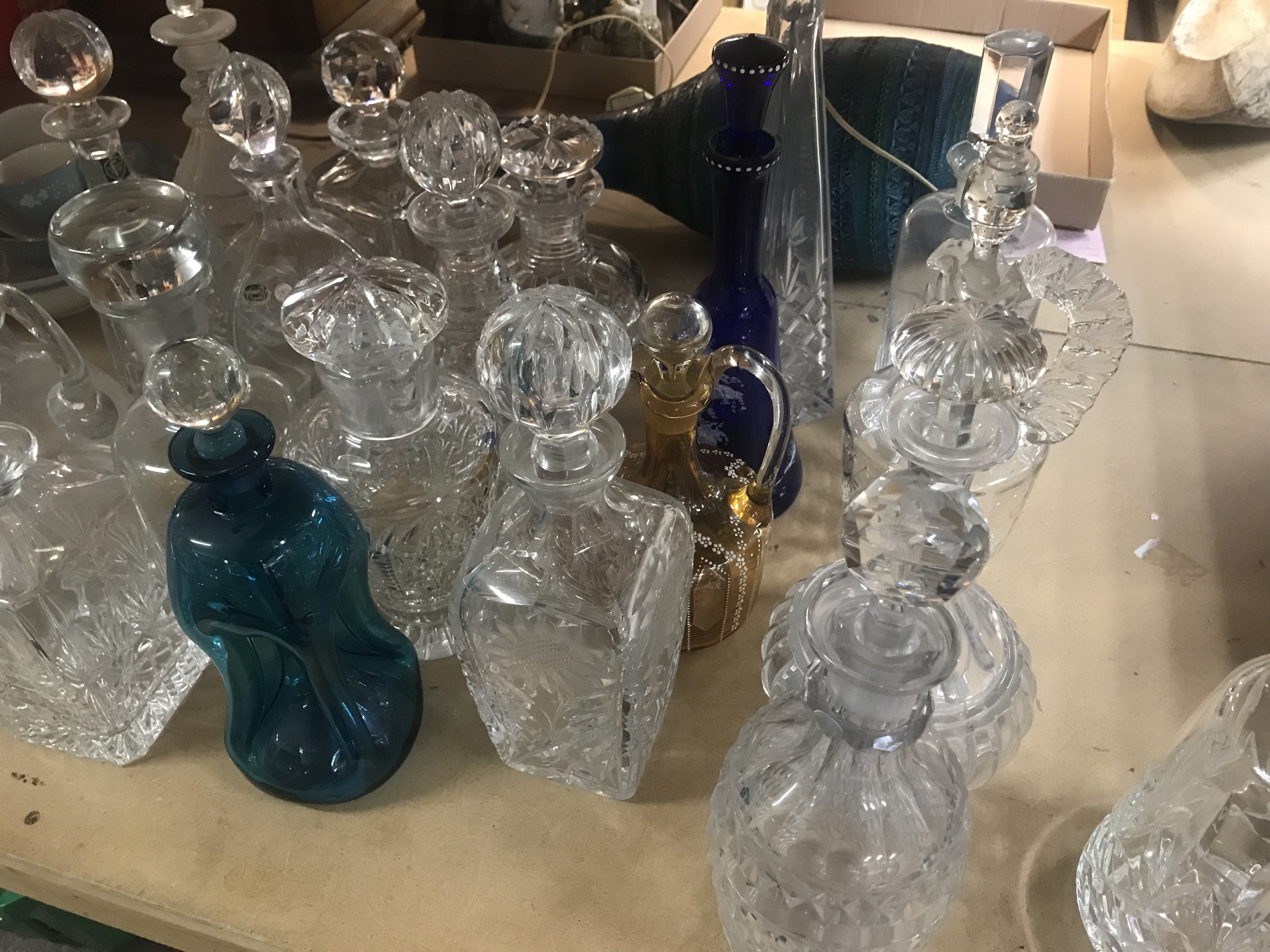 A collection of decanters including some cut glass and coloured glass examples. Approximately 21 decanters.