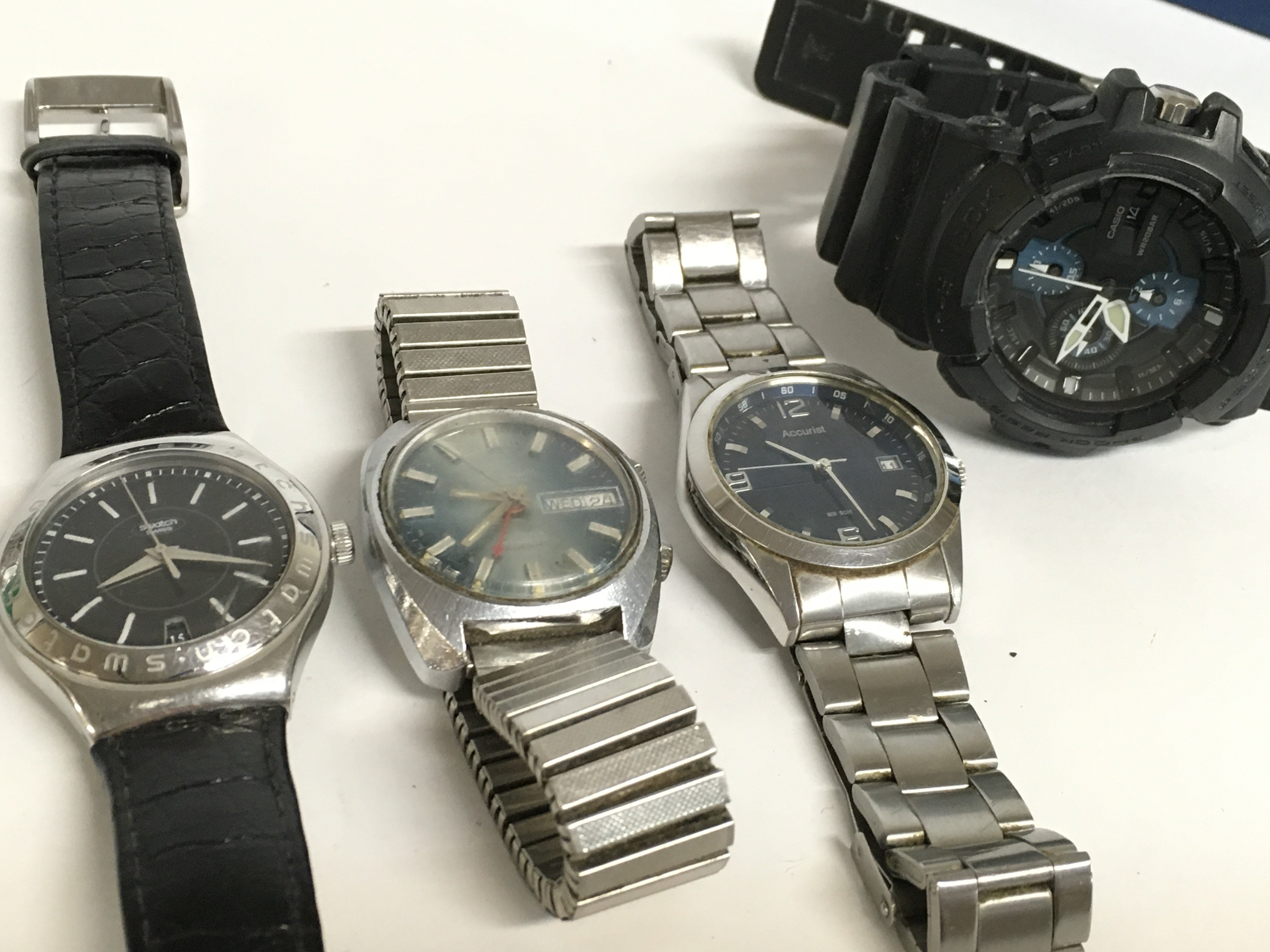 A collection of vintage mens watches including a cased Rotary, Accurist, Casio, Swatch, Ingersoll pocket watch etc. This lot cannot be posted