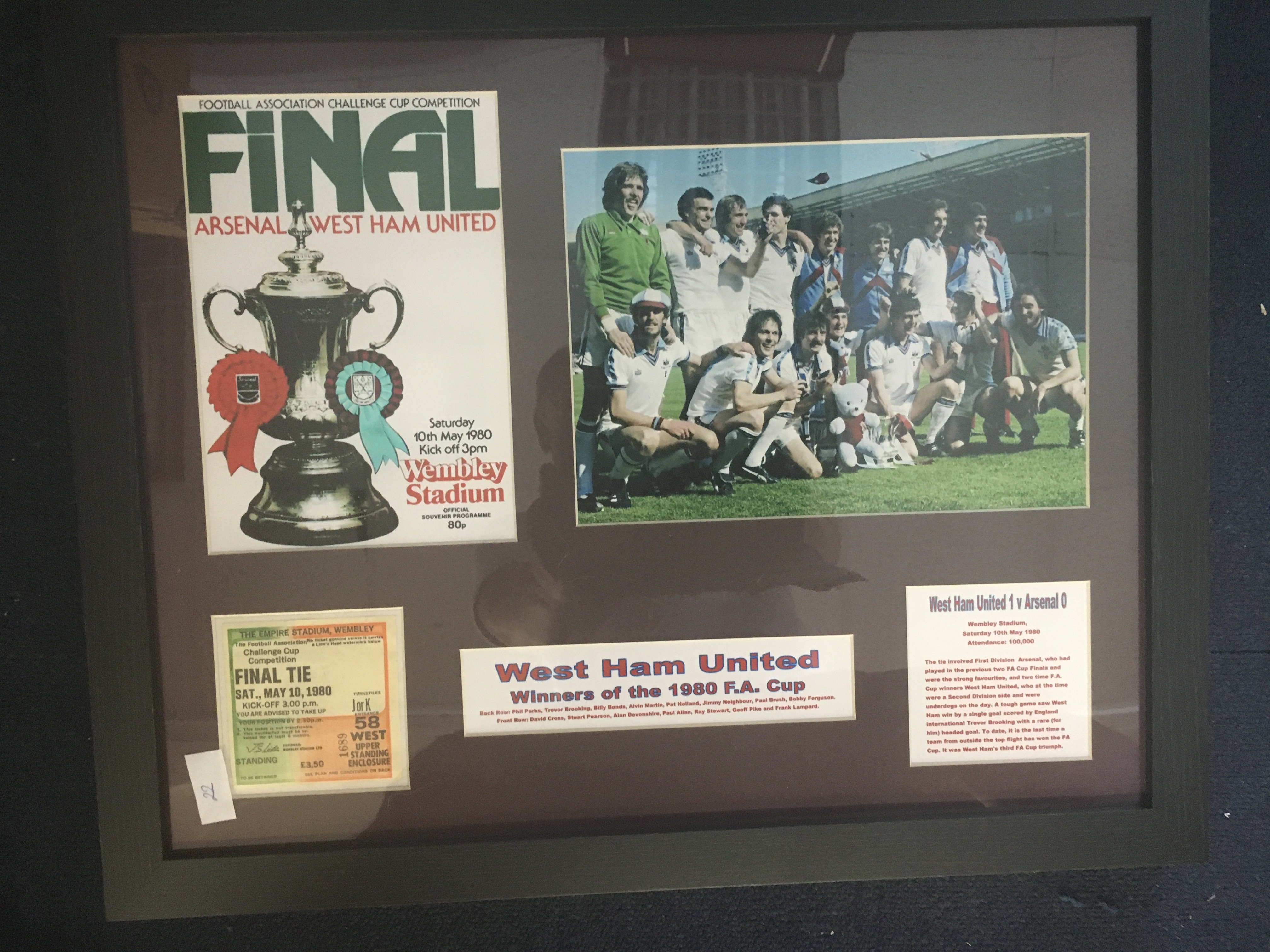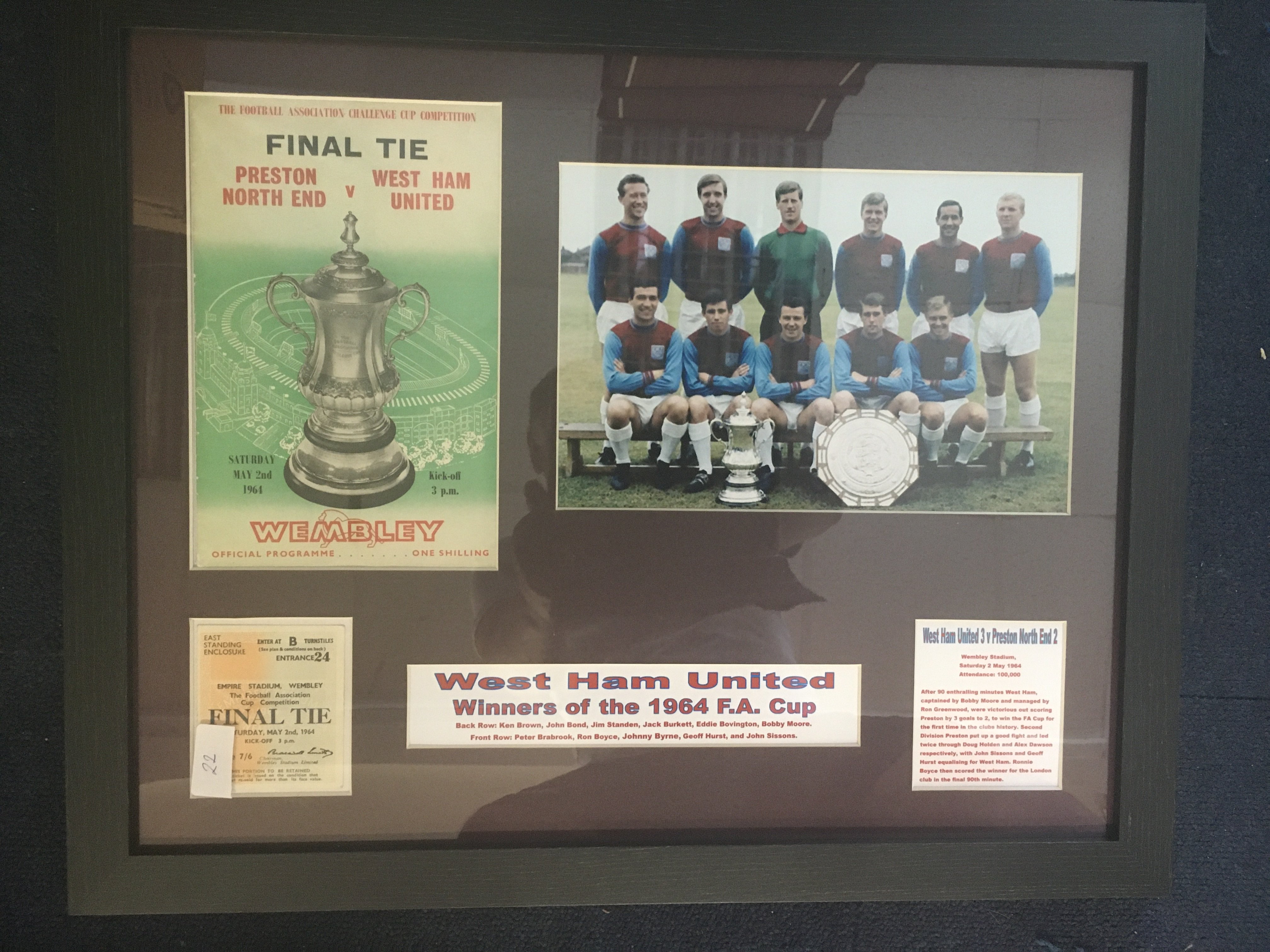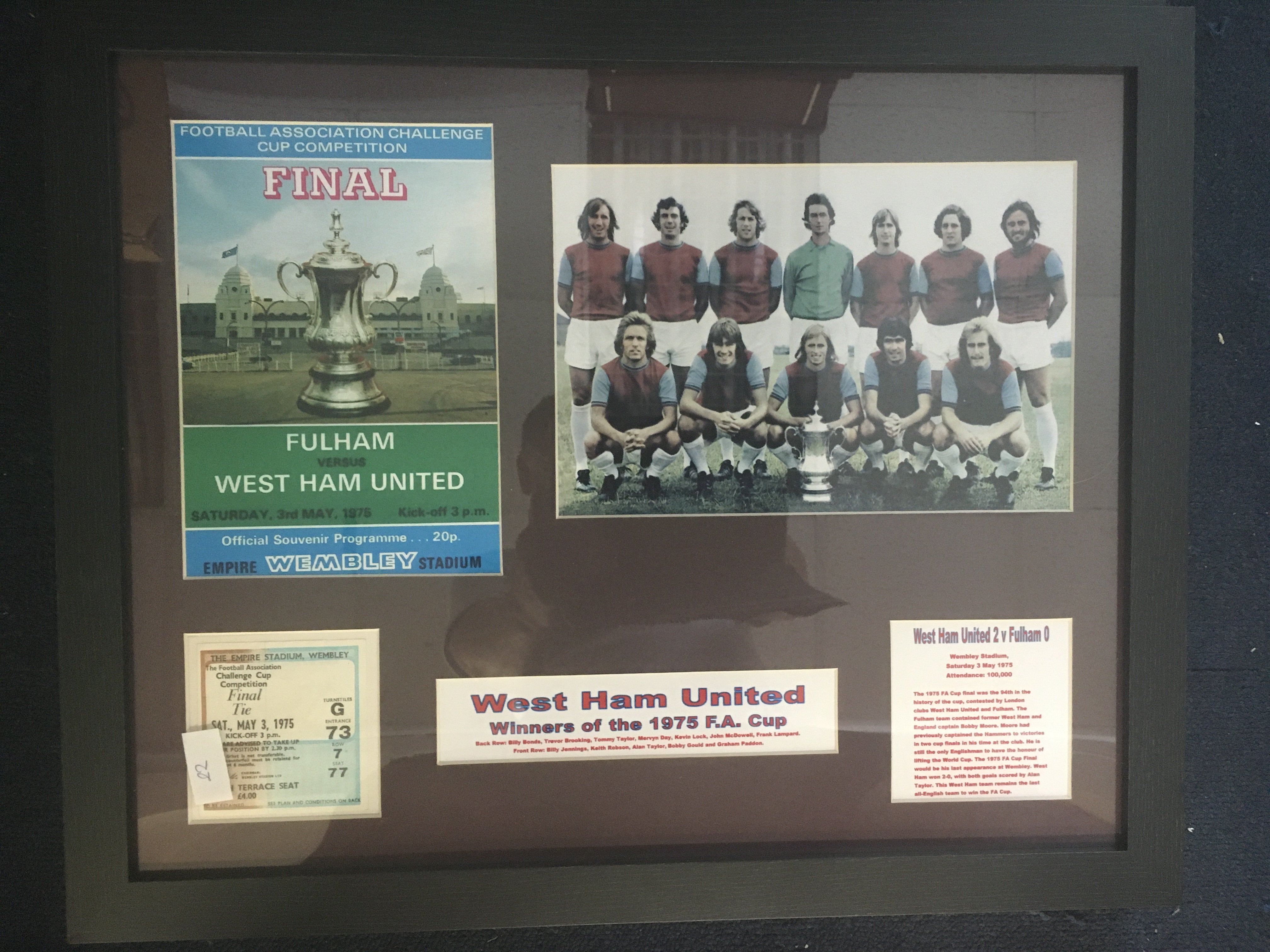 West Ham FA Cup Winning Framed Displays: Team picture programme and match ticket plus information covering the cup wins of 64 75 and 80. All 3 in matching frames with tickets believed to be original. Not for posting. (3)