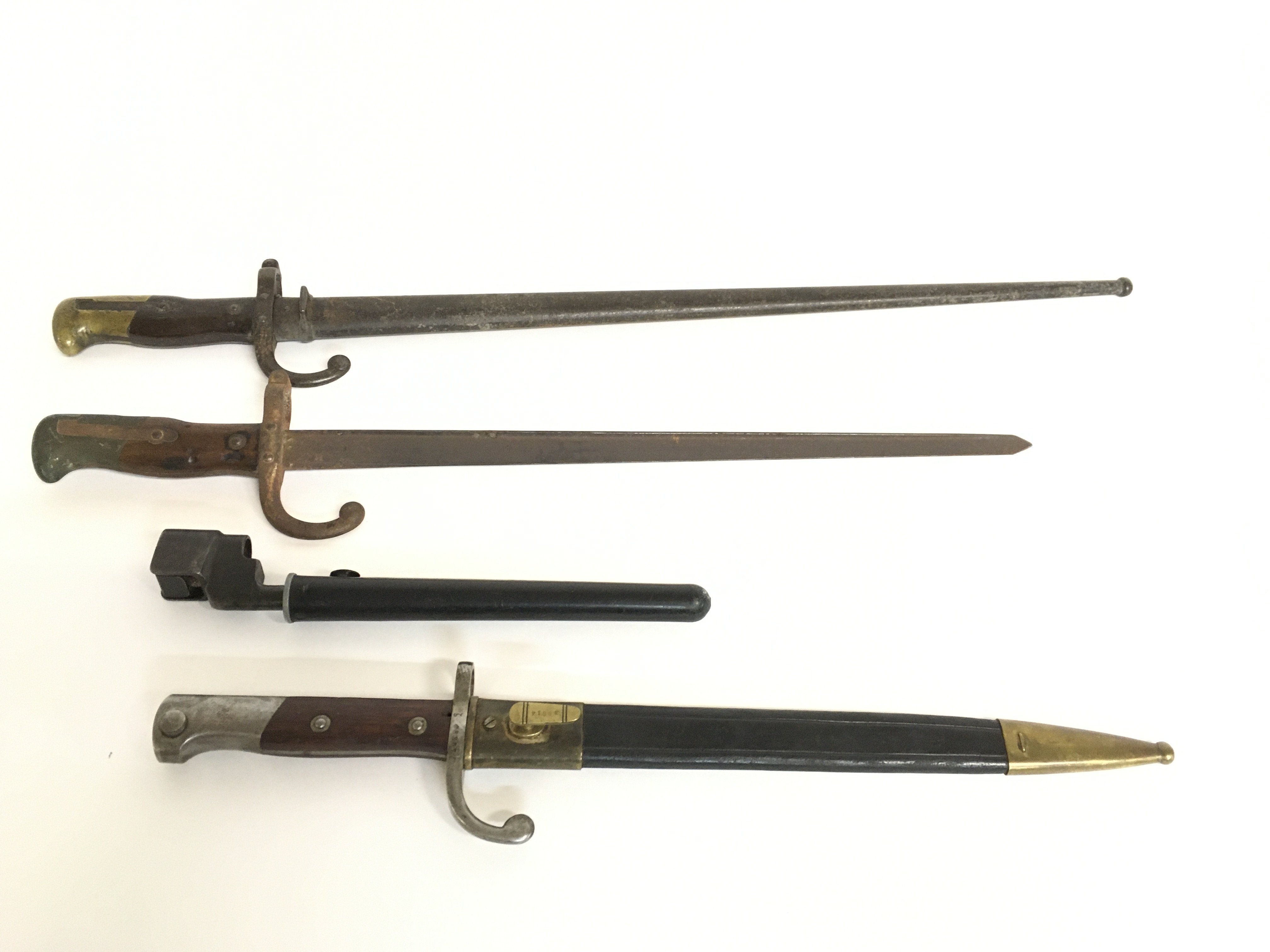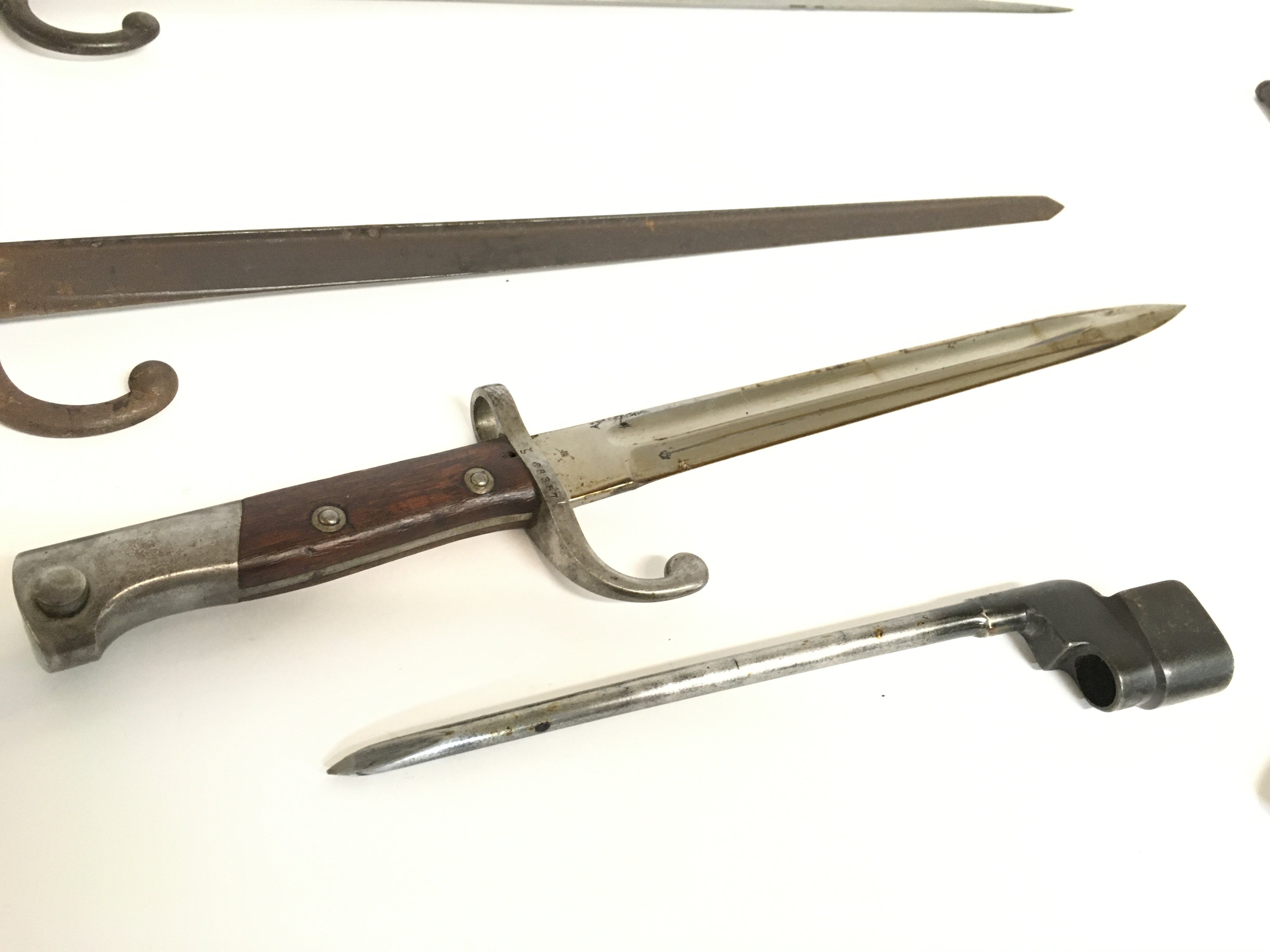 Bayonets including a German example, a British spike bayonet and French examples. Ranging from 26.5 to 65.5cm long.