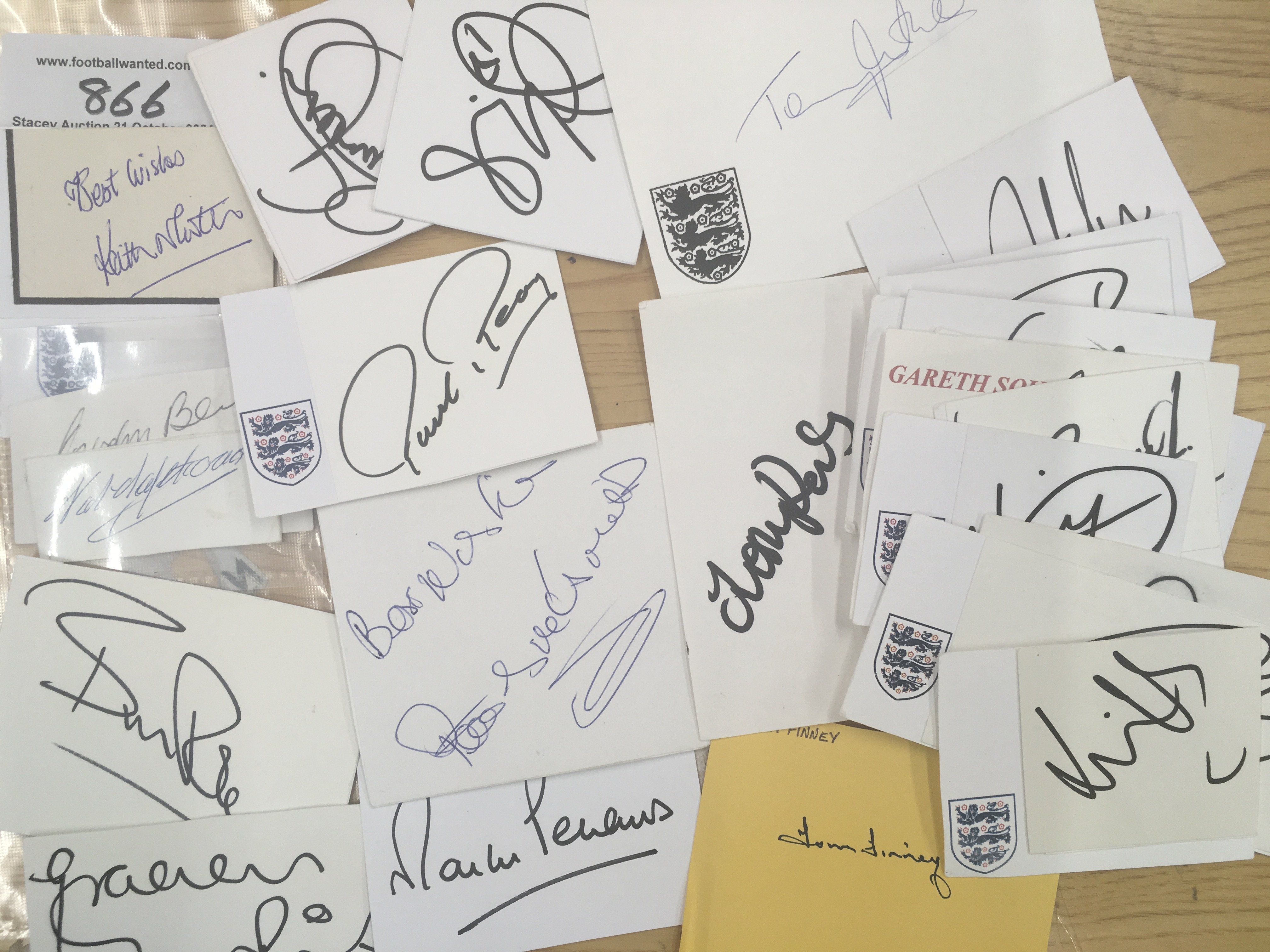 England Signed White Card Collection: All sizes signed in biro or felt pen to include Finney Southgate Adams Peters Waddle Banks Le Tissier Rix and Keith Newton. (28)