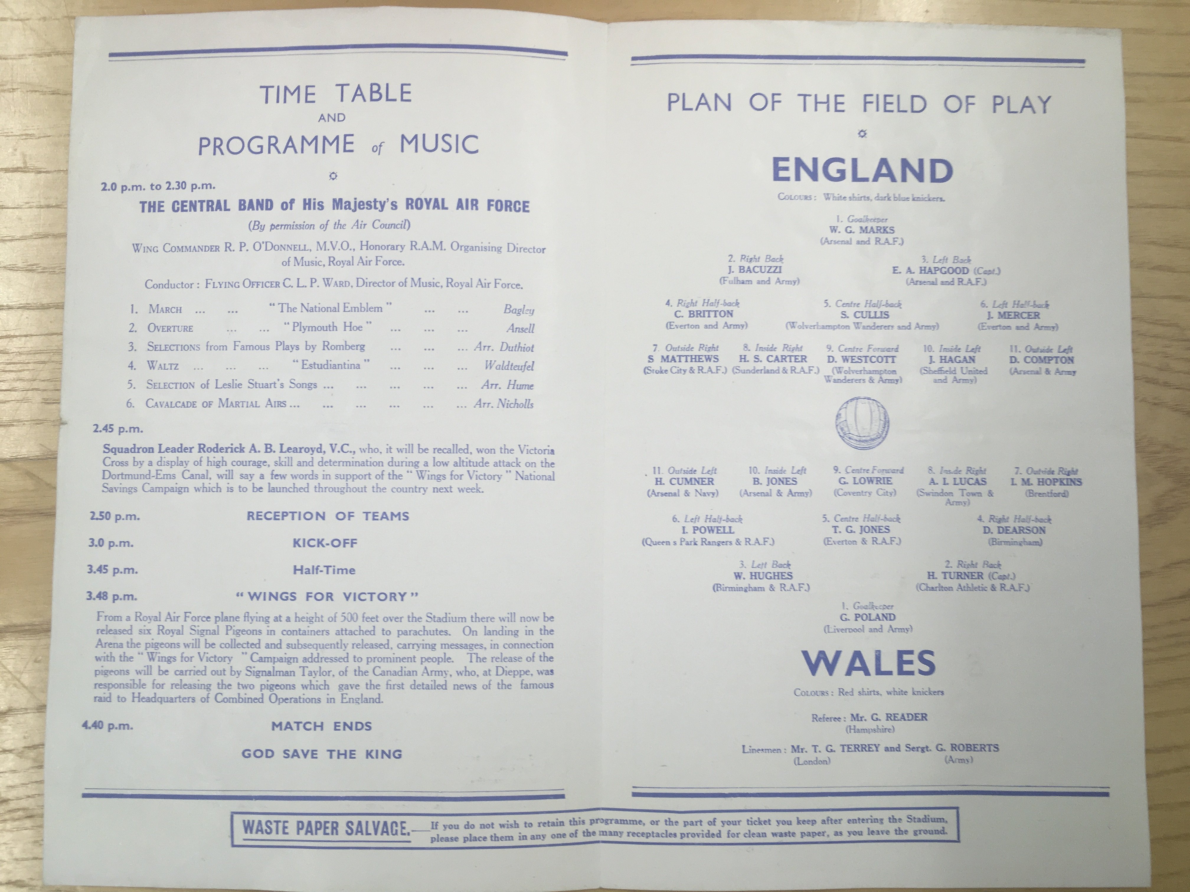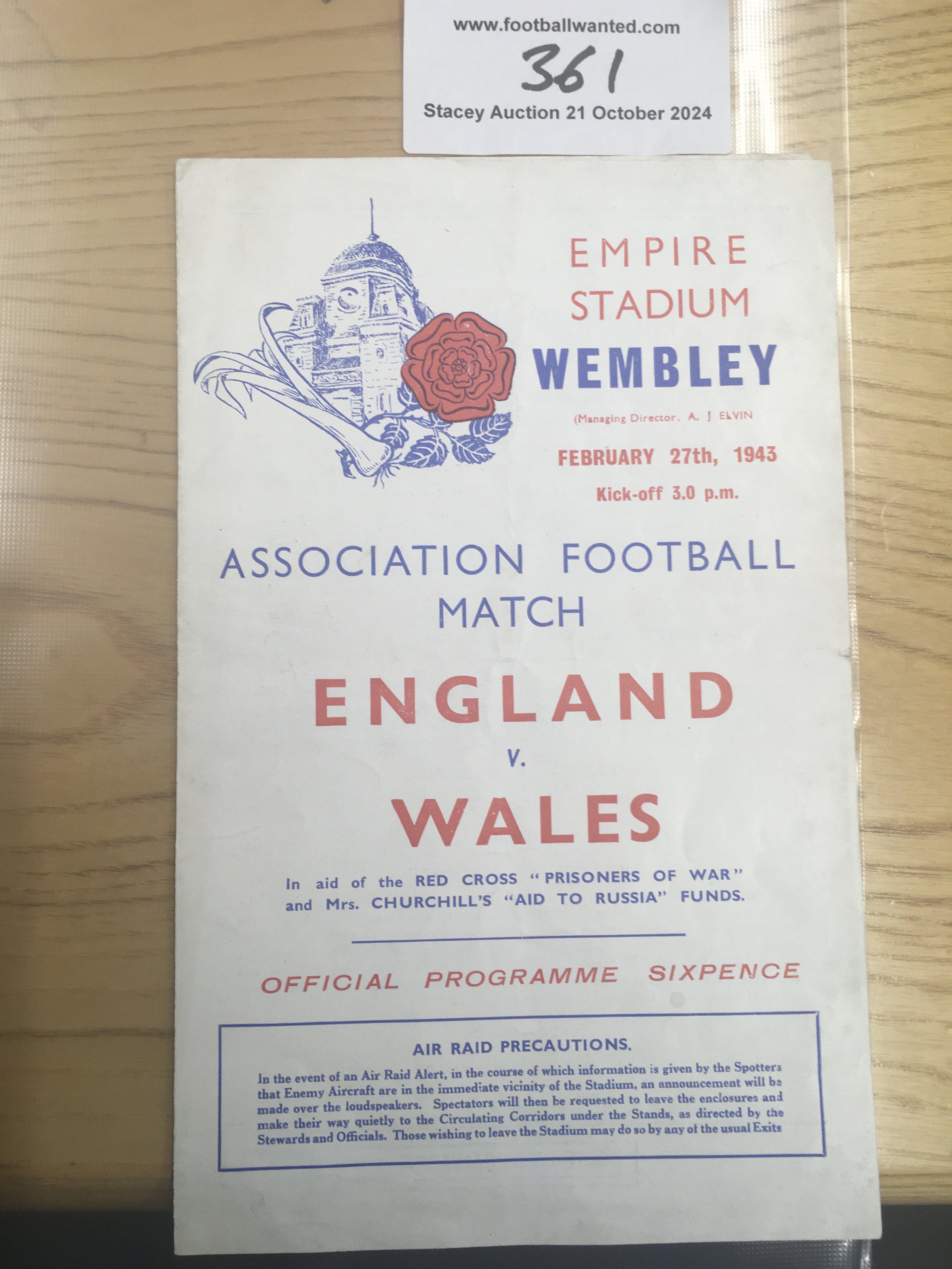 1943 England v Wales Football Programme: Very good condition 4 pager played at Wembley on 27 2 1943. No team changes. Lightest fold.