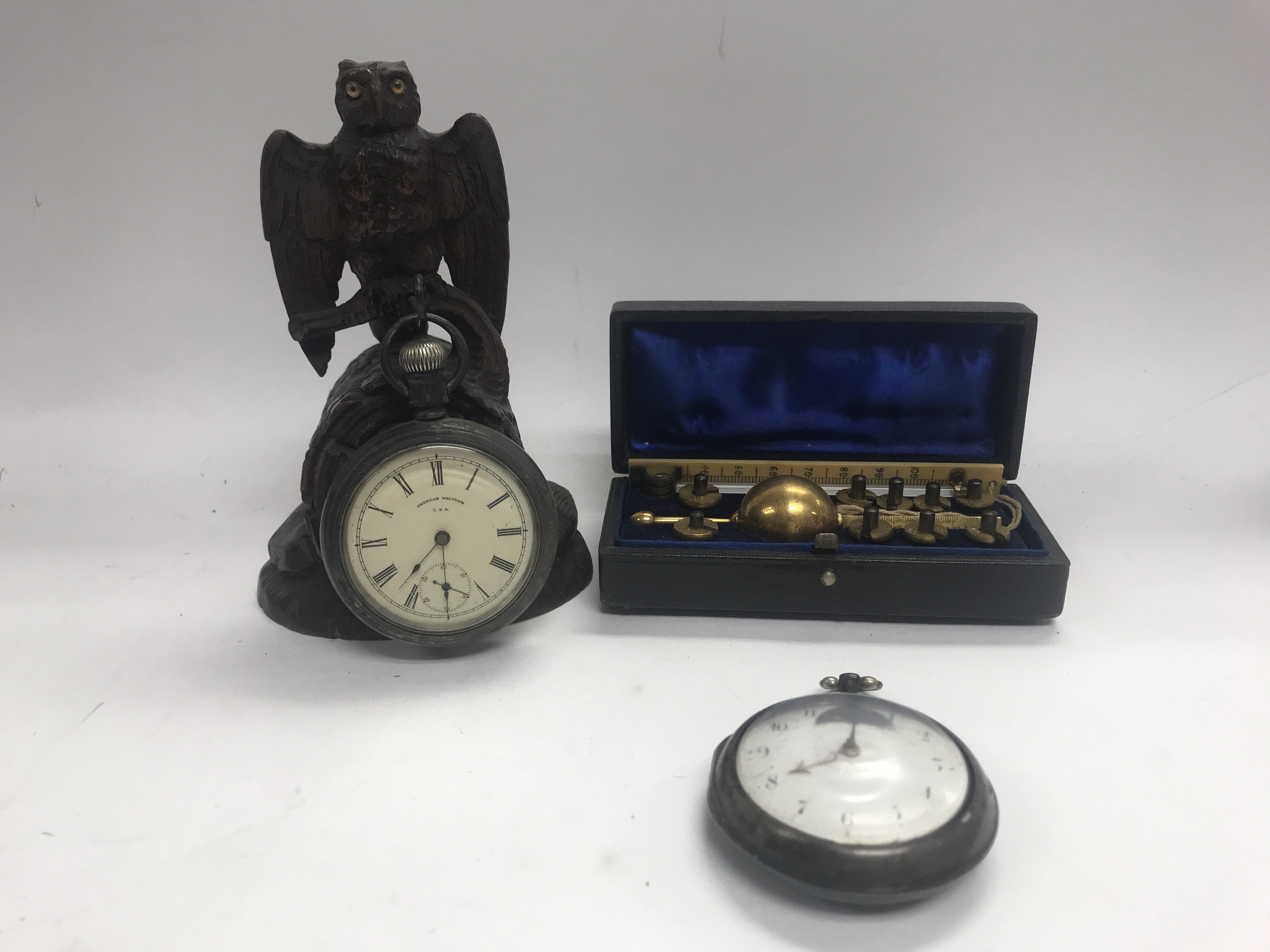 Two vintage pocket watches and an owl carved watch stand with a Sykes hydrometer.