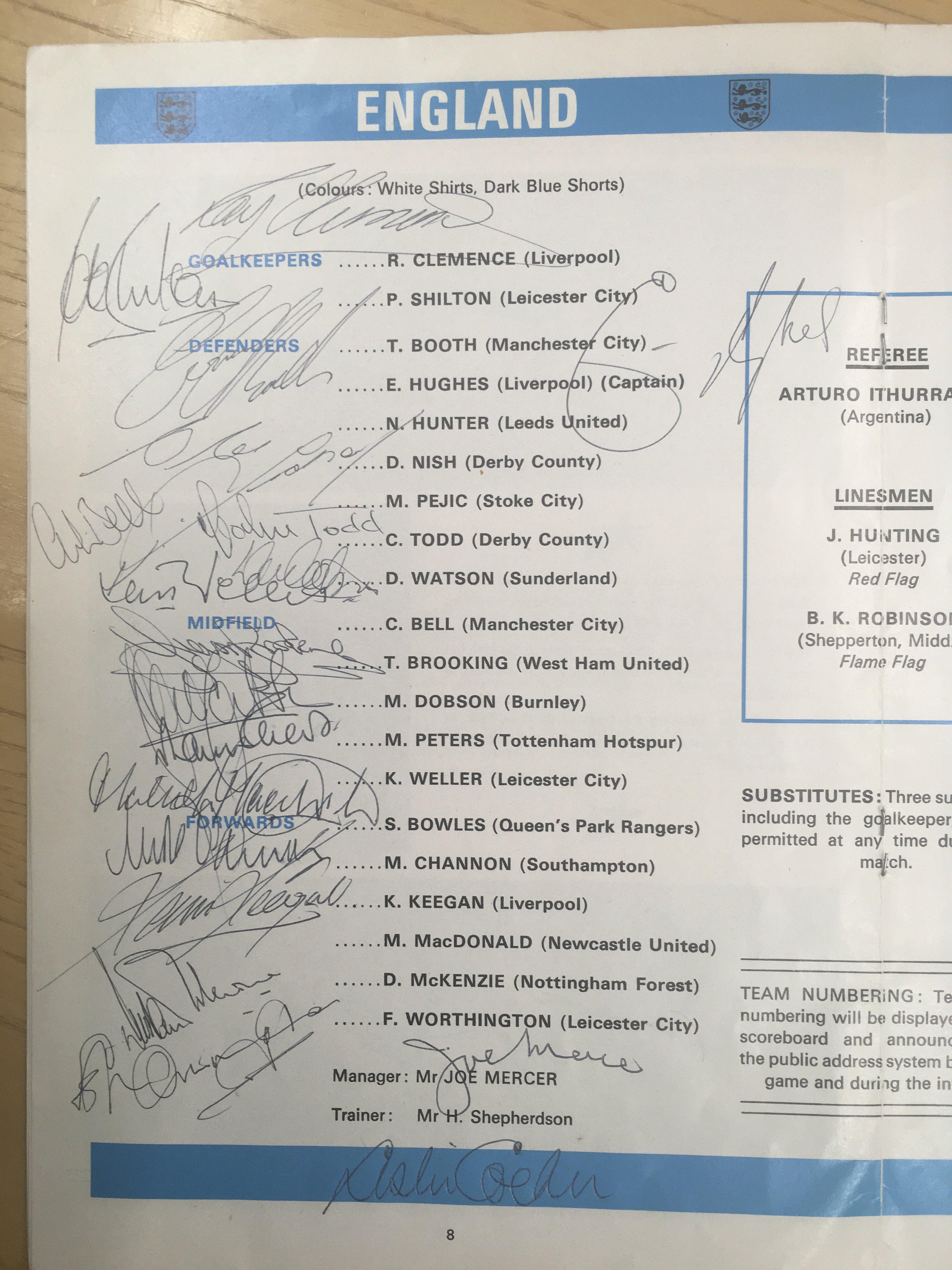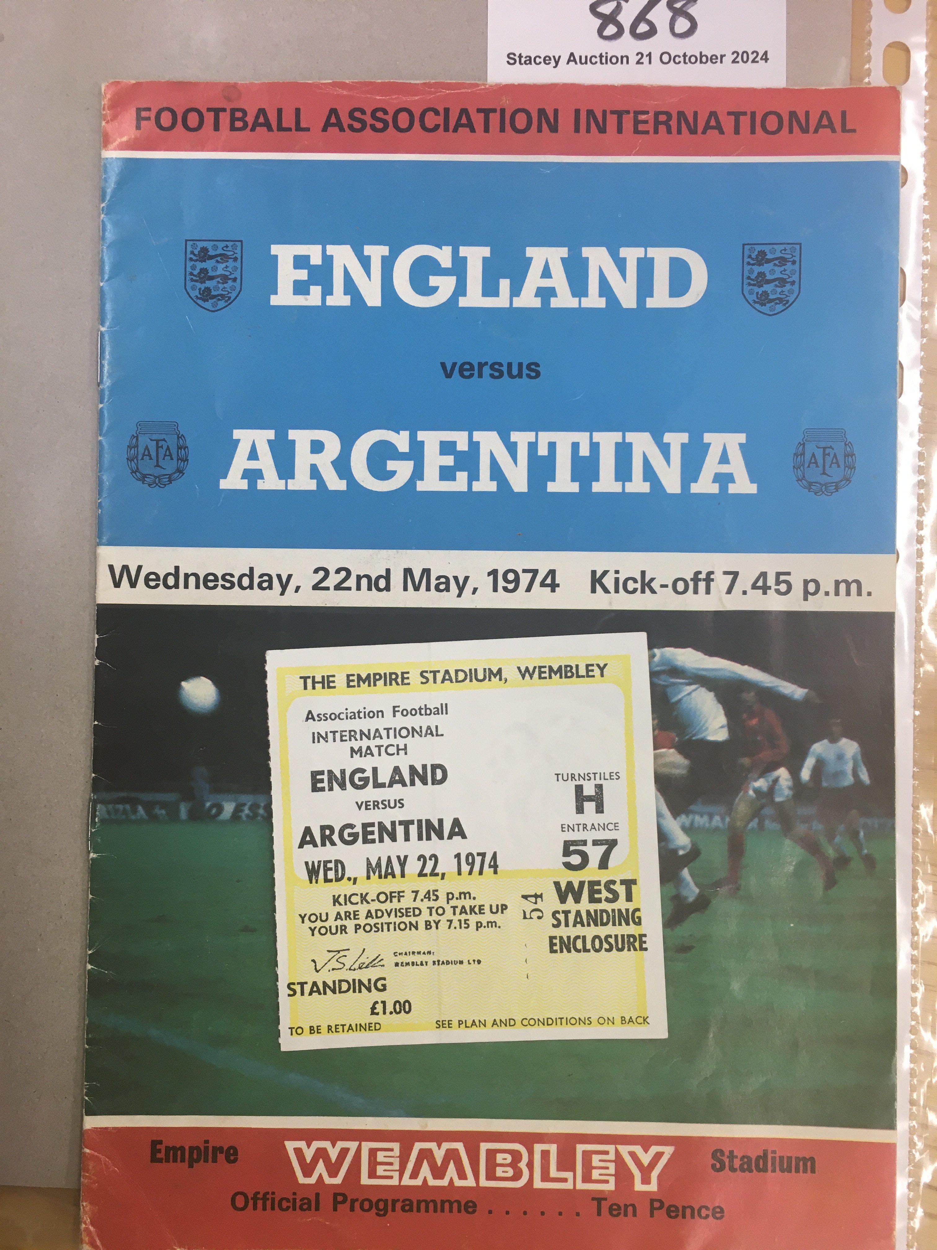 England 1974 Squad Signed Football Programme: England v Argentina programme signed on team page by 18 including Cocker Mercer Hughes Peters Clemence Shilton Bell Keegan Todd and Brooking. C/W ticket.