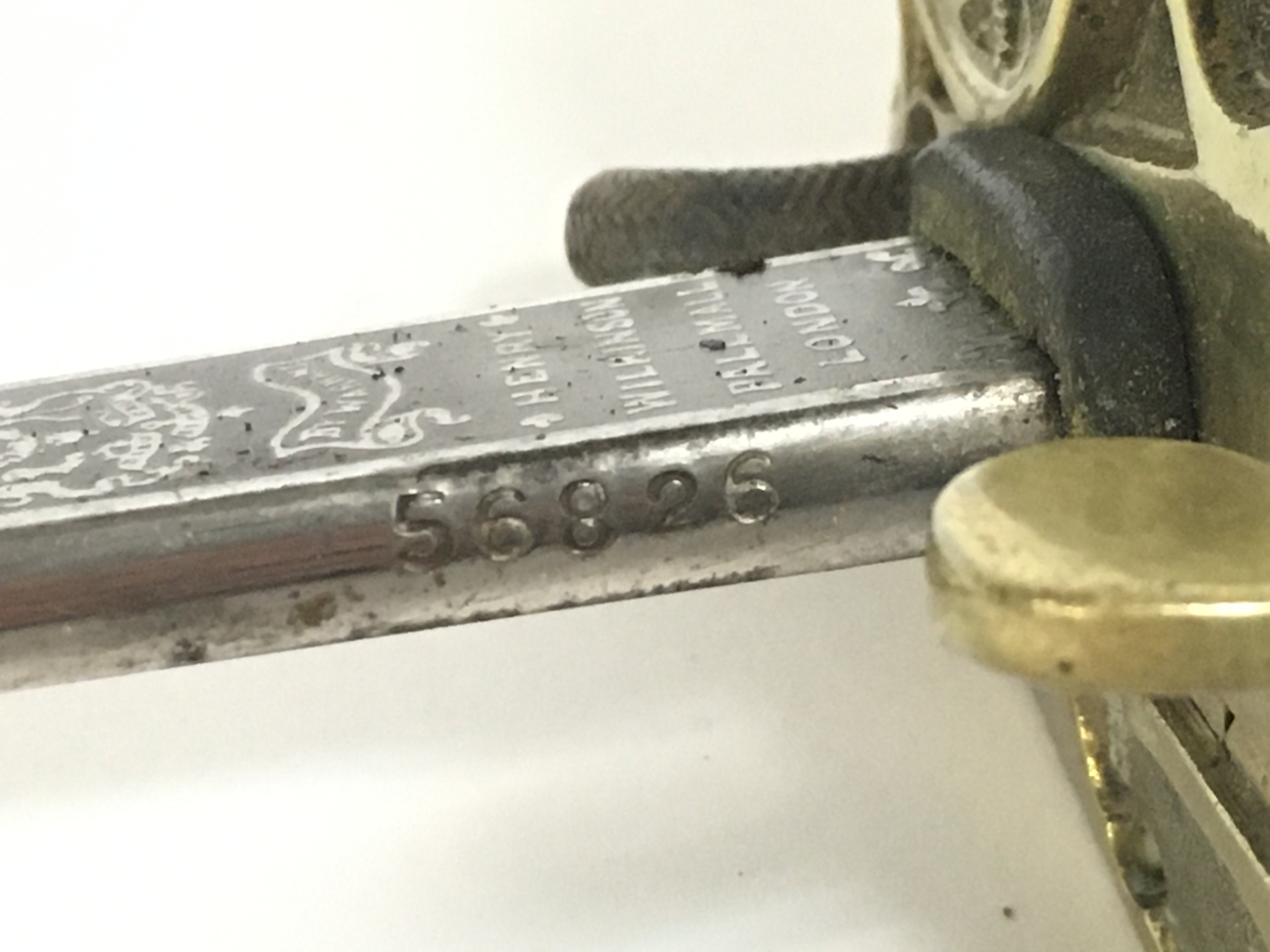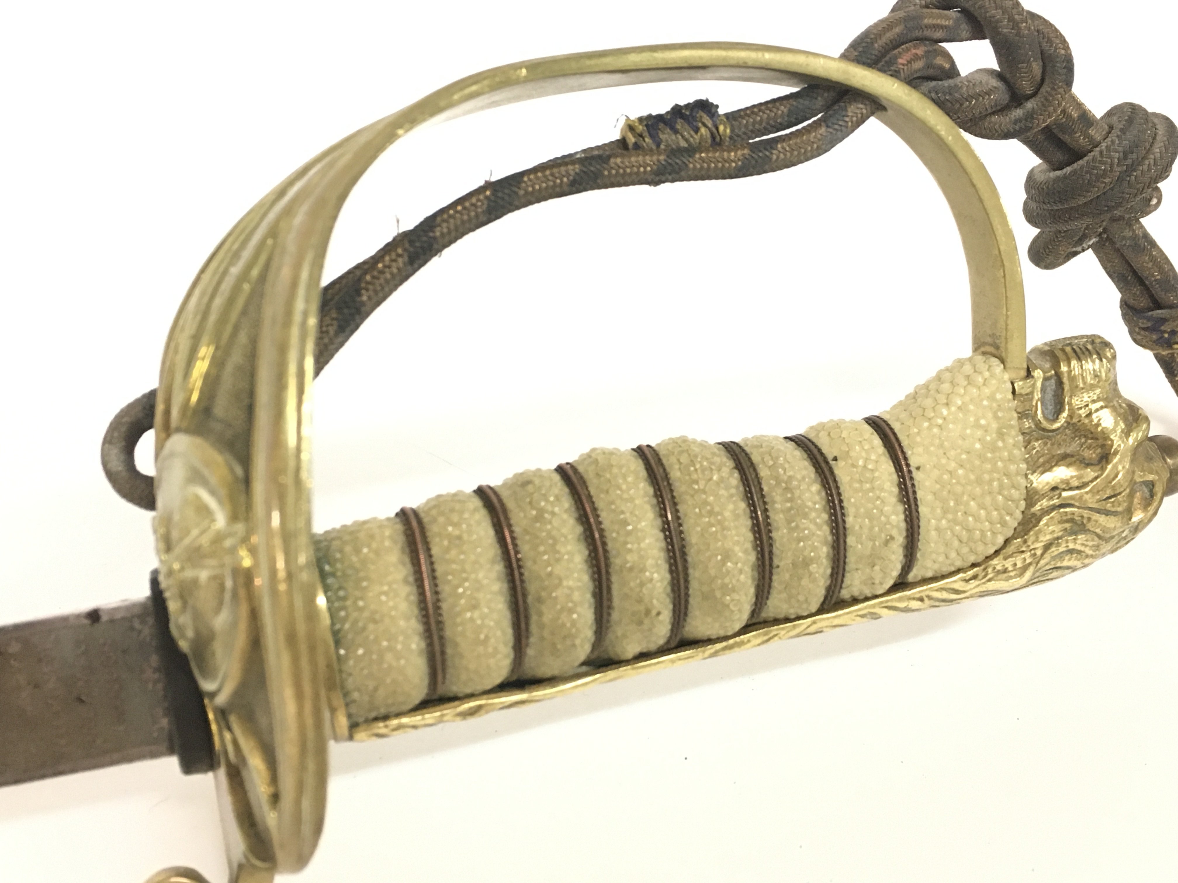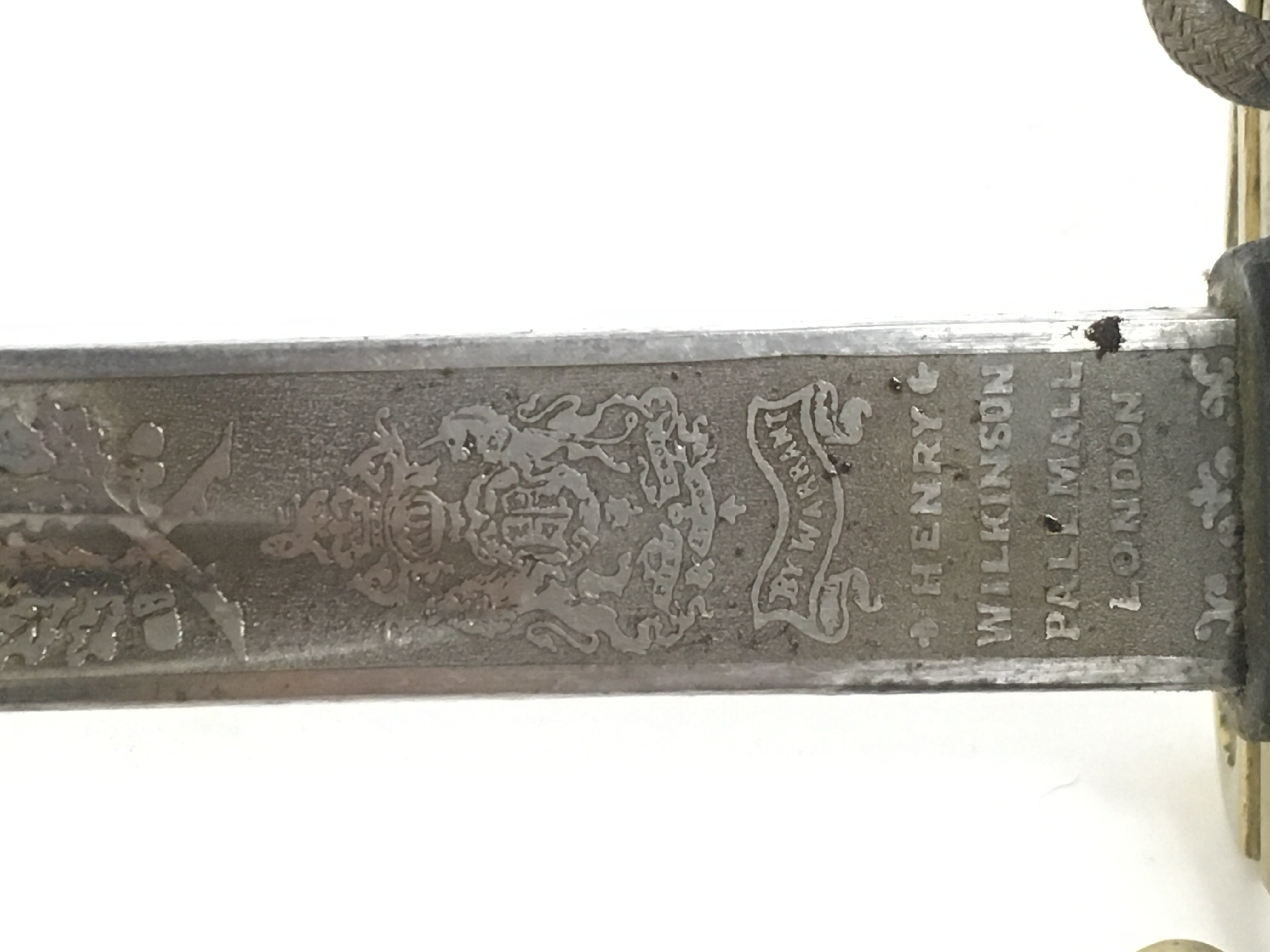A 19th Century British Naval officers sword with leather scabbard. 32 Inch ornately decorated blade marked London made, C.S.S, Made by Henry Wilkinson Pall Mall London. Hilt features a crown and anchor plaque and lions head pommel. Serial number 56826. This lot cannot be posted