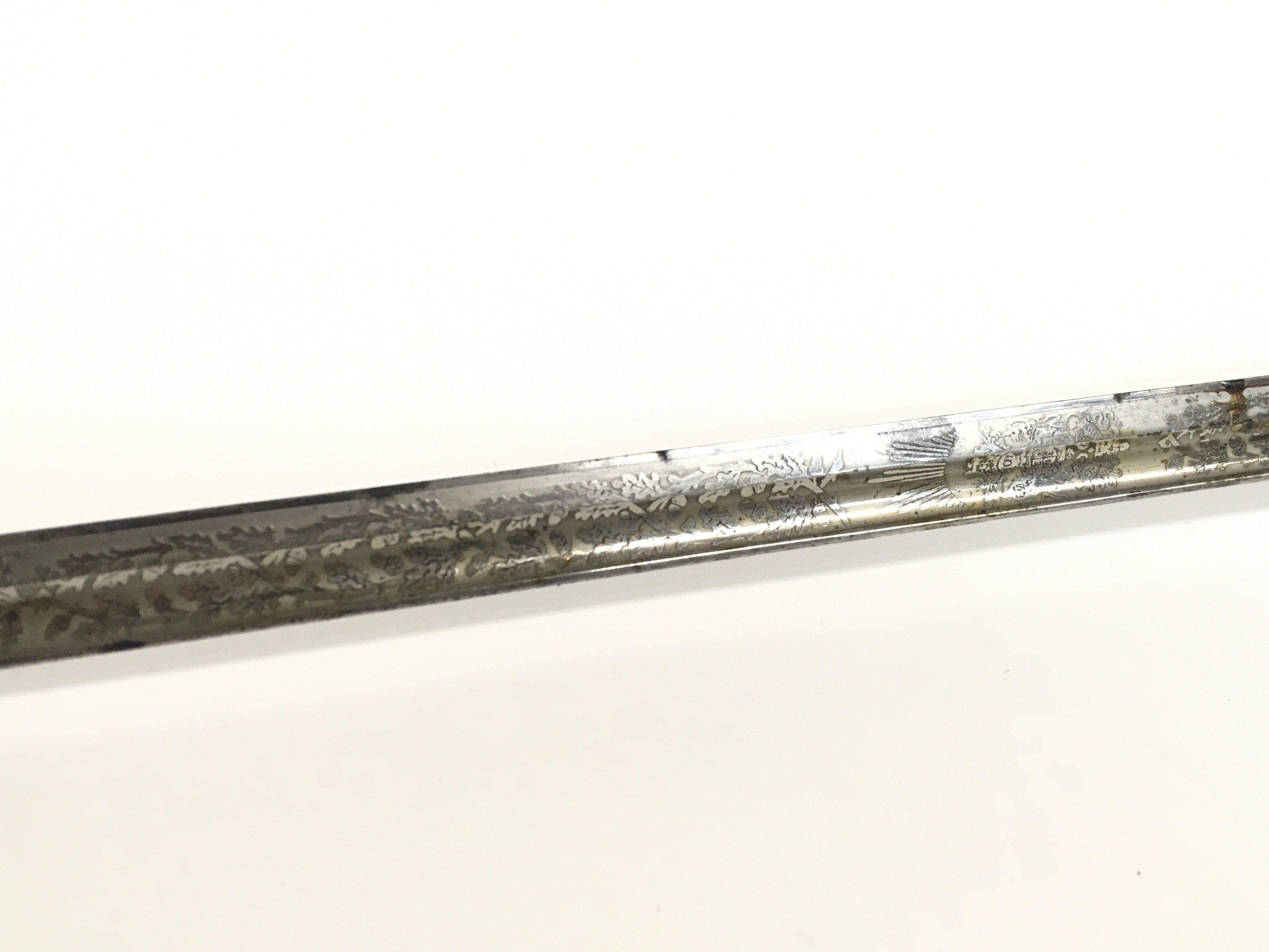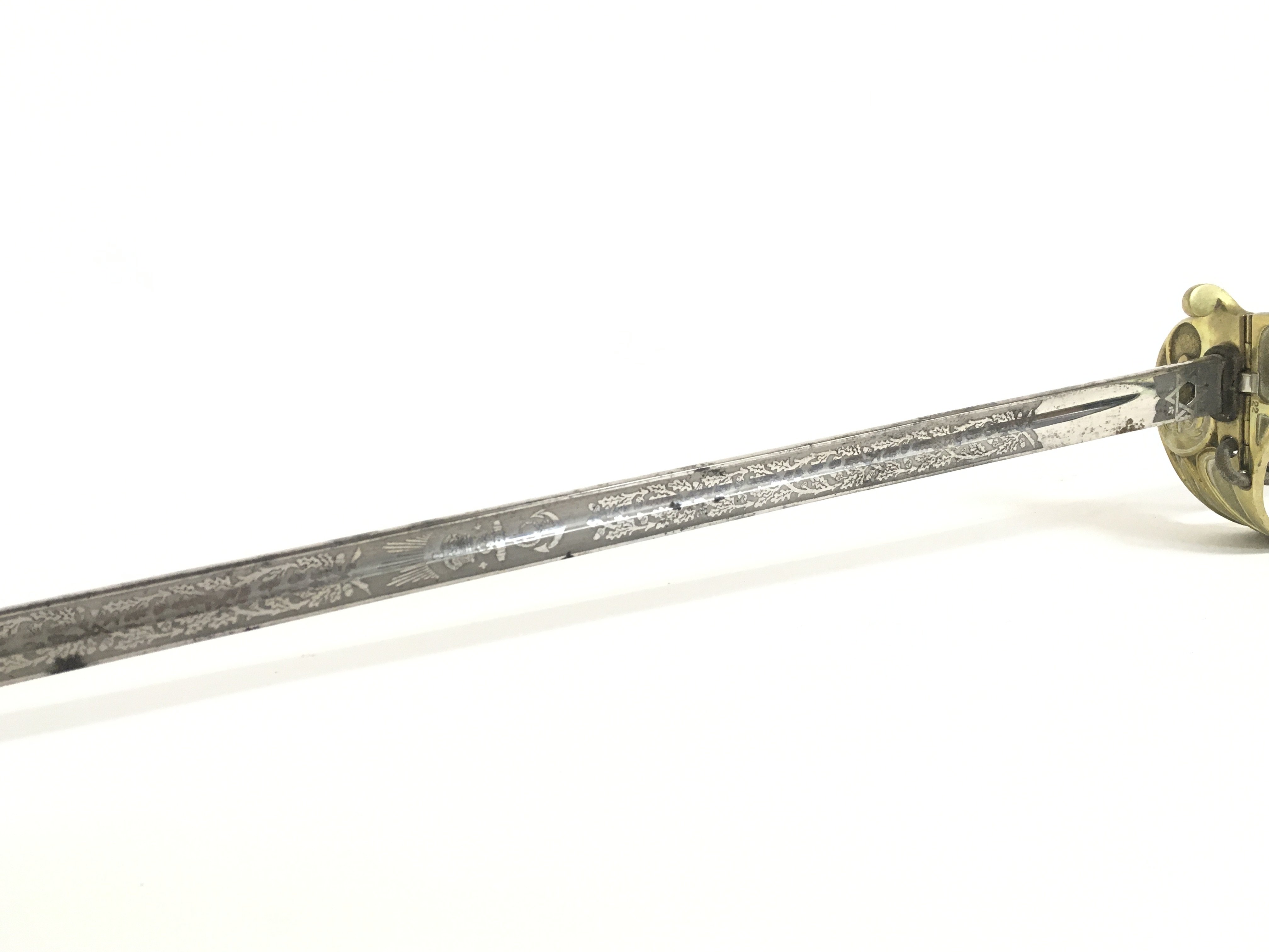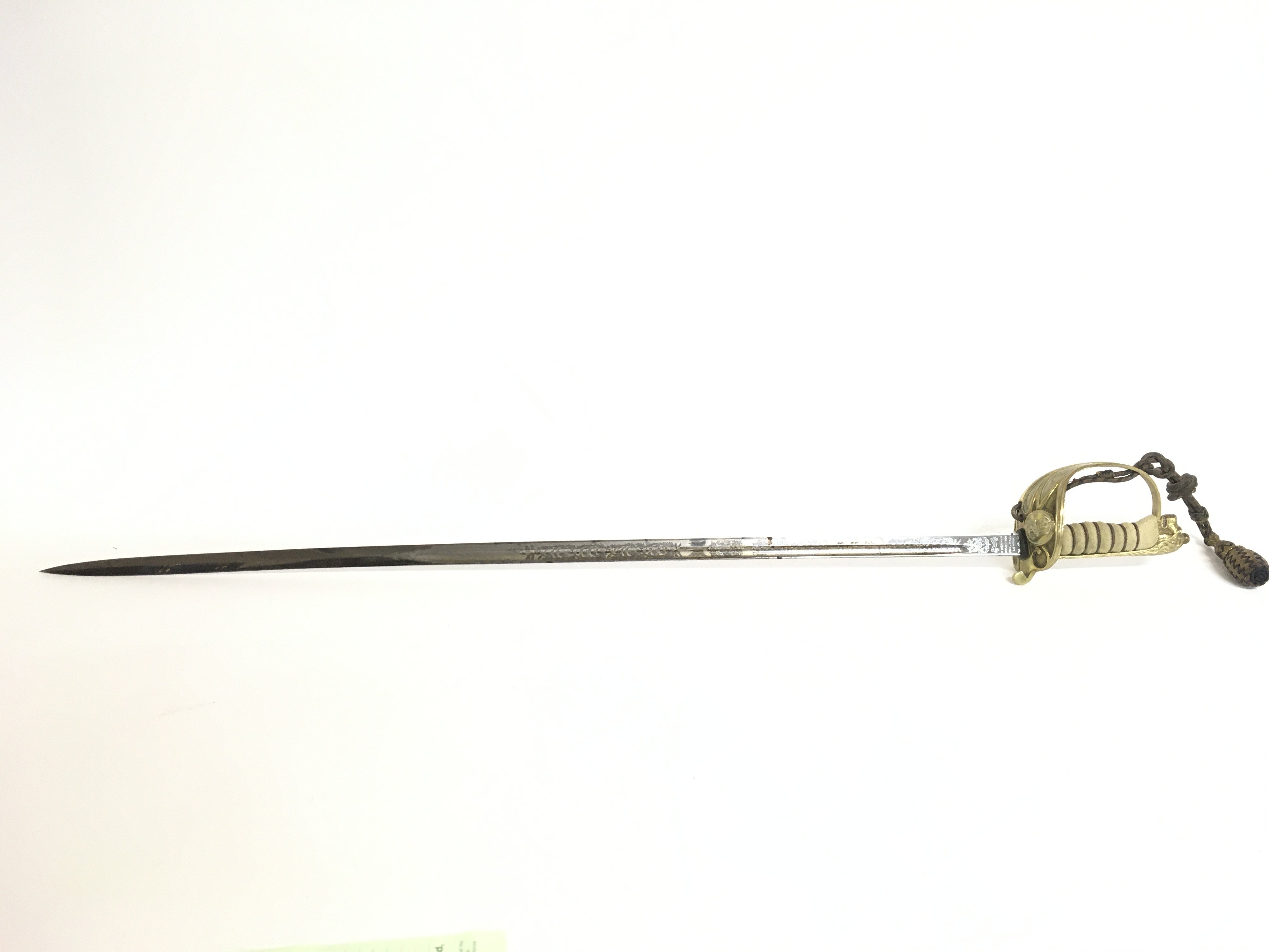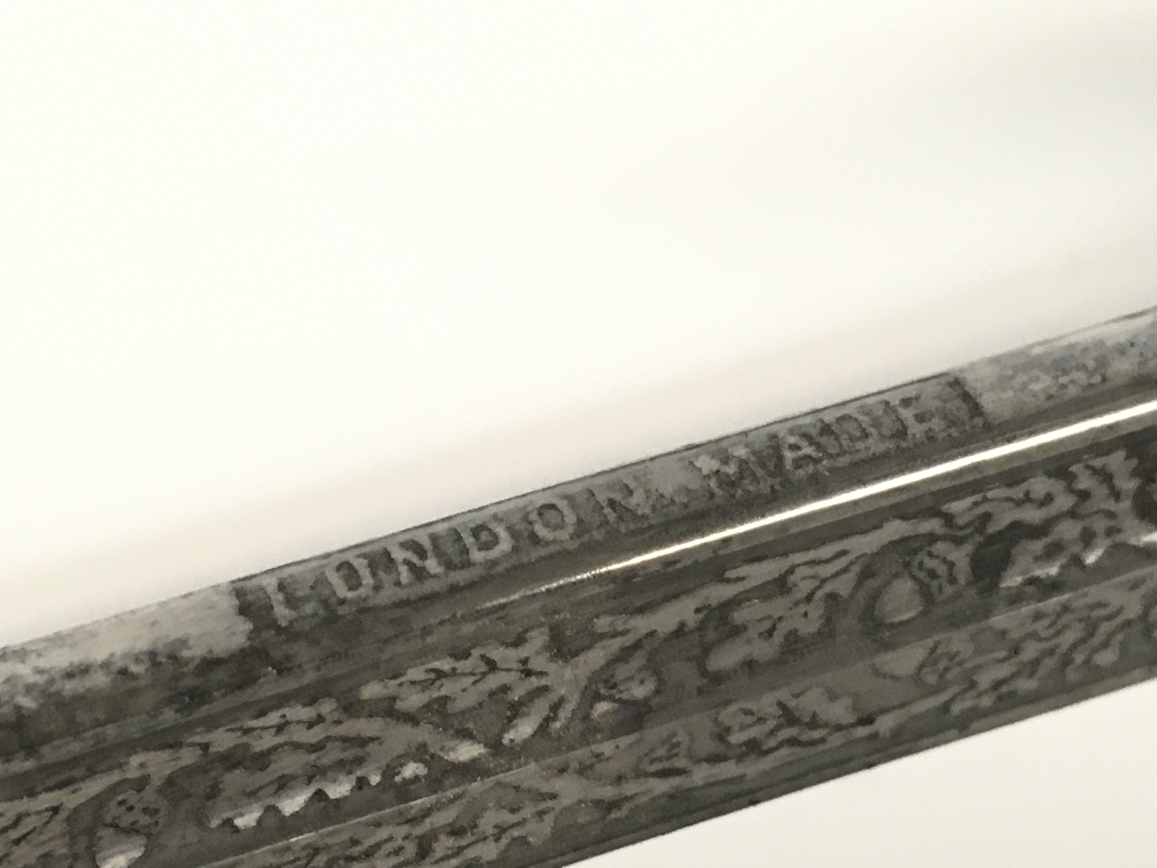 A 19th Century British Naval officers sword with leather scabbard. 32 Inch ornately decorated blade marked London made, C.S.S, Made by Henry Wilkinson Pall Mall London. Hilt features a crown and anchor plaque and lions head pommel. Serial number 56826. This lot cannot be posted