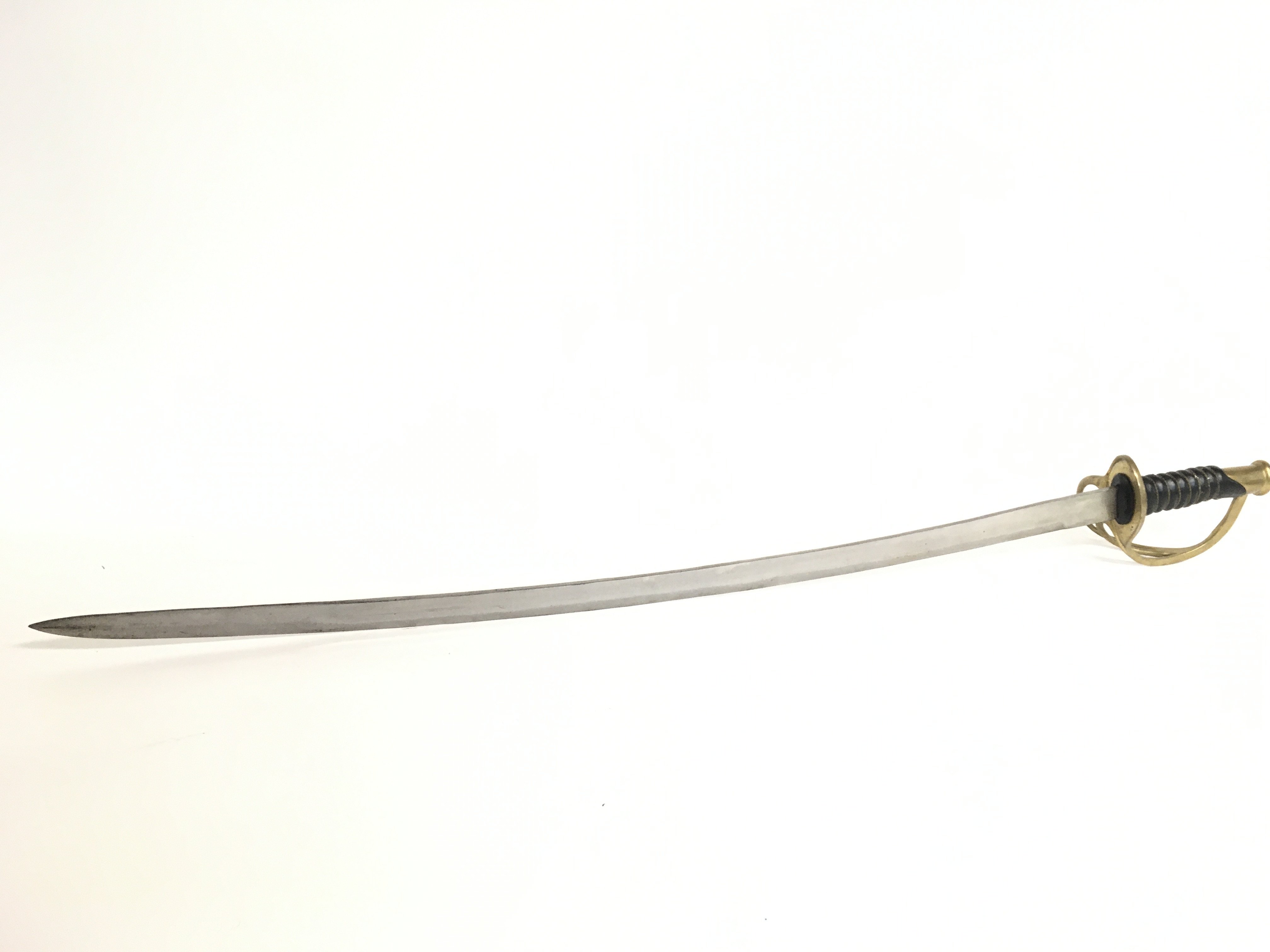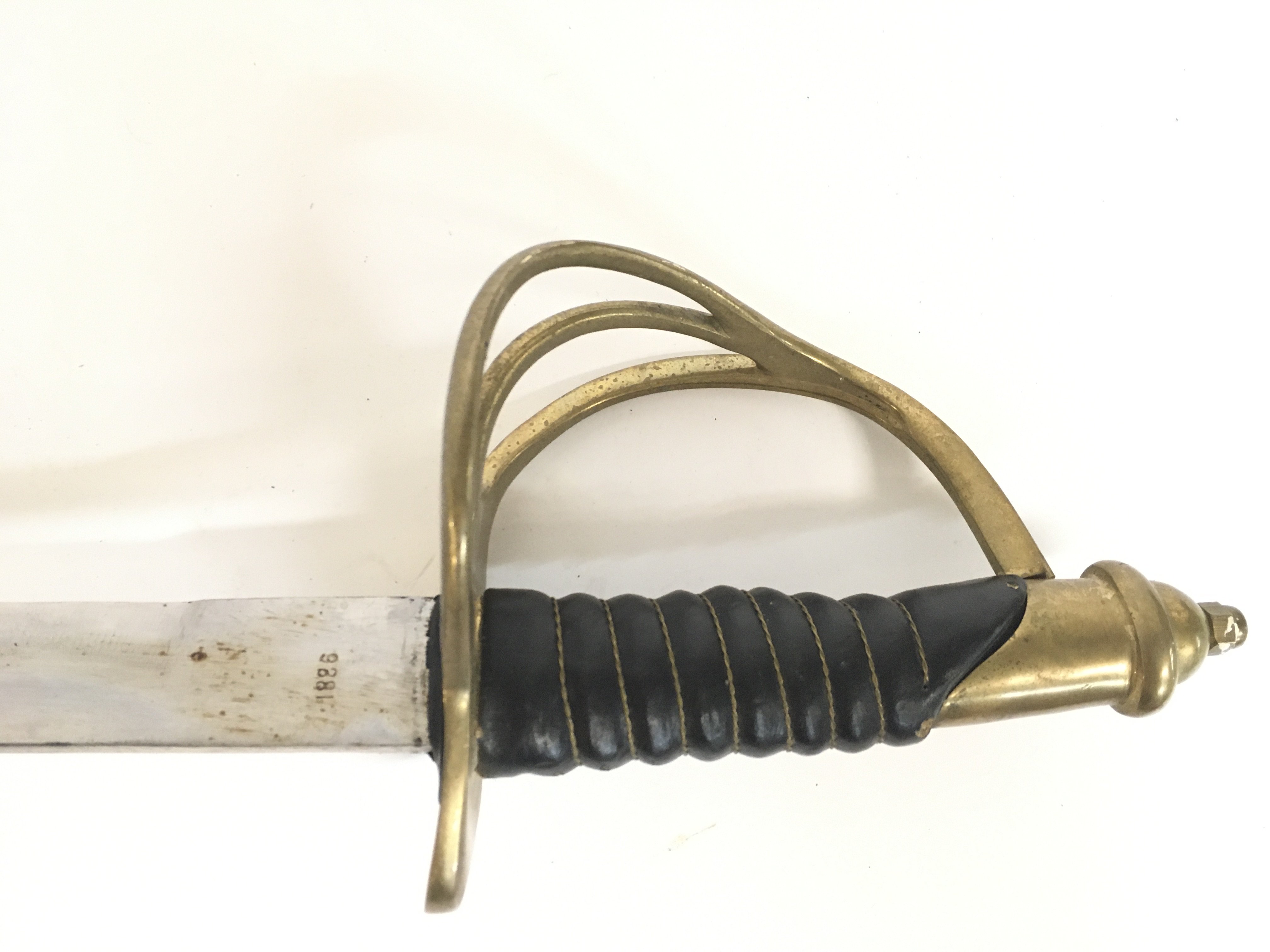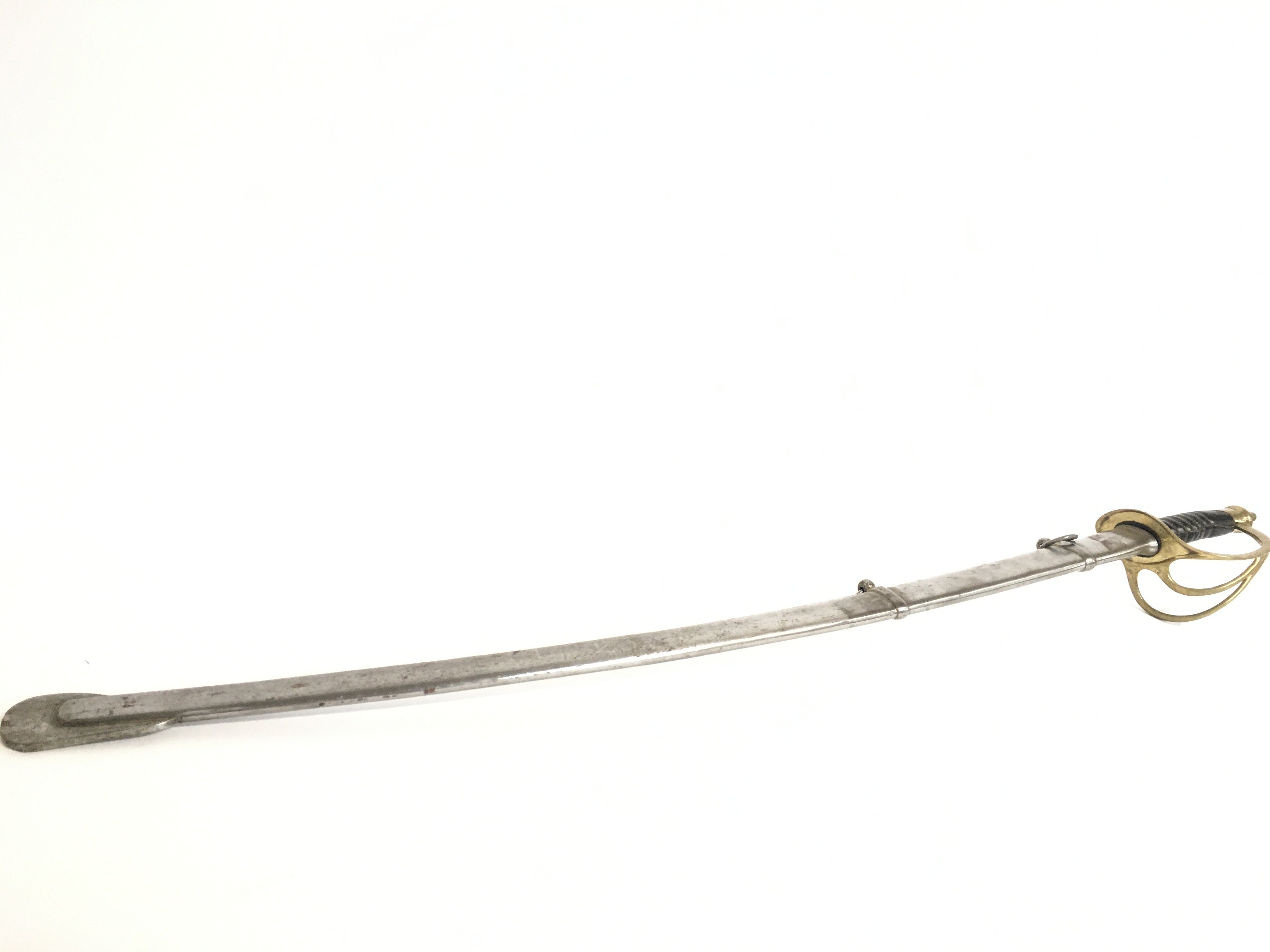 A French Heavy Cavalry sword with an 85cm long blade, leather grip and scabbard. Blade dated 1886. This lot cannot be posted