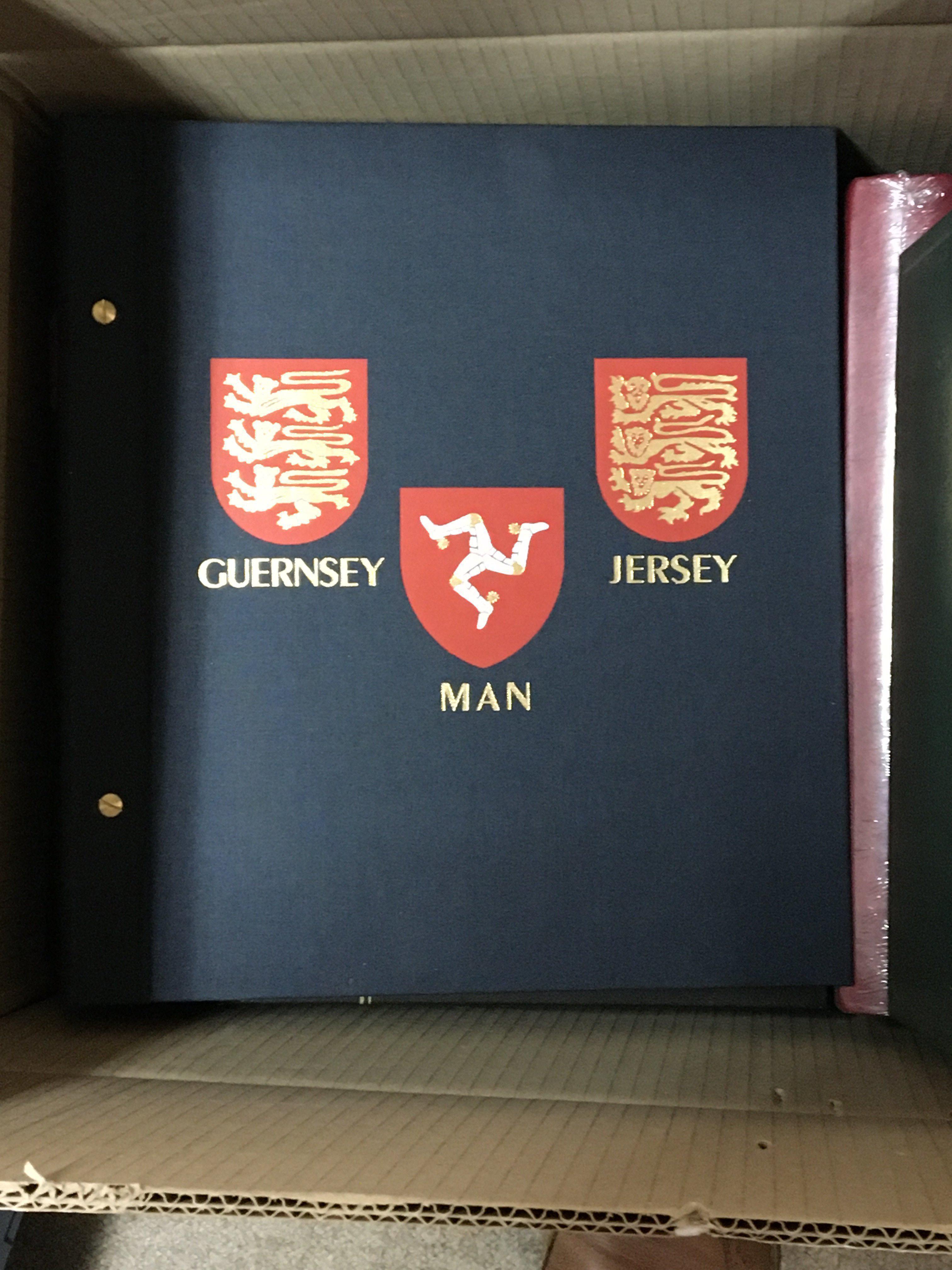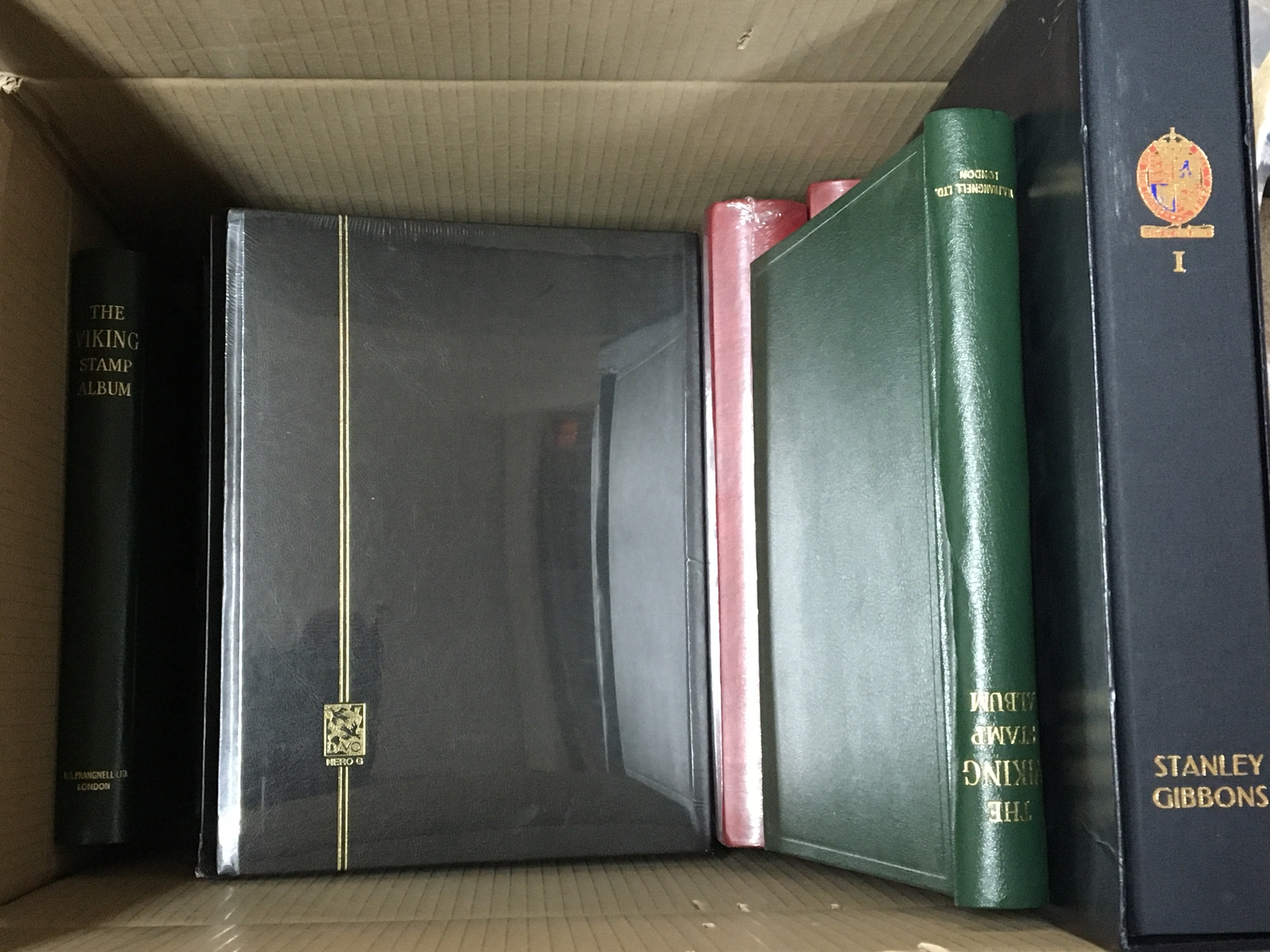 A box containing unused Stamp albums Stanley Gibbons Great Britain A Chanel Island album and many others some still in cellophane. (a lot)