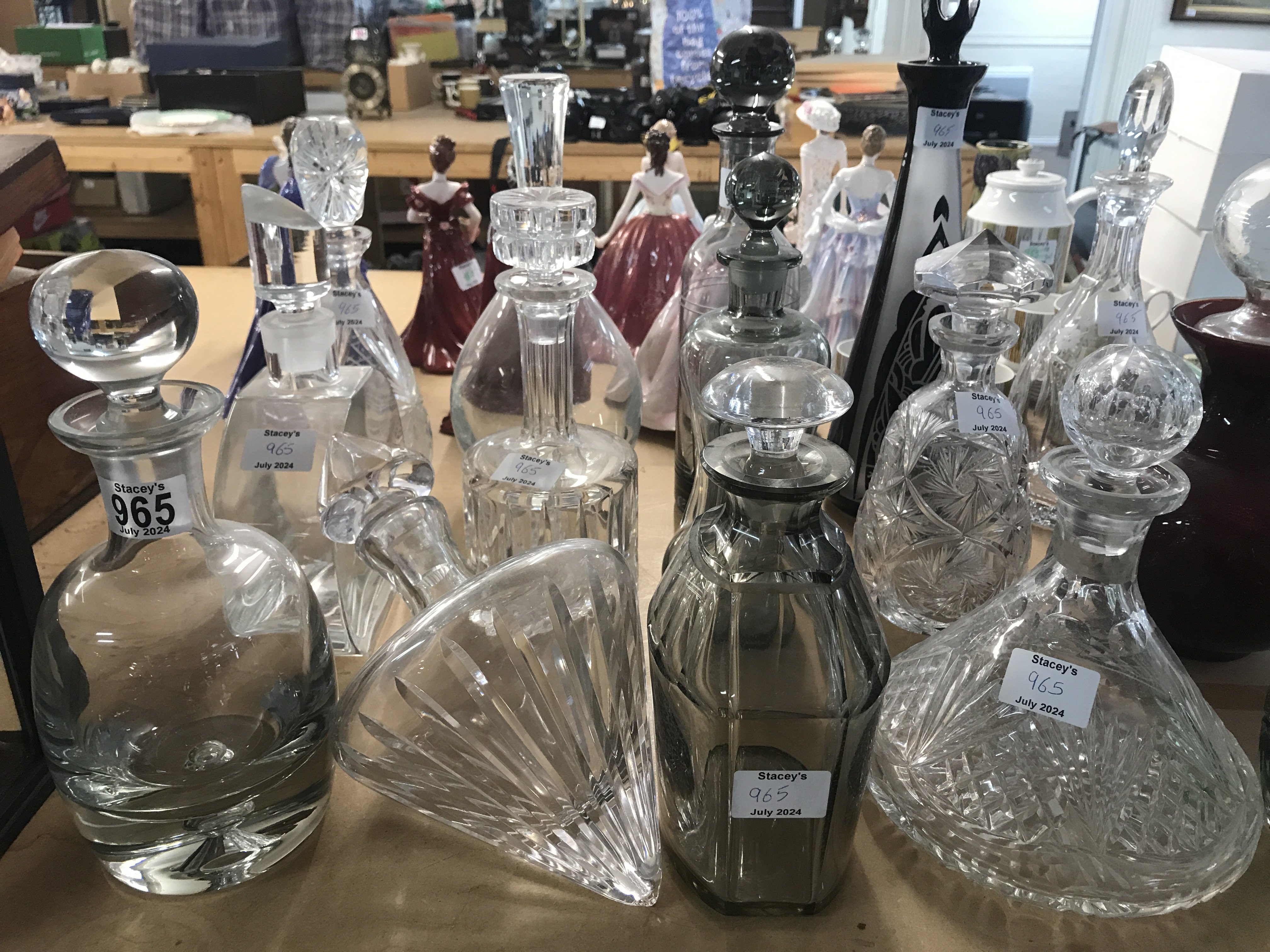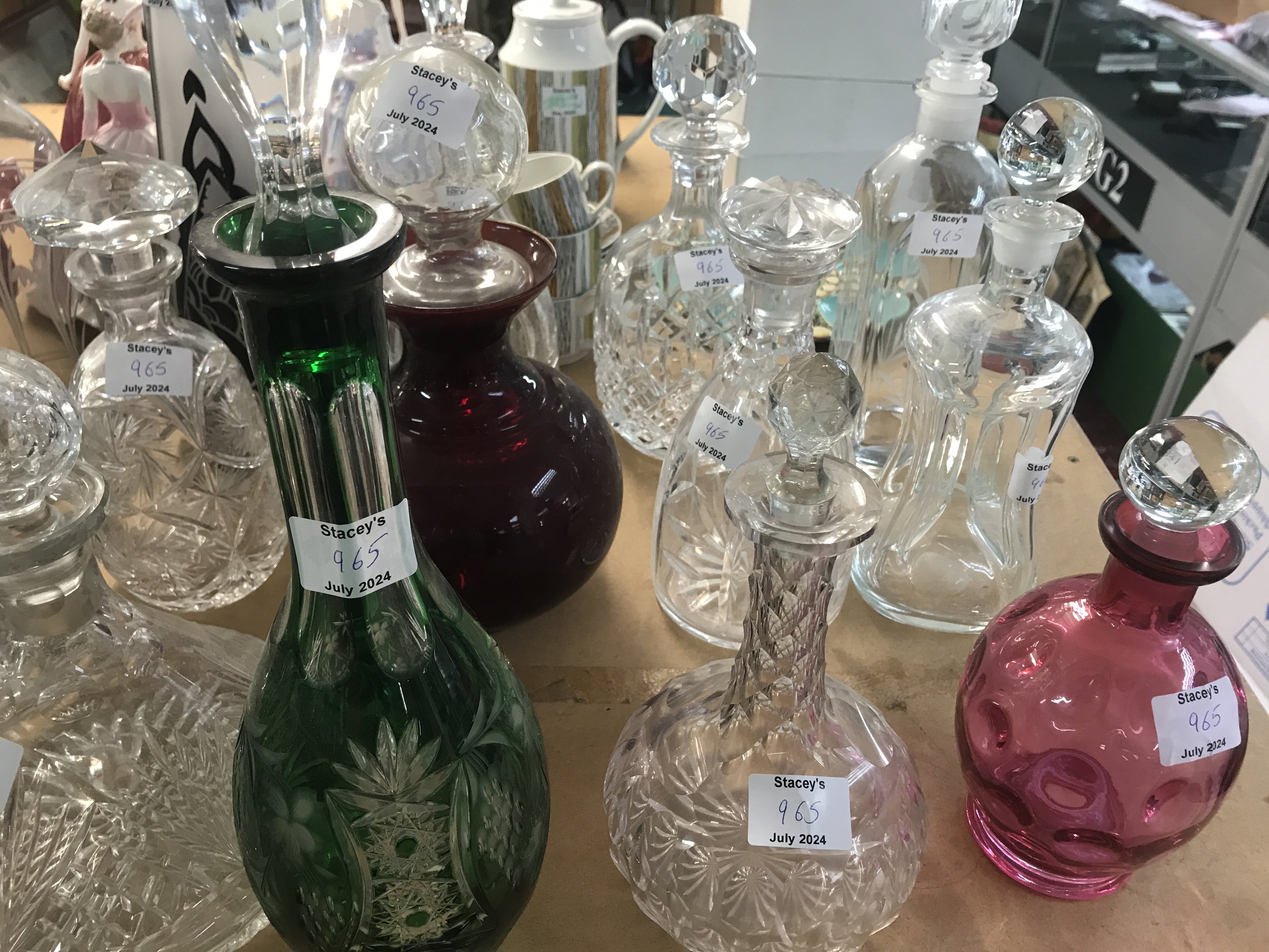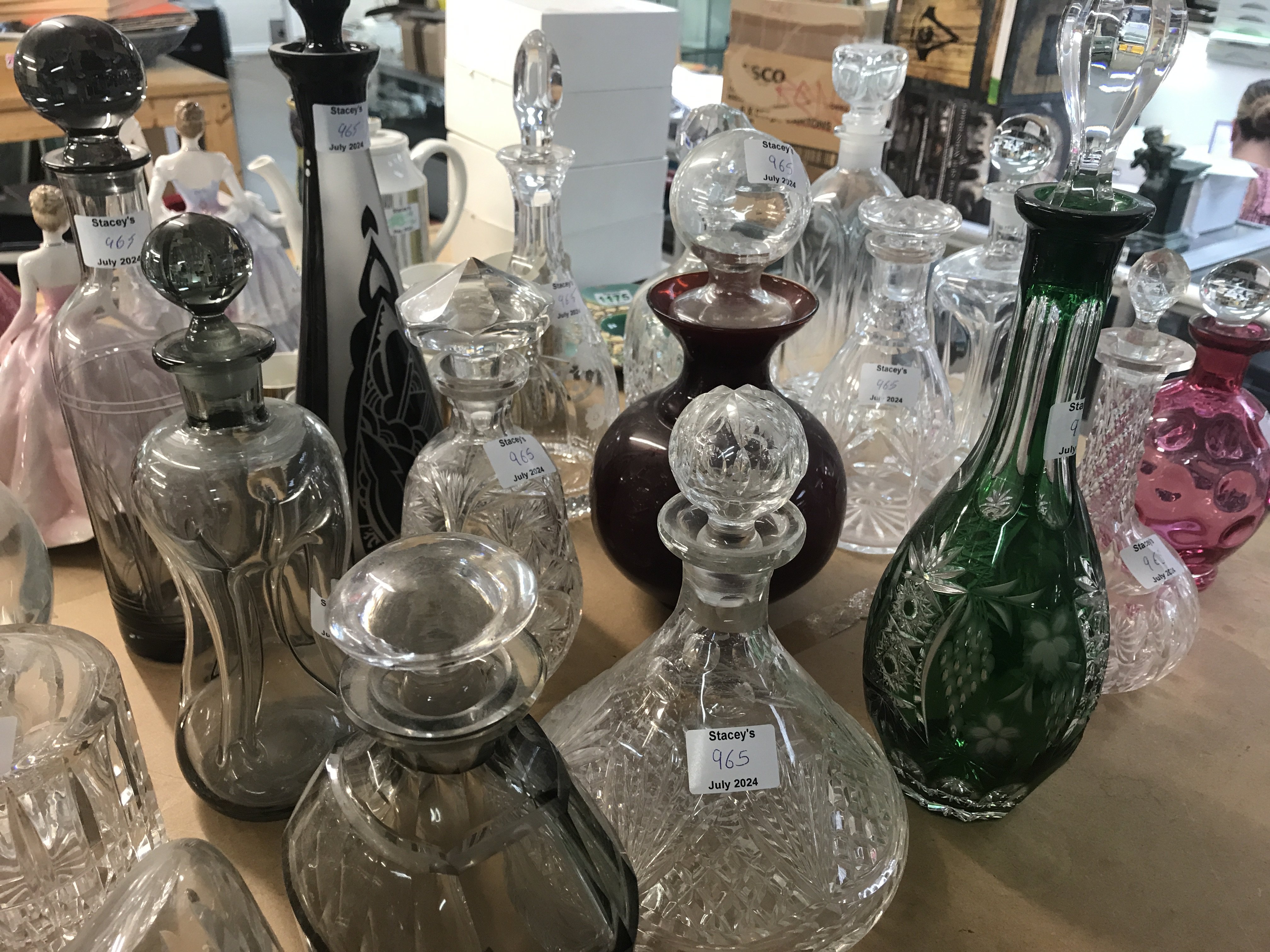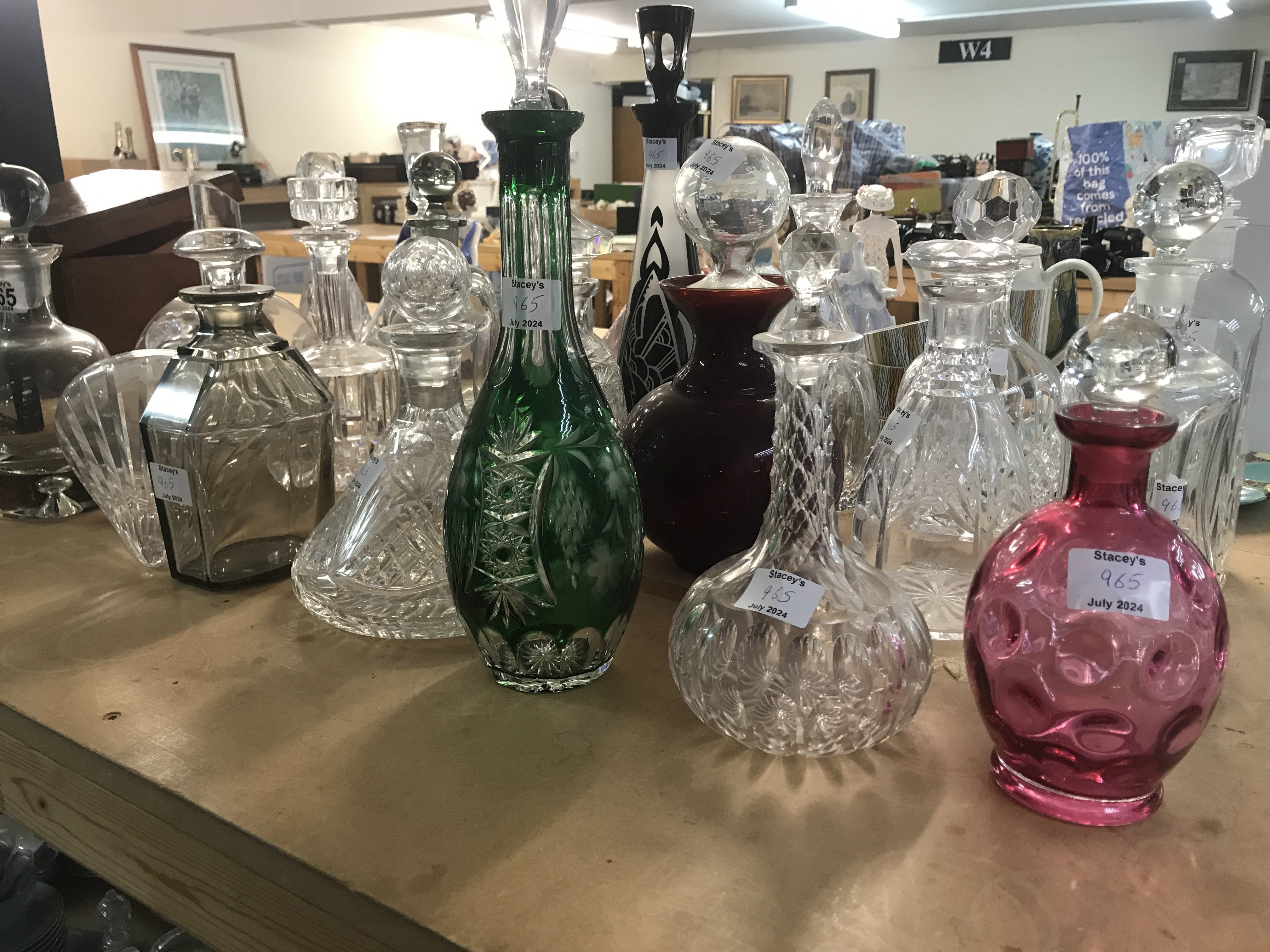 A large collection of mixed decanters including cut glass and coloured glass decanters and more. Approx 21 decanters.