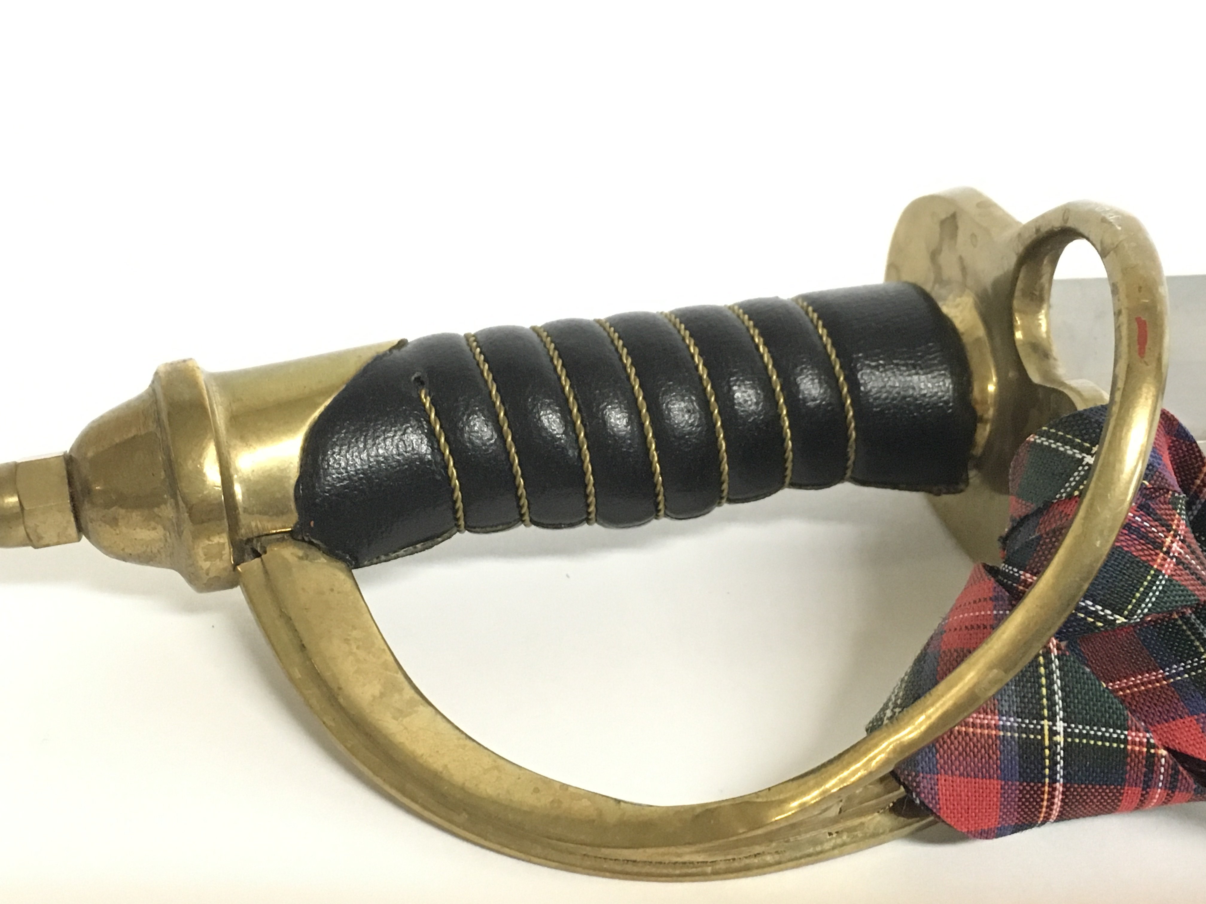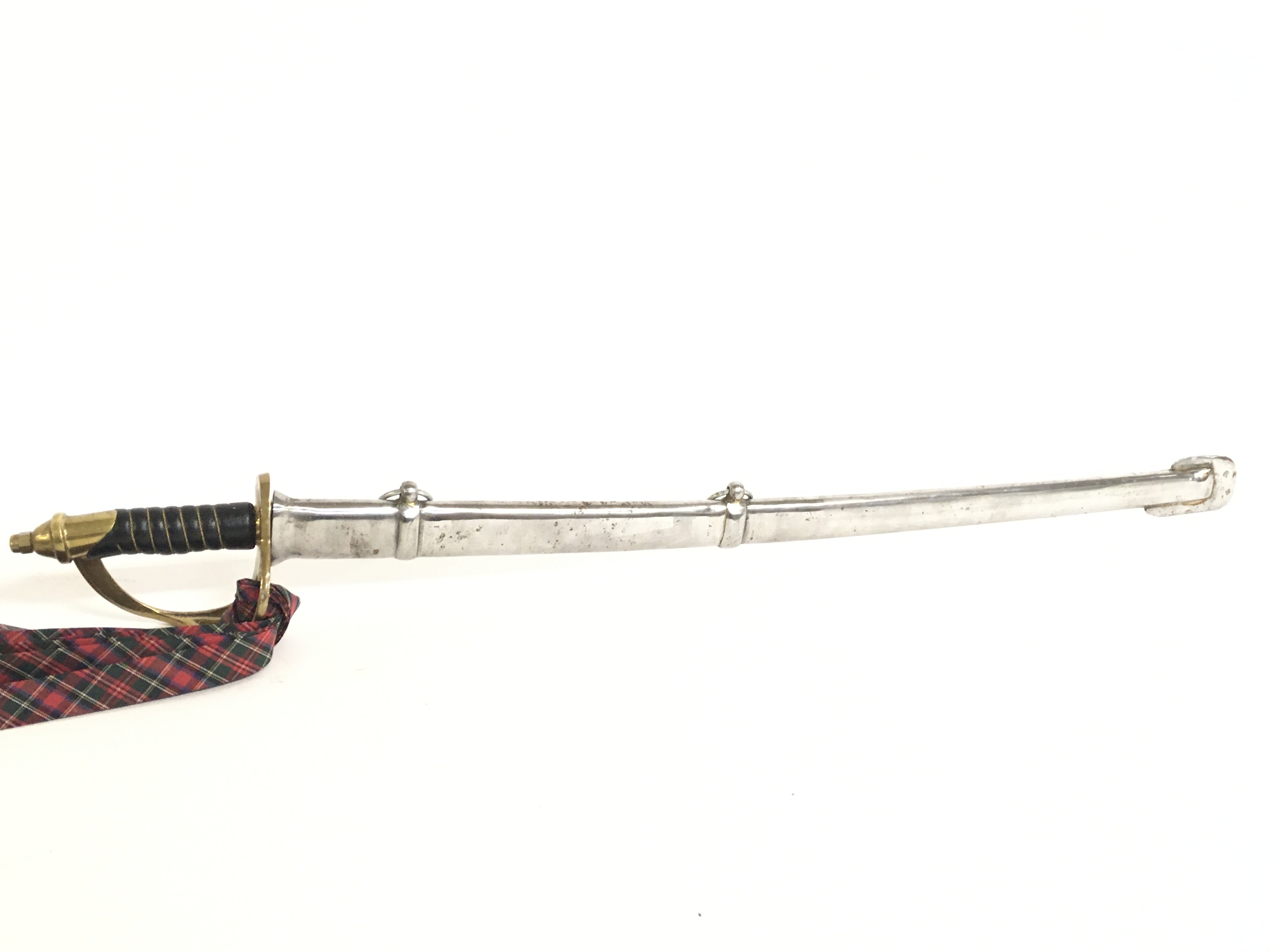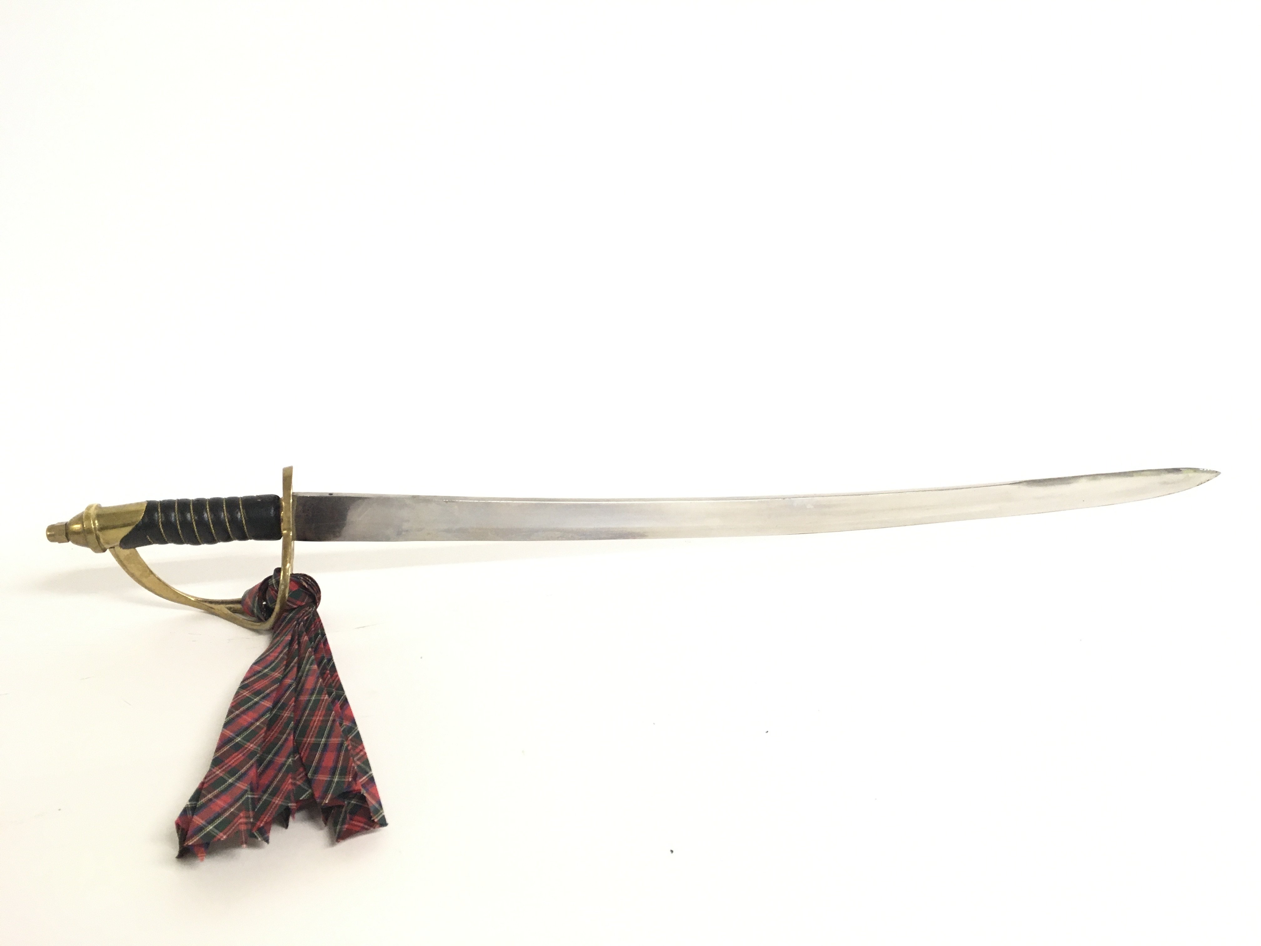A French cavalry sword with a 58cm long blade, leather handle and a leather scabbard. This lot cannot be posted