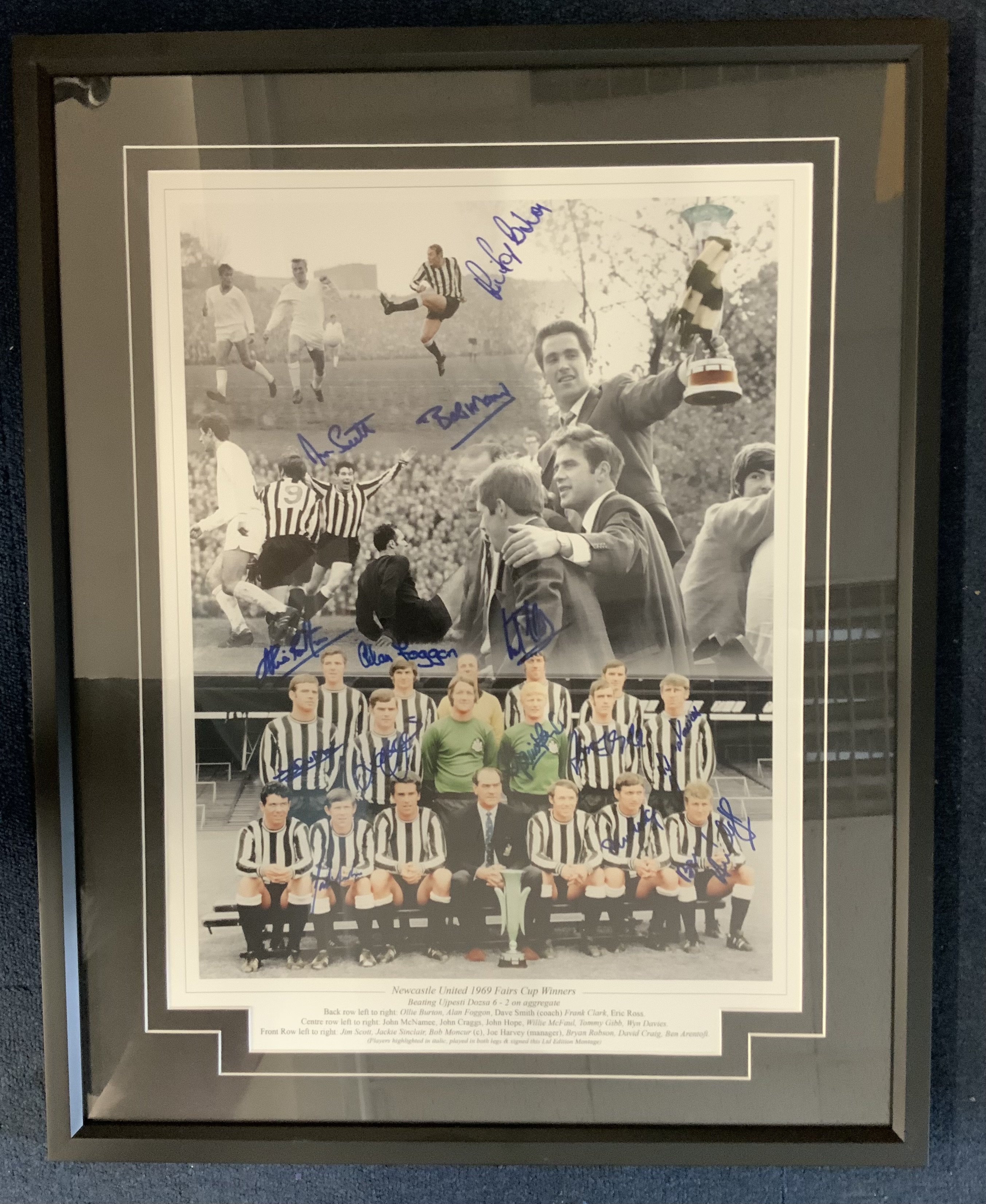 Newcastle United 1969 Fairs Cup Winners Signed Football Print: Superb framed montage signed by 14 players. Professionally framed and not for posting. COA from reputable source with picture proof.