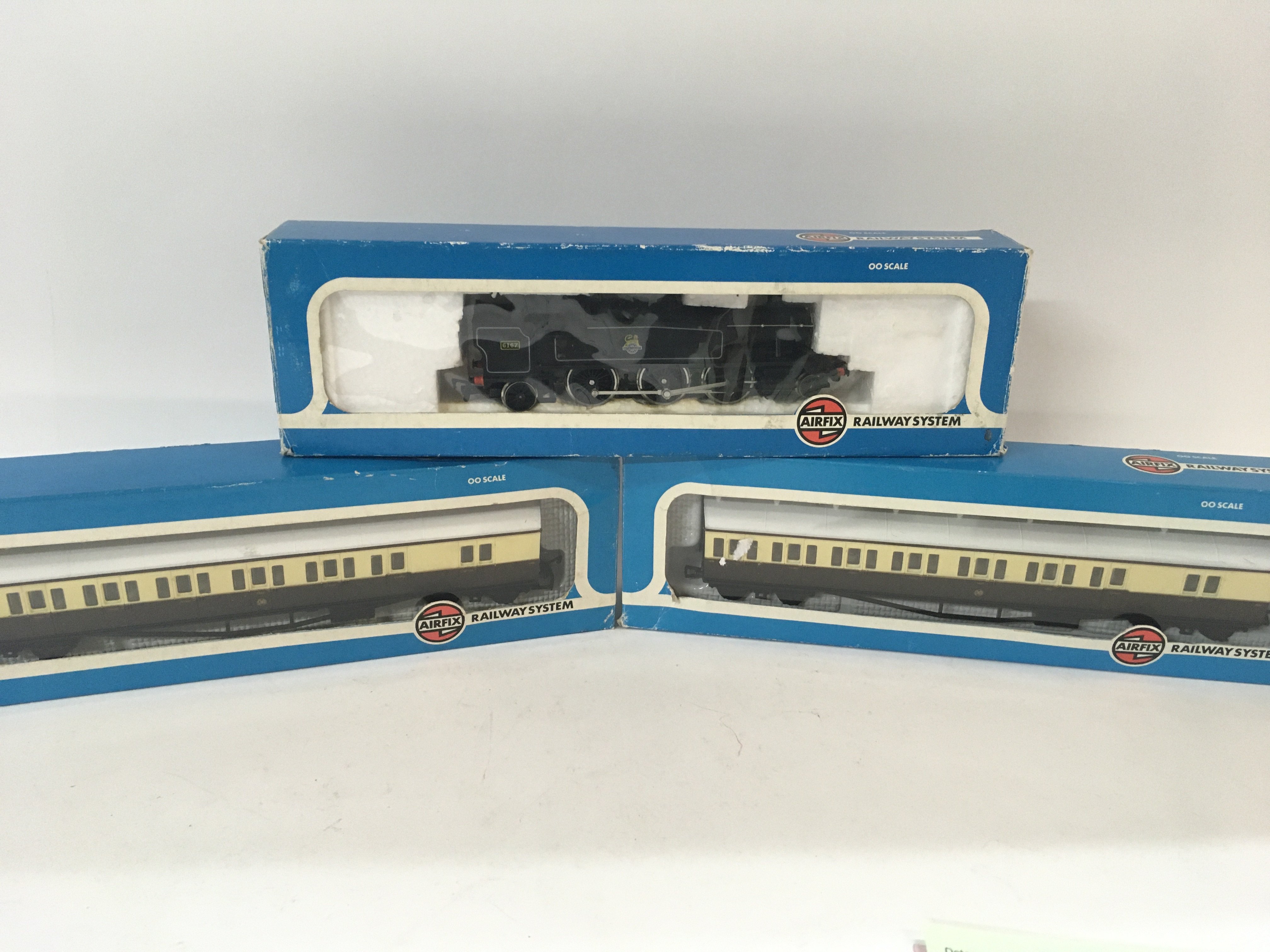 A Boxed 00 Gauge Airfix prairie Tank Locomotive and 2 Coaches.
