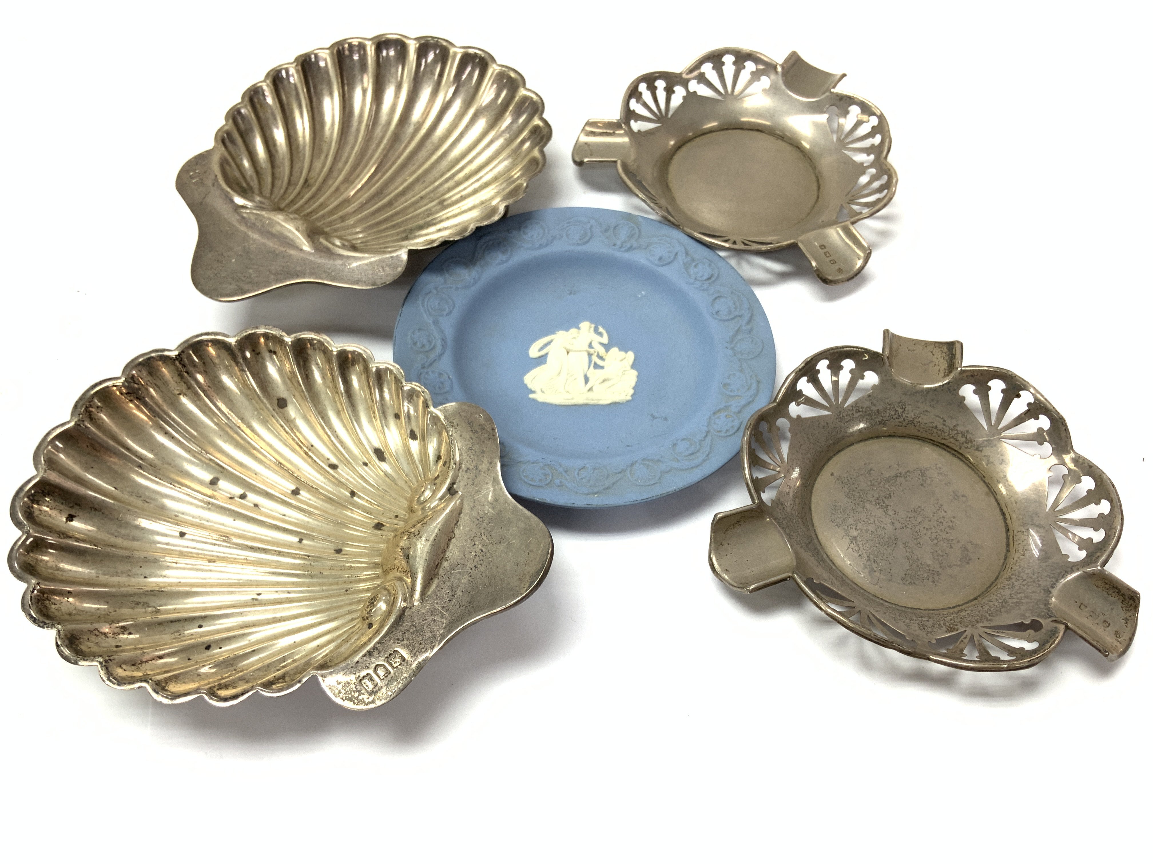 Pair of silver shell dishes and ash trays, one Wedgewood dish. Postage category A.