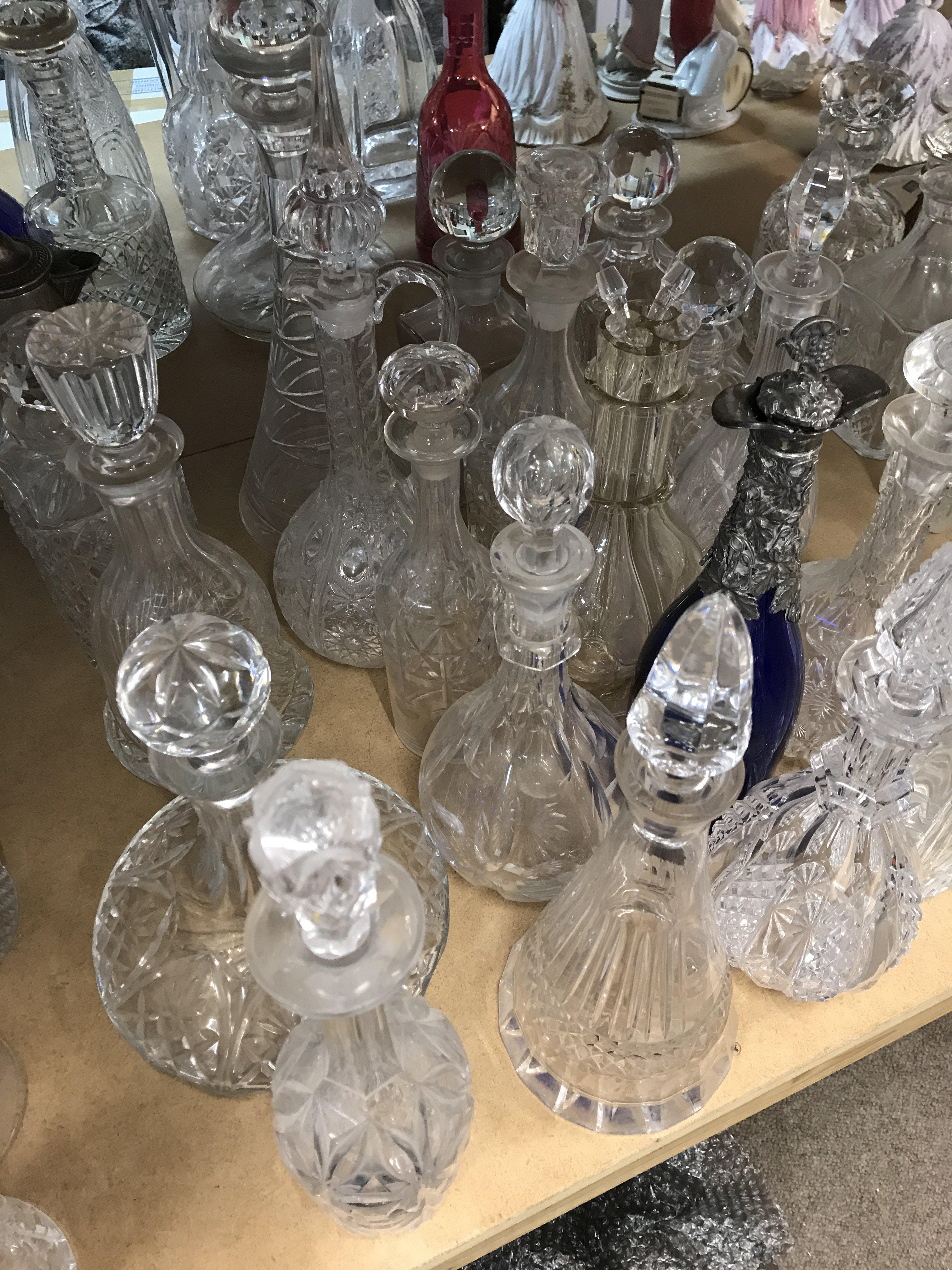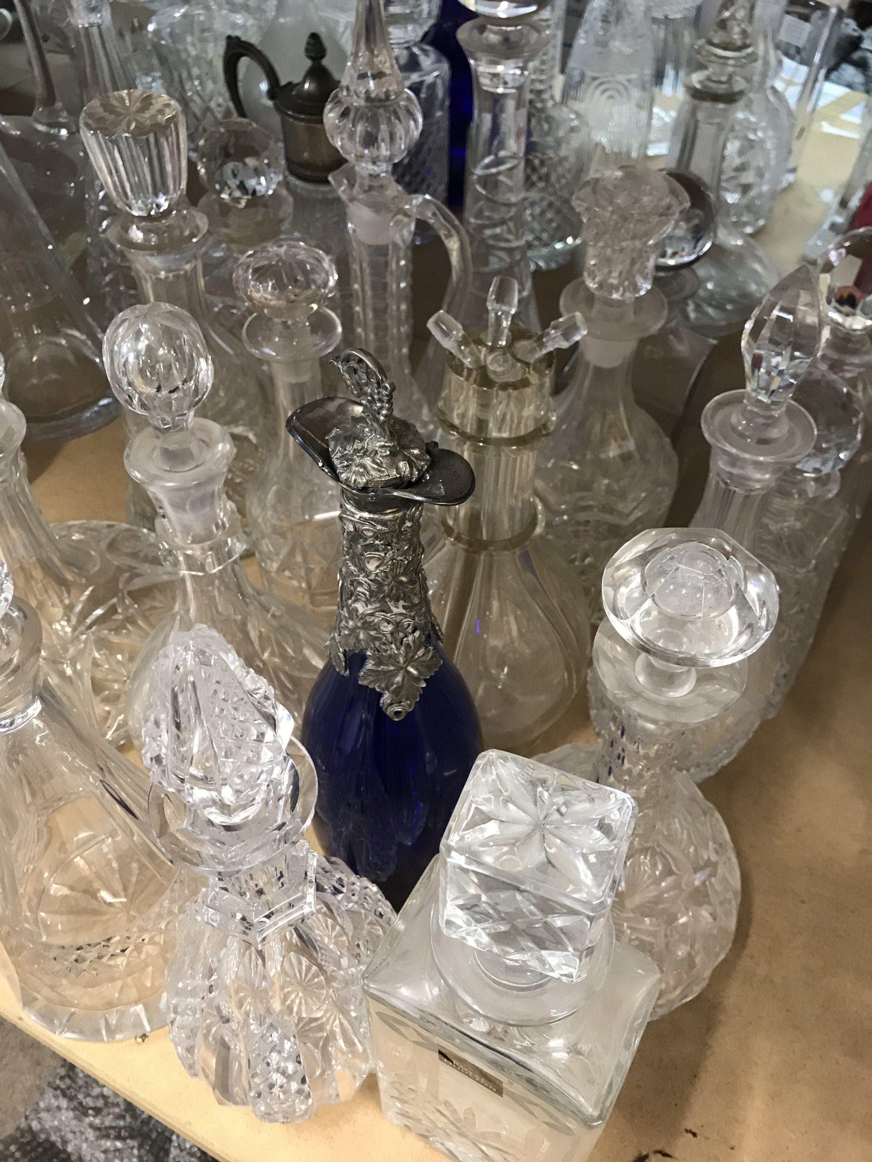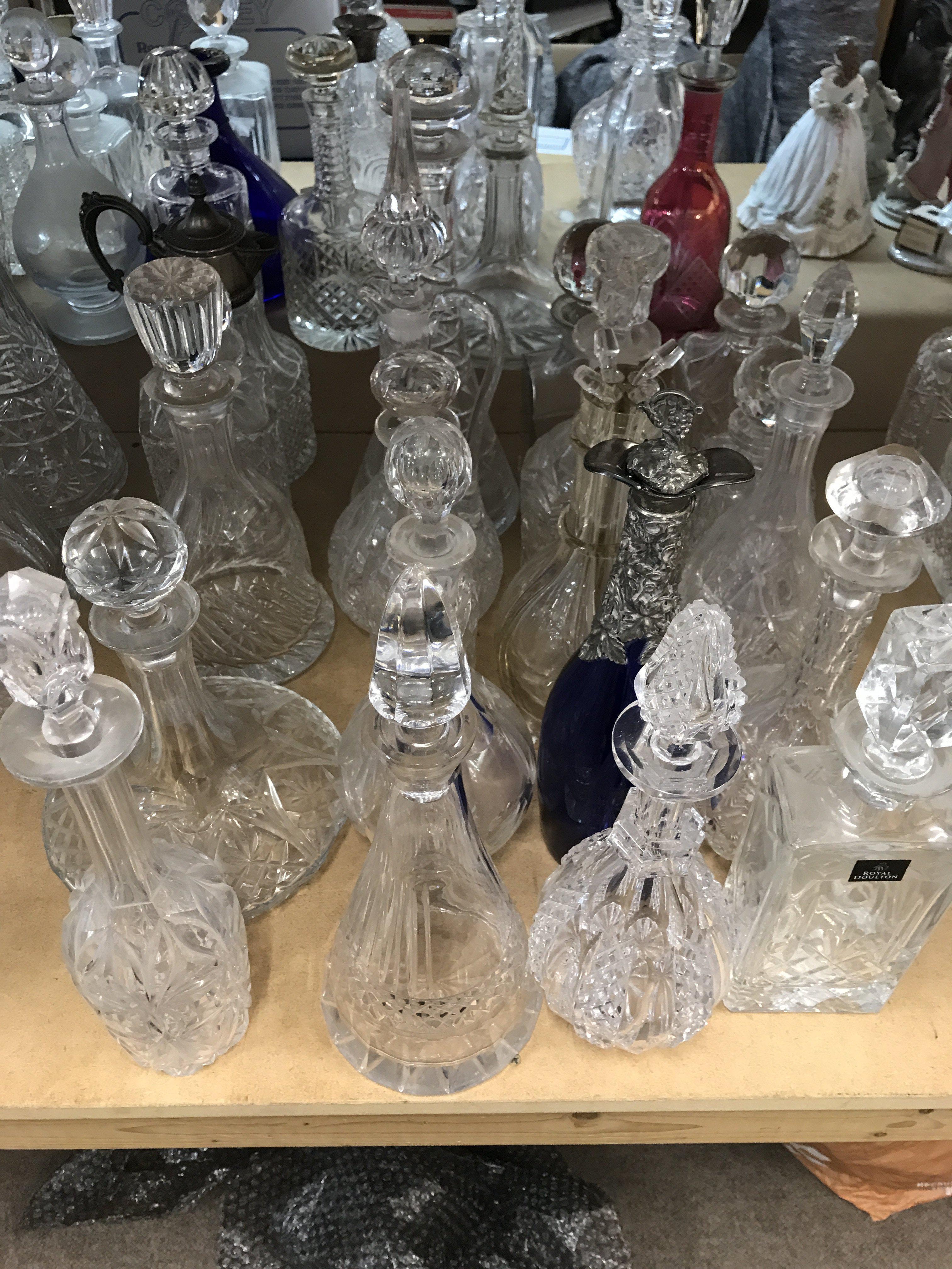 A large collection of decanters including some silver plated and cut glass examples. Approx 20 decanters.