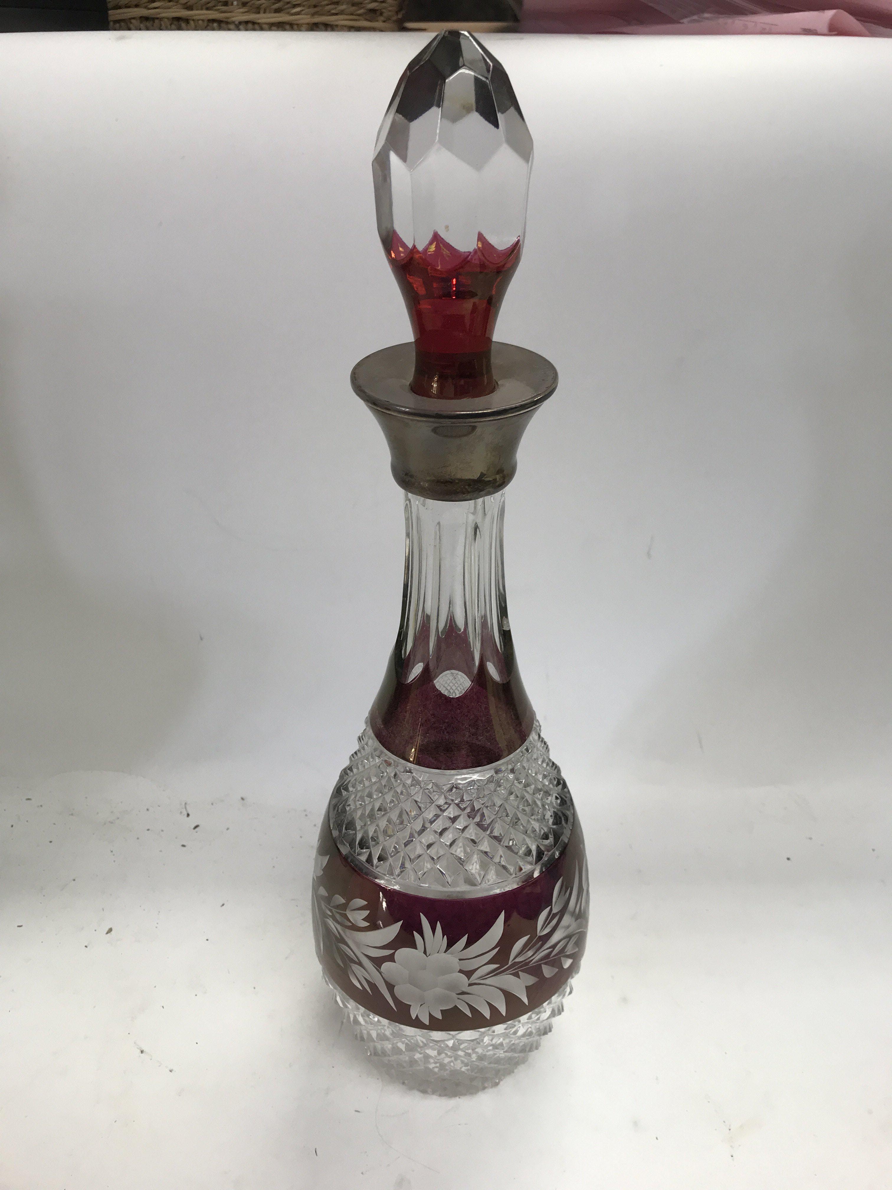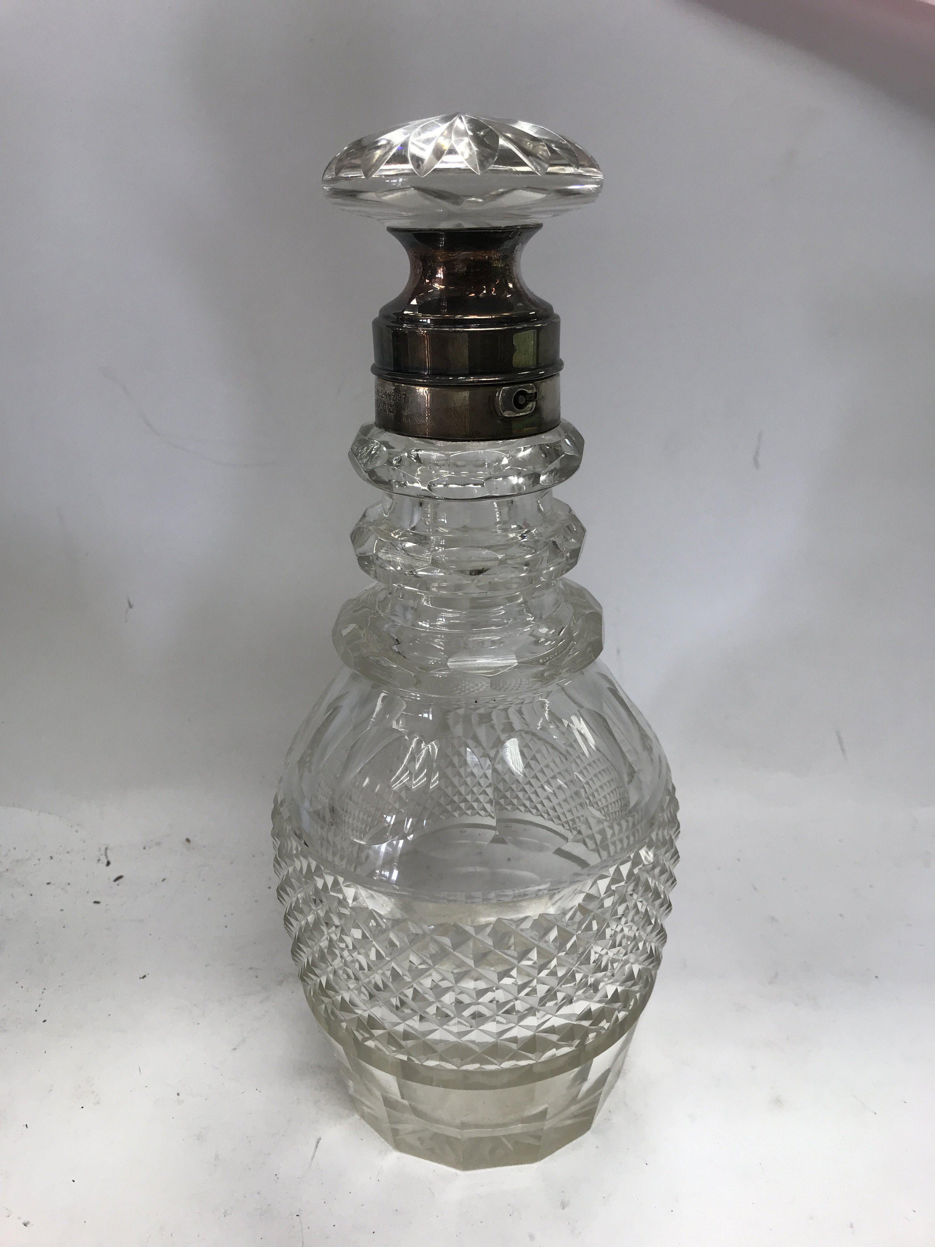An unusual 19th century cut glass silver collared lockable decanter with another fancy cut glass silver collared decanter and two other collared decanters.