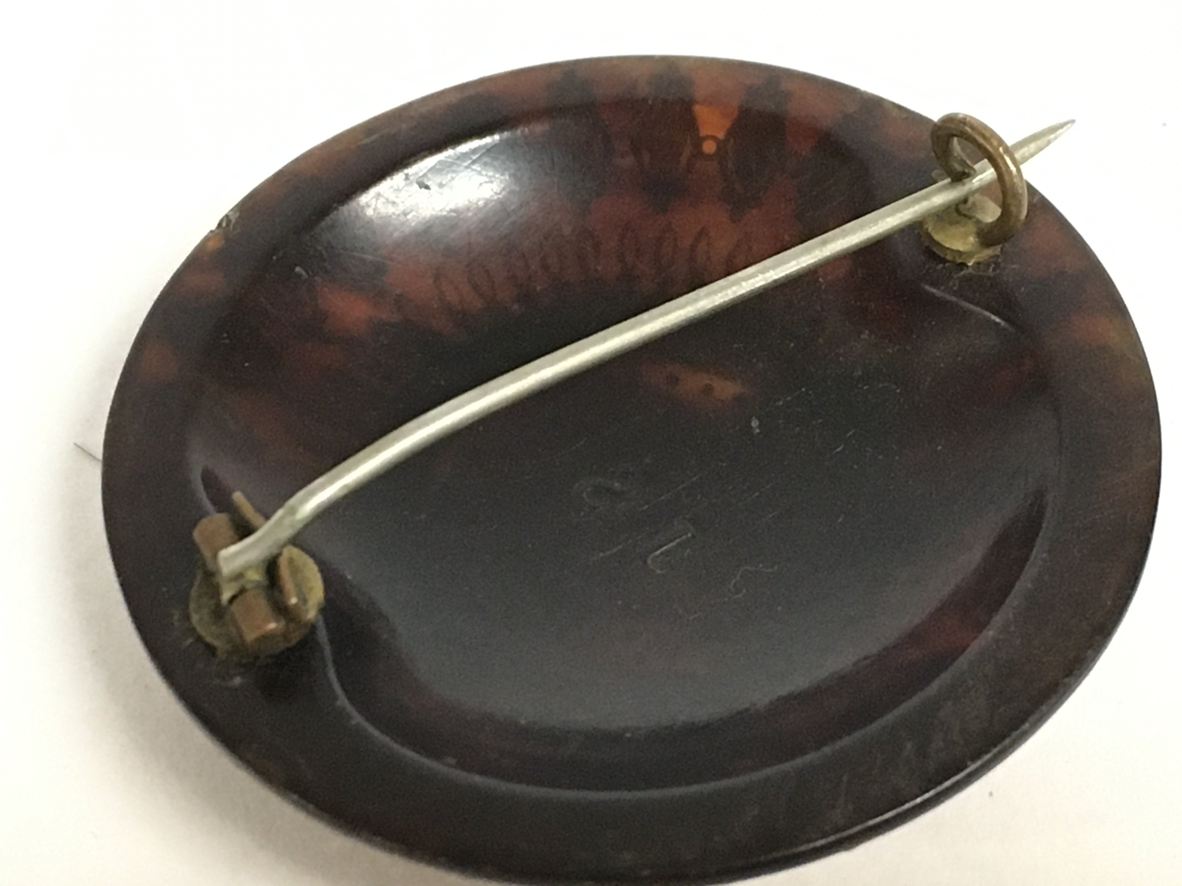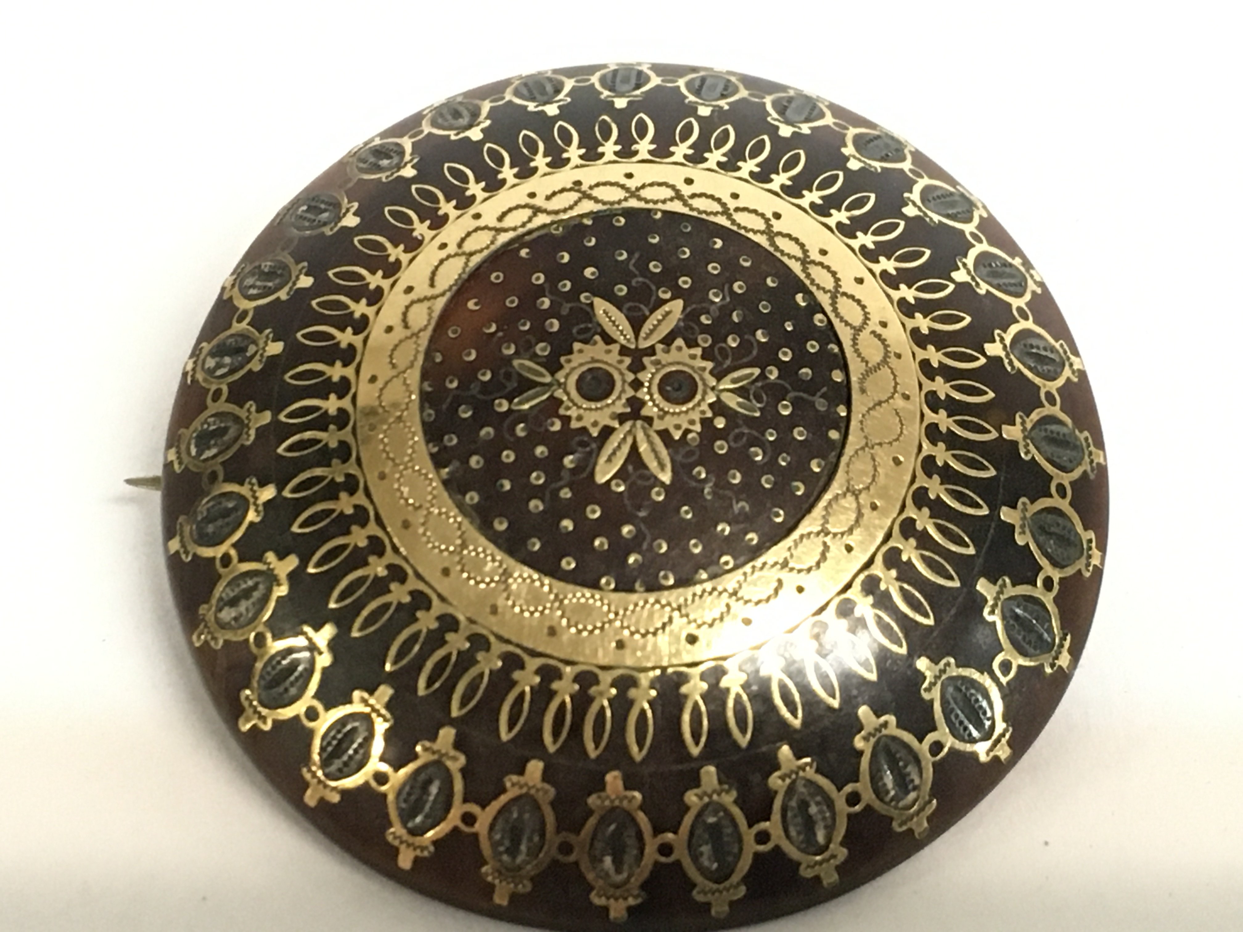 A Victorian tortoiseshell and gold brooch. Postage category a